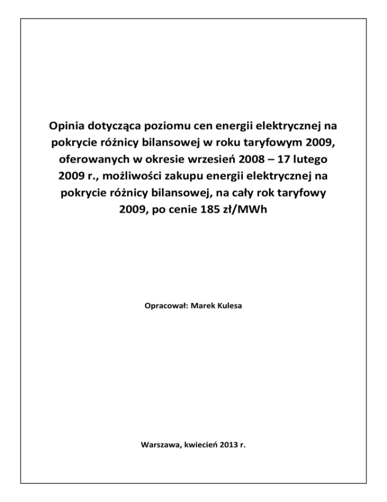 Opinia dotycząca poziomu cen energii elektrycznej na pokrycie różnicy bilansowej w roku taryfowym 2009, oferowanych w okresie wrzesień 2008 – 17 lutego 2009 r., możliwości zakupu energii elektrycznej na pokrycie różnicy bilansowej, na cały rok taryfowy 2009, po cenie 185 zł/MWh Opracował: Marek Kulesa Warszawa, kwiecień 2013 r. Opinia dotycząca poziomu cen energii elektrycznej możliwych do uzyskania na cele pokrycia różnicy bilansowej w roku taryfowym 2009 SPIS TREŚCI: I. Podstawa prawna ................................................................................................................................. 3 II. Materiały źródłowe i dowodowe ........................................................................................................ 3 III. Przedmiot badań ................................................................................................................................ 3 III.1 Analiza stosowanych praktyk i procedur przy dokonywaniu zakupów energii elektrycznej na pokrycie różnic bilansowych ............................................................................................................ 5 III.2. Określenie poziomu średnich kosztów wytwarzania energii elektrycznej w elektrowniach cieplnych .......................................................................................................................................... 8 III.3 Analiza cenowa notowań transakcji sprzedażowych energii elektrycznej .................................... 13 III.4 Analiza płynności dostępnych na giełdach i platformach brokerskich wolumenów ..................... 20 III.5 Analiza wolumetryczno-cenowa potencjalnie dostępnej energii, będącej w portfelach wytwórczych i spekulacyjnych spółek obrotu ............................................................................... 21 III.6 Podsumowanie analiz .................................................................................................................... 24 Marek Kulesa, Warszawa, kwiecień 2013 2 Opinia dotycząca poziomu cen energii elektrycznej możliwych do uzyskania na cele pokrycia różnicy bilansowej w roku taryfowym 2009 I. Podstawa prawna Podstawą prawną opracowania niniejszej opinii jest postanowienie Sądu Okręgowego w Warszawie – Sądu Ochrony Konkurencji i Konsumentów z dnia 10 stycznia 2013 r. obligujące biegłego do opracowania opinii na okoliczność ustalenia: (i) poziomu cen energii elektrycznej na pokrycie różnicy bilansowej w roku taryfowym 2009, oferowanych w okresie wrzesień 2008 – 17 lutego 2009, (ii) możliwości zakupu energii elektrycznej na pokrycie różnicy bilansowej na rok taryfowy 2009, po cenie 185 zł/MWh. II. Materiały źródłowe i dowodowe Materiał dowodowy, na bazie którego przeprowadzona została przedmiotowa analiza oraz sporządzona została niniejsza opinia stanowią: [1] Otrzymane w dniu 22 stycznia 2013 r. akta sprawy o sygn. XVII AmE 78/12 (3 tomy akt oraz 2 segregatory załączników); [2] Sytuacja Techniczno-Ekonomiczna Sektora Elektroenergetycznego. IV kwartały 2007; Raport ARE, Warszawa, marzec 2008; [3] Sytuacja Techniczno-Ekonomiczna Sektora Elektroenergetycznego. IV kwartały 2008; Raport ARE, Warszawa, marzec 2009; [4] Sytuacja Techniczno-Ekonomiczna Sektora Elektroenergetycznego. IV kwartały 2009; Raport ARE, Warszawa, marzec 2010; [5] Dane rynkowe dotyczące cen energii elektrycznej w kontraktach terminowych na 2009 rok notowanych w okresie września 2008 r. do 17 lutego 2009 r. III. Przedmiot badań Podstawowym przedmiotem badań jest analiza sytuacji cenowej oraz dostępności energii elektrycznej na rynku energii w Polsce w okresie od 1 września 2008 r. do 17 lutego 2009 r. zarówno w zakresie kontraktów typu BASE, jak i PEAK z dostawą w 2009 r. Analiza oparta jest w głównej mierze na analizie transakcji zawartych na rynku terminowym Towarowej Giełdy Energii SA oraz platformach brokerskich TFS i GFI. Dla celów porównawczych przenalizowano również sytuację cenowo-wolumetryczną na rynku kontraktów natychmiastowych typu SPOT. Dopełnieniem niniejszej analizy są zestawienia statystyczne kierunków zakupu i sprzedaży energii elektrycznej z punktu widzenia przedsiębiorstw obrotu energią elektryczną wykonane na podstawie danych publikowanych przez Agencję Rynku Energii SA oraz podsumowań dokonywanych corocznie przez Prezesa URE w sprawozdania rocznych. Marek Kulesa, Warszawa, kwiecień 2013 3 Opinia dotycząca poziomu cen energii elektrycznej możliwych do uzyskania na cele pokrycia różnicy bilansowej w roku taryfowym 2009 Realizacja zakupu energii elektrycznej na potrzeby różnic bilansowych musi być dokonywana z zachowaniem zasad, wynikających z art. 9c ust 3 ustawy Prawo energetyczne1, który brzmi: „Operator systemu dystrybucyjnego lub systemu połączonego elektroenergetycznego w zakresie systemów dystrybucyjnych, stosując obiektywne i przejrzyste zasady zapewniające równe traktowanie użytkowników tych systemów oraz uwzględniając wymogi ochrony środowiska, jest odpowiedzialny za: (…) 8) zakup energii elektrycznej w celu pokrywania strat powstałych w sieci dystrybucyjnej podczas dystrybucji energii elektrycznej tą siecią oraz stosowanie przejrzystych i niedyskryminacyjnych procedur rynkowych przy zakupie tej energii; Zarówno zapisy ustawy Prawo energetyczne, jak i Instrukcji Ruchu i Eksploatacji Sieci Dystrybucyjnej danego Operatora nie określają trybu, formy produktowej, momentu w czasie, ani sposobu realizacji przedmiotowego zakupu. To w gestii zainteresowanego przedsiębiorstwa jest stworzenie wewnętrznych procedur, regulacji i norm postępowania przy tego rodzaju czynnościach. Proces ten wydaje się być szczególnie istotny w kontekście klasyfikacji kosztów zakupu energii elektrycznej na pokrycie różnic bilansowych w enumeratywnym katalogu kosztów uzasadnionych, uwzględnianych w składanych organowi regulacyjnemu, wnioskach taryfow