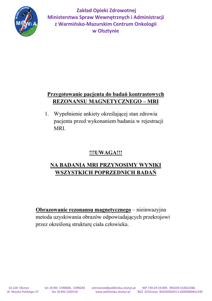 Zakład Opieki Zdrowotnej isterstwa Spraw Wewnętrznych i Administracji Ministerstwa z Warmińsko-Mazurskim Mazurskim Centrum Onkologii w Olsztynie Przygotowanie pacjenta do badań kontrastowych REZONANSU MAGNETYCZNEGO – MRI 1. Wypełnienie ankiety określającej cej stan zdrowia pacjenta przed wykonaniem badania w rejestracji MRI. !!!UWAGA!!! NA BADANIA MRI PRZYNOSIMY WYNIKI WSZYSTKICH POPRZEDNICH BADAŃ Obrazowanie rezonansu magnetycznego – nieinwazyjna metoda uzyskiwania obrazów odpowiadających cych przekrojowi przez określoną strukturę ciała człowieka. 10-228 Olsztyn Al. Wojska Polskiego 37 tel. (0-89) 5398000, 5398240 fax. (0-89) 89) 5269156 [email protected] NIP 739--29-54-895 REGON 510022366 www.poliklinika.olsztyn.pl BGŻ O/Olsztyn 90203000451110000000441290