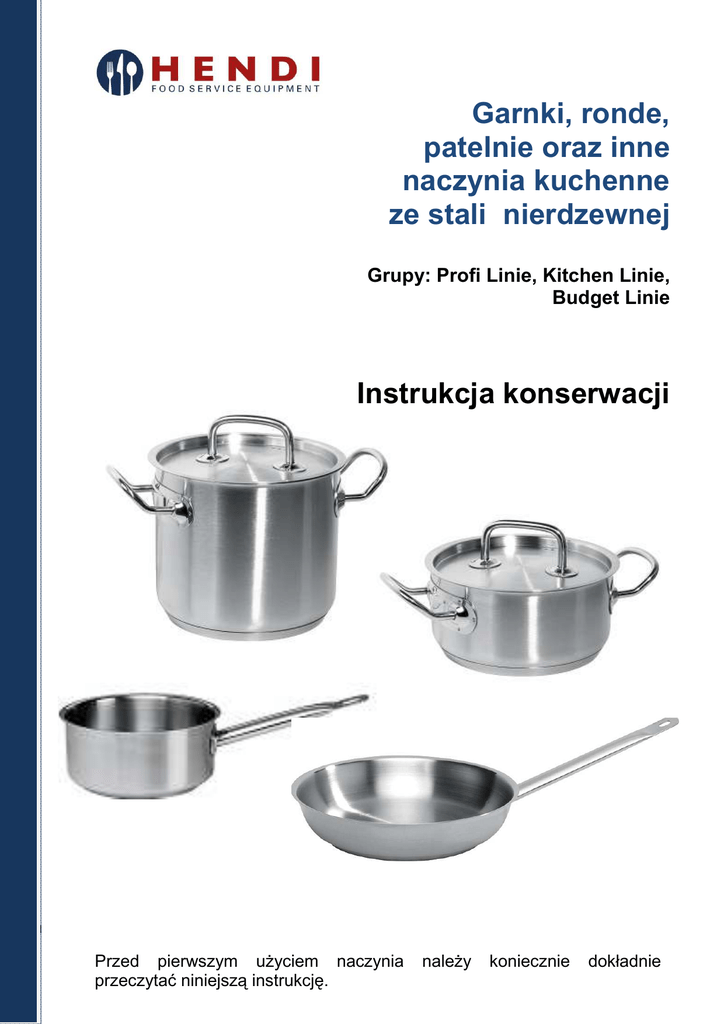 Garnki, ronde, patelnie oraz inne naczynia kuchenne ze stali nierdzewnej Grupy: Profi Linie, Kitchen Linie, Budget Linie Instrukcja konserwacji I Przed pierwszym uŜyciem naczynia przeczytać niniejszą instrukcję. naleŜy koniecznie dokładnie Szanowny Kliencie, Przed pierwszym użyciem naczynia ze stali nierdzewnej dokładnie przeczytaj całą instrukcję, aby niewłaściwym użytkowaniem nie spowodować żadnej szkody. Przede wszystkim zapoznaj się z przepisami dotyczącymi bezpieczeństwa użytkowania. Wskazówki bezpieczeństwa • Nieprawidłowa obsługa i niewłaściwe użytkowanie może spowodować poważne uszkodzenie urządzenia lub zranienie osób. • Naczynie może być stosowane wyłącznie w celu, do którego zostało zaprojektowane tj. do gotowania, duszenia, smażenia potraw. • Producent nie ponosi żadnej odpowiedzialności za szkody spowodowane nieprawidłową obsługą i niewłaściwym użytkowaniem naczynia. • Podczas gotowania, smażenia, duszenia itp. naczynie się nagrzewa UWAGA: niebezpieczeństwo oparzenia się • Mocno nagrzanego naczynia nie wkładaj pod strumień zimnej wody UWAGA: niebezpieczeństwo oparzenia się oraz uszkodzenia naczynia • Mocno nagrzanego naczynia nie odkładaj na palne powierzchnie – poczekaj aż ostygnie. UWAGA: niebezpieczeństwo pożaru • Dzieci nie uświadamiają sobie zagrożeń, jakie może spowodować użytkowanie naczyń. Nigdy nie pozwalaj dzieciom posługiwać się naczyniami. • Z naczyń nie mogą korzystać osoby (także dzieci), u których stwierdzono osłabione zdolności fizyczne, sensoryczne lub umysłowe, albo którym brakuje odpowiedniej wiedzy i doświadczenia. Przygotowanie przed pierwszym użyciem • Sprawdź, czy naczynie nie jest uszkodzone. W przypadku jakichkolwiek uszkodzeń niezwłocznie skontaktuj się ze swoim dostawcą i NIE korzystaj z naczynia. • Zdjąć całe opakowanie i folię ochronną (o ile dotyczy). • Przed pierwszym użyciem umyj dokładnie naczynie miękką szczotką lub gąbką oraz dostanym w handlu łagodnym płynem do mycia naczyń. • Nie stosować żadnych rysujących materiałów jak stalowe szczotki, proszki ścierne, wełna szklana i innych twardych przedmiotów. 2 3 Dystrybutor w Polsce: Hendi Polska Sp. z o.o. ul. Magazynowa 5 62-023 Gądki Polska Tel: +48 61 6587000 Fax: +48 61 6587001 www.hendi.pl [email protected] (ver. : 02/2014) 4