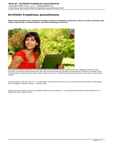 Dom.pl | Architekt krajobrazu poszukiwany Copyright DOM.pl Sp. z o.o. - [email protected] http://www.dom.pl/architekt-krajobrazu-poszukiwany.html Architekt krajobrazu poszukiwany Właściciele ogrodów coraz częściej korzystają z pomocy architektów krajobrazu, którzy nie tylko decydują, jakie rośliny mają rosnąć w danym miejscu, ale także kształtują przestrzeń. Jak czytamy w Gazecie Prawnej, w tej branży mamy do czynienia z bardzo dużą konkurencją, dlatego architekci muszą startować w różnego rodzaju konkursach lub mieć na koncie realizacje ogrodów w prestiżowych miejscach. Ponadto osoby zainteresowane wykonywaniem tego zawodu powinny się liczyć z koniecznością doszkalania przez cały okres wykonywania zawodu. Architekt zieleni musi się znać m.in. na materiałach wykończeniowych oraz być w stanie samodzielnie zbadać rodzaj gleby, która występuje w danym miejscu – czytamy dalej. Gazeta zaznacza jednak, że praca architekta krajobrazu jest opłacalna – za przygotowanie projektu ogrodu dostaje on od kilkuset do kilku tysięcy złotych. page 1 / 1
