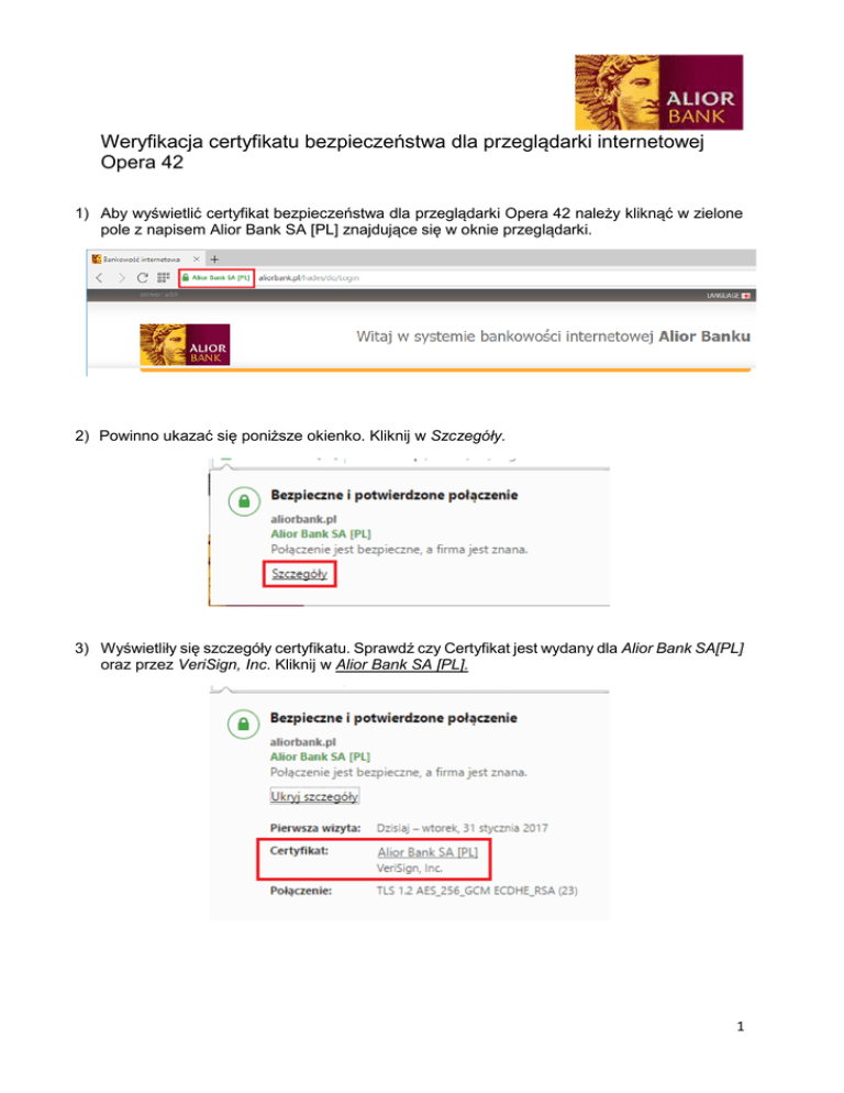 Weryfikacja certyfikatu bezpieczeństwa dla przeglądarki internetowej Opera 42 1) Aby wyświetlić certyfikat bezpieczeństwa dla przeglądarki Opera 42 należy kliknąć w zielone pole z napisem Alior Bank SA [PL] znajdujące się w oknie przeglądarki. 2) Powinno ukazać się poniższe okienko. Kliknij w Szczegóły. 3) Wyświetliły się szczegóły certyfikatu. Sprawdź czy Certyfikat jest wydany dla Alior Bank SA[PL] oraz przez VeriSign, Inc. Kliknij w Alior Bank SA [PL]. 1 4) Ukaże się poprawny certyfikat. Sprawdź czy został wydany dla aliorbank.pl, a także jego nazwę i do kiedy jest ważny. Możesz sprawdzić więcej szczegółów dotyczących certyfikatu oraz ścieżkę certyfikacji. 2 5) Poprawna ścieżka certyfikacji dla Opera 42 3