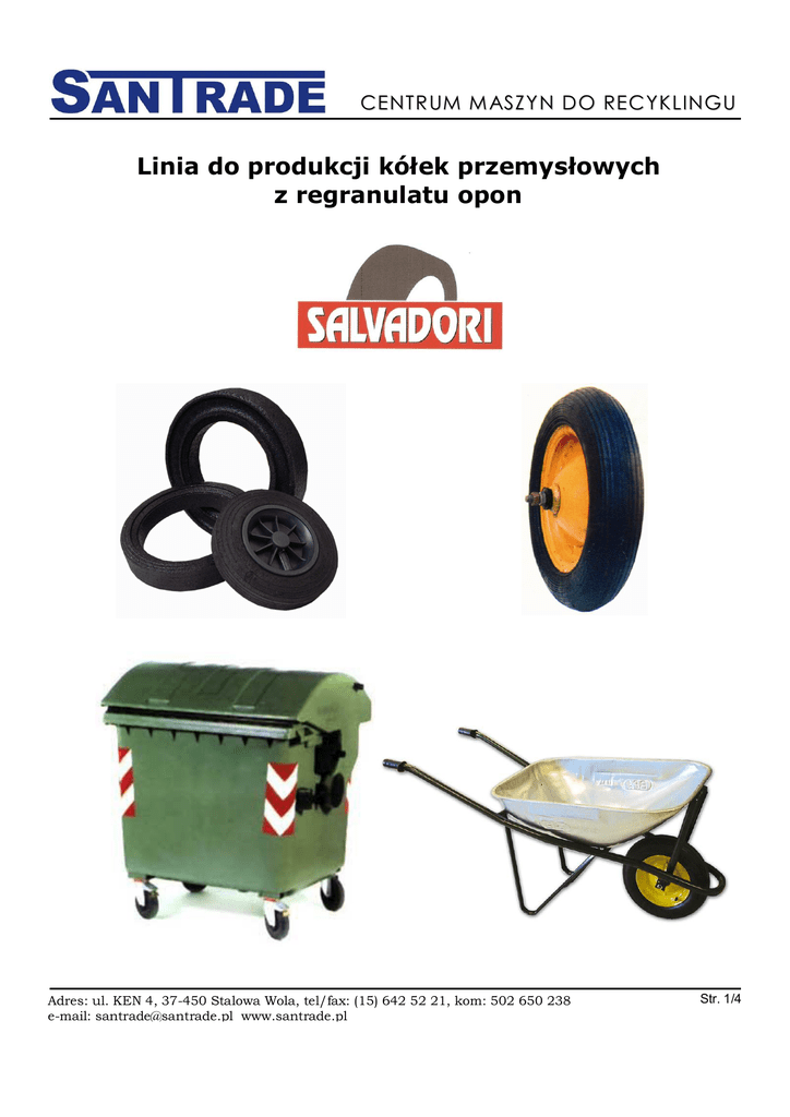 C E N T R U M M AS Z Y N D O R E C Y K L I N G U Linia do produkcji kółek przemysłowych z regranulatu opon Adres: ul. KEN 4, 37-450 Stalowa Wola, tel/fax: (15) 642 52 21, kom: 502 650 238 e-mail: [email protected] www.santrade.pl Str. 1/4 C E N T R U M M AS Z Y N D O R E C Y K L I N G U W skład linii wchodzą: Stacja załadunku granulatu gumowego z big-bagów Kompletny mikser wraz z zasobnikami granulatu i lepiszcza Prasa matrycowa Matryca do produkcji kółek o średnicy 200 mm Adres: ul. KEN 4, 37-450 Stalowa Wola, tel/fax: (15) 642 52 21, kom: 502 650 238 e-mail: [email protected] www.santrade.pl Str. 2/4 C E N T R U M M AS Z Y N D O R E C Y K L I N G U Opis: Linia technologiczna do produkcji przemysłowych kółek gumowych z regranulatu zużytych opon. Przykład wydajności produkcji: Produkt – kółko przemysłowe: Cykl - minuty: Średnica zewnętrzna: 197 mm Średnica wewnętrzna: 96,5 mm Szerokość: 47 mm 8 Liczba cykli na godzinę: 7,5 Liczba kółek w matrycy: 16 Produkcja kółek na godzinę: 120 sztuk Produkcja kółek na rok (3 zmiany): Do 700.000 sztuk Uwaga.: zaprezentowane dane należy rozumieć jako orientacyjne, zależne od typu i technicznych parametrów materiału wsadowego oraz finalnego, oraz między innymi od wyszkolenia personelu, warunków pracy, etc. Ilość izocyjanianu zależy od zastosowanego gatunku oraz typu i rozmiaru granulatu gumowego. Udział wynosi miedzy 6% a 9% całkowitej wagi kółka. Charakterystyka kółka: Produkt: Kółko przemysłowe Waga: 0,95 kg 1,15 kg/dm3 Maksymalna gęstość: Rozmiar granulatu gumowego: 0-1,5 mm Przykładowa charakterystyka mechaniczna przy PU 6% Twardość: Wytrzymałość na zerwanie: Wydłużenie przy zerwaniu: Rozdarcie: Ścieranie: Gęstość: Wartość Jednostka Metoda analizy 65 Shore A DIN 53 505 1,59 N/mm2 DIN 53 504 77 % DIN 53 504 4,03 N/mm DIN 53 507 218 Mm3 DIN 53 516 1,15 g/cm 3 DIN 53 420 Adres: ul. KEN 4, 37-450 Stalowa Wola, tel/fax: (15) 642 52 21, kom: 502 650 238 e-mail: [email protected] www.santrade.pl Str. 3/4 C E N T R U M M AS Z Y N D O R E C Y K L I N G U Matryca: Wymiar płyty matrycy: 1250 x 1250 mm Ilość kółek w matrycy: 16 Parametry techniczne: Linia SALVADORI srl: Łączna moc silników elektrycznych: Napięcie: Max nacisk prasy: Max temp. prasy: Max posuw płyty: Max wydajność miksera: Dokumentacja: Warunki pracy: Model: do produkcji kółek przemysłowych z regranulatu opon 72 kW, w tym 36 kW do nagrzewania pasy 400 V, 50 Hz 100 T 140O C 300 mm 420 kg/godz. Instrukcja obsługi po polsku, Deklaracja zgodności CE min. 15°C max. 40°C Adres: ul. KEN 4, 37-450 Stalowa Wola, tel/fax: (15) 642 52 21, kom: 502 650 238 e-mail: [email protected] www.santrade.pl Str. 4/4