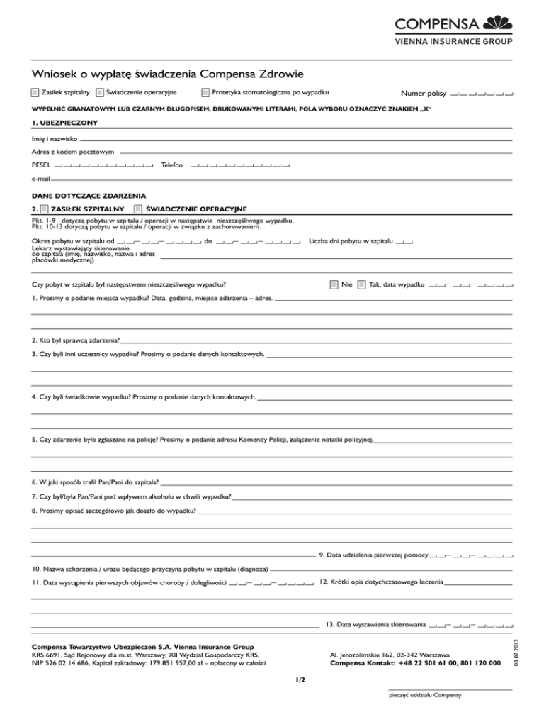 Wniosek o wyp∏atę świadczenia Compensa Zdrowie Zasi∏ek szpitalny Świadczenie operacyjne Protetyka stomatologiczna po wypadku Numer polisy WYPE¸NIĆ GRANATOWYM LUB CZARNYM D¸UGOPISEM, DRUKOWANYMI LITERAMI, POLA WYBORU OZNACZYĆ ZNAKIEM „X“ 1. UBEZPIECZONY Imię i nazwisko Adres z kodem pocztowym PESEL Telefon e-mail DANE DOTYCZĄCE ZDARZENIA 2. ZASIŁEK SZPITALNY ŚWIADCZENIE OPERACYJNE Pkt. 1-9 dotyczą pobytu w szpitalu / operacji w następstwie nieszczęśliwego wypadku. Pkt. 10-13 dotyczą pobytu w szpitalu / operacji w związku z zachorowaniem. Okres pobytu w szpitalu od Lekarz wystawiający skierowanie do szpitala (imię, nazwisko, nazwa i adres placówki medycznej) do Liczba dni pobytu w szpitalu Czy pobyt w szpitalu by∏ następstwem nieszczęśliwego wypadku? Nie Tak, data wypadku 1. Prosimy o podanie miejsca wypadku? Data, godzina, miejsce zdarzenia – adres. 2. Kto był sprawcą zdarzenia? 3. Czy byli inni uczestnicy wypadku? Prosimy o podanie danych kontaktowych. 4. Czy byli świadkowie wypadku? Prosimy o podanie danych kontaktowych. 5. Czy zdarzenie było zgłaszane na policję? Prosimy o podanie adresu Komendy Policji, załączenie notatki policyjnej. 6. W jaki sposób trafił Pan/Pani do szpitala? 7. Czy był/była Pan/Pani pod wpływem alkoholu w chwili wypadku? 8. Prosimy opisać szczegółowo jak doszło do wypadku? 9. Data udzielenia pierwszej pomocy 10. Nazwa schorzenia / urazu będącego przyczyną pobytu w szpitalu (diagnoza) 12. Krótki opis dotychczasowego leczenia 11. Data wystąpienia pierwszych objawów choroby / dolegliwości Compensa Towarzystwo Ubezpieczeń S.A. Vienna Insurance Group KRS 6691, Sąd Rejonowy dla m.st. Warszawy, XII Wydział Gospodarczy KRS, NIP 526 02 14 686, Kapitał zakładowy: 179 851 957,00 zł – opłacony w całości Al. Jerozolimskie 162, 02-342 Warszawa Compensa Kontakt: +48 22 501 61 00, 801 120 000 1/2 pieczęć oddzia∏u Compensy 08.07.2013 13. Data wystawienia skierowania 3. PROTETYKA STOMATOLOGICZNA PO WYPADKU 1. Prosimy o podanie miejsca wypadku? Data, godzina, miejsce zdarzenia – adres 2. Kto był sprawcą zdarzenia? 3. Czy byli inni uczestnicy wypadku? Prosimy o podanie danych kontaktowych. 4. Czy byli świadkowie wypadku? Prosimy o podanie danych kontaktowych. 5. Czy zdarzenie było zgłaszane na policję? Prosimy o podanie adresu Komendy Policji, załączenie notatki policyjnej. 6. W jaki sposób trafił Pan/Pani do szpitala? 7. Czy był/była Pan/Pani pod wpływem alkoholu w chwili wypadku? 8. Prosimy opisać szczegółowo jak doszło do wypadku? 9. Data udzielenia pierwszej pomocy Braki występujące w uzębieniu przed nieszczęśliwym wypadkiem (proszę zaznaczyć brakujące zęby) Zęby szczęki (góra) Strona prawa 8 8 7 7 6 6 5 5 4 4 3 3 2 2 1 1 1 1 2 2 3 3 4 4 5 5 6 6 7 7 8 8 Strona lewa Zęby żuchwy (dó∏) 4. ZAŁĄCZNIKI ¸ącznie liczba za∏ączników Karta leczenia szpitalnego Dokumentacja medyczna dotycząca leczenia Rachunek (orygina∏) stomatologicznego leczenia protetycznego Inne (jakie) Dokumentację należy przesłać na adres: Compensa TU S.A. Vienna Insurance Group P. Poczt. nr 3335, 40-610 Katowice 5. SPOSÓB WYPŁATY ŚWIADCZENIA Przelew na rachunek bankowy Przekaz na adres Data miejscowość czytelny podpis osoby zg∏aszającej roszczenie 2/2