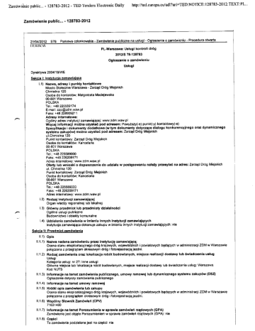 7amowienie public . . . - 128783-2012 - TED Tenders Electronic Daily http ://ted .europa.eu/udl?uri=TED :NOTICE :128783-2012 :TEXT :PL. . . Zamowienie public . . . -128783-2012 21/04/2012 I . II .III .IV .VI . S78 otwarta PaAstwa Cztonkowskie-Zam6wienie publiczne na uslugi - Ogtoszenie o zam6wieniu - Procedura PL-Warszawa : Uslugi kontroli dr6g 2012/8 78-128783 Ogtoszenie o zam6wieniu Uslugi Dyrektywa 2004118/WE Sekcia I : Instytucla zamawiajaca 1 .1) Nazwa, adresy i punkty kontaktowe Miasto Stoleczne Warszawa - Zarzdd Dr6g Miejskich Chmielna 120 Osoba do kontakt6w : Malgorzata Maciejewska 00-801 Warszawa POLSKA Tel . : +48 225589174 E-mail : zzp@zdm .waw .p l Faks : +48 228909211 Adresy internetowe : Og6lny adres instytucji zamawiajacej : www.zdm .waw .pl Wiqcej informacji motna uzyskae pod adresem : Powyzszy(-e) punkt(-y) kontaktowy(-e) SpecyfikacJe i dokumenty dodatkowe (w tym dokumenty dotyczace dialogu konkurencyjnego oraz dynamicznego systemu zakup6w) moina uzyska6 pod adresem : Zarzdd Dr6g Miejskich ul .Chmielna 120 Punkt kontaktowy : Zarzqd Dr6g Miejskich Osoba do kontakt6w : Kancelaria 00-801 Warszawa POLSKA Tel . : +48 225589000 Faks : +48 226209171 Acres internetowy : www.zdm .waw .pl Oferty tub wnioski o dopuszczenie do udziatu w postypowaniu nalety przesyta6 na adres : Zarzdd Dr6g Miejskich ul . Chmielna 120 Punkt kontaktowy: Zarzdd Dr6g Miejskich Osoba do kontaktaw: Kancelaria 00-801 Warszawa POLSKA Tel . : +48 225589000 Faks : +48 226209171 Adres internetowy: www .zdm.waw.p l 1 .2) Rodzaj lnstytucji zamawtajaceJ Organ wladzy regionalnej lub lokalnej 1 .3) Gt6wny przedmiot lub przedmioty dzialalno6cl Og61ne us4ugi publiczne Budownictwo i obiekty komunalne 1 .4) Udzielenie zam6wienia w imieniu innych instytucji zamawlajdcych Instytucja zamawiajqca dokonuje zakupu w imieniu innych instytucji zamawiajacych : nie Sekcia II : Przedmiot zam6wienia 11 .1) Opis 11 .1 .1) Nazwa nadana zam6wienlu przez instytucJg zamawiajdc$ : Ocena stanu eksploatacyjnego dr6g krajowych, wojew6dzkich i powiatowych bgdacych w administracji ZDM w Warszawie pdaczona z przegladem okresowym dr6g i fotorejestracjajezdni . 11 .1 .2) Rodzaj zam6wienia oraz lokalizacja robot budowlanych, miejsce realizacji dostawy lub 4wiadczenia uslug Uslugi Kategoria ustug : nr 27 : Inne uslugi Gl6wne miejsce lub lokalizacja robot budowlanych, miejsce realizacji dostawy lub twiadczenia ustug : Warszawa . Kod NUTS 11 .1 .3) Infonnacje na temat zam6wienia publicznego, umowy ramowej lub dynamicznego systemu zakup6w (DSZ) Ogloszenie dotyczy zam6wienia publicznego 11 .1 .4) Informacje na temat umowy ramowej 11 .1 .5) Kr6tki opts zam6wienia lub zakupu Ocena stanu eksploatacyjnego dr6g krajowych, wojew6dzkich i powiatowych bcdacych w administracji ZDM w Warszawie polaczona z przegladem okresowym dr6g i fotorejestracjajezdni . 11 .1 .6) Wsp6lny Slownik Zam6wie6 (CPV) 71631480 11 .1 .7) Infonnacje na temat Porozumienia w sprawie zam6wieii rzadowych (GPA) Zam6wienie jest objcte Porozumieniem w sprawie zam6wie6 rzadowych (GPA) : nie 11 .1 .8) czyacl To zam6wienie podzielone jest na cz$Sci : nie 'zam6wienie public . . . - 128783-2012 - TED Tenders Electronic Daily http ://ted .europa .eufud l ?uri=TED :NOTICE :128783-2012 :TEXT :PL. . . Infonnacje o ofertach wariantowych Dopuszcza sic skladanie ofert wariantowych : nie 11 .2) Wielko§6 tub zakres zam6wienia 11 .2 .1) Calkowita Wielkott lub zakres : Warto§6 szacunkowa zam6wienia przekracza r6wnowarto§6 kwoty 200 000 EUR a jest mniejsza nit r6wnowarto56 kwoty 10 000 000 EUR . 11 .2 .2) Informacje o opcjach Opcje : nie 11 .2 .3) Informacje o wznowieniach Jest to zam6wienie podlegajqce wznowieniu : nie 11 .3) Czas trwania zam6wienia tub tenpin realizacji Okras w miesiacach : 6 (od udzielenia zam6wienia) Sekcia III : Infonnacie o charakterze prawnym, ekonomicznym, finansowym i technicznym 111 .1) Warunkidotyczacezam6wienia 111 .1 .1) Wymagane wadia I gwarancje : 33 000,00 111 .1 .2) G16wne warunki finansowe i uzgodnienia ptatnicze i/lub odniesienie do odpowiednich przepis6wje regulujqcych : $rodki budtetowe miasta stotecznego Warszawy . 111 .1 .3) Forma prawna, jaka muss przyja6 grupa wykonawc6w, kt6rej zostanie udzielone zam6wienie : W przypadku udzielenia zam(5wienia konsorcjum, zamawiajqcy przed podpisaniem umowy, tada zlotenia umowy regulujacej wsp6lpracc tych wykonawc6w . 111 .1 .4) Inneszczeg61newarunki Wykonanie zam6wienia podlega szczeg6lnym warunkom : nie 111 .2) Warunki udziatu 1-1 111 .2 .1) Sytuacja podmiotowa wykonawc6w, w tym wymogi zwiqzane z wpisem do rejestru zawodowego lub handlowego Informacje i formalno§ci konieczne do dokonania oceny spelniania wymog6w : 1 . Ocena spelnienia warunk6w wymaganych od wykonawc6w zostanie dokonana na podstawie oswiadcze6 i dokument6w wg formuty „spelnia - nie spe4nia" . Niespetnienie chociatby jednego warunku skutkowaO bcdzie wykluczeniem oferenta z poslcpowania . 1 .1 . 0 udzielenie zam6wienia moga ubiega6 sic wykonawcy, kt6rzy: 1 .1 .1 . spelniajawarunki, dotyczace : 1 .1 .1 .1 posiadania uprawnie6 do wykonywania okre§lonej dzialalno§ci lub czynno§ci, jeteli przepisy prawa nakladaja obowiazek ich posiadania ; 1 .1 .1 .2. posiadania wiedzy I do§wiaduenia ; 1 .1 .1 .3. dysponowania odpowiednim potencjalem technicznym oral osobami zdolnymi do wykonania zam6wienia ; 1 .1 .1 .4 . sytuacji ekonomicznej I finansowej ; 1 .1 .2 . wykata brak podstaw do wykluczenia z postcpowania z powodu niespelniania warunk6w, o kt6rych mowa w art . 24 ust. 1 ustawy Pzp . 1 .2. W przypadku wykonawc6w wsp6lnie ubiegajacych sic o udzielenie zam6wienia warunek opisany w pkt .1 .1 .2 musi spelnia6 katdy z Wykonawc6w, natomiast warunki okre§lone w pkt 1 .1 .1 . spelnia6 muszalacznie wszyscy wykonawcy . 2 . Dokumenty na potwierdzenie warunk6w udziatu w poslcpowaniu . 2 .2 .1 . O§wiadczenie wykonawcy, to nie podlega wykluczeniu na podstawie art . 24 ust. 1 ustawy Pzp-zalacznik nr 1b . 2 .2 .2 . Aktualny odpis z wla§cwego rejestru, jeteli odrcbne przepisy wyma