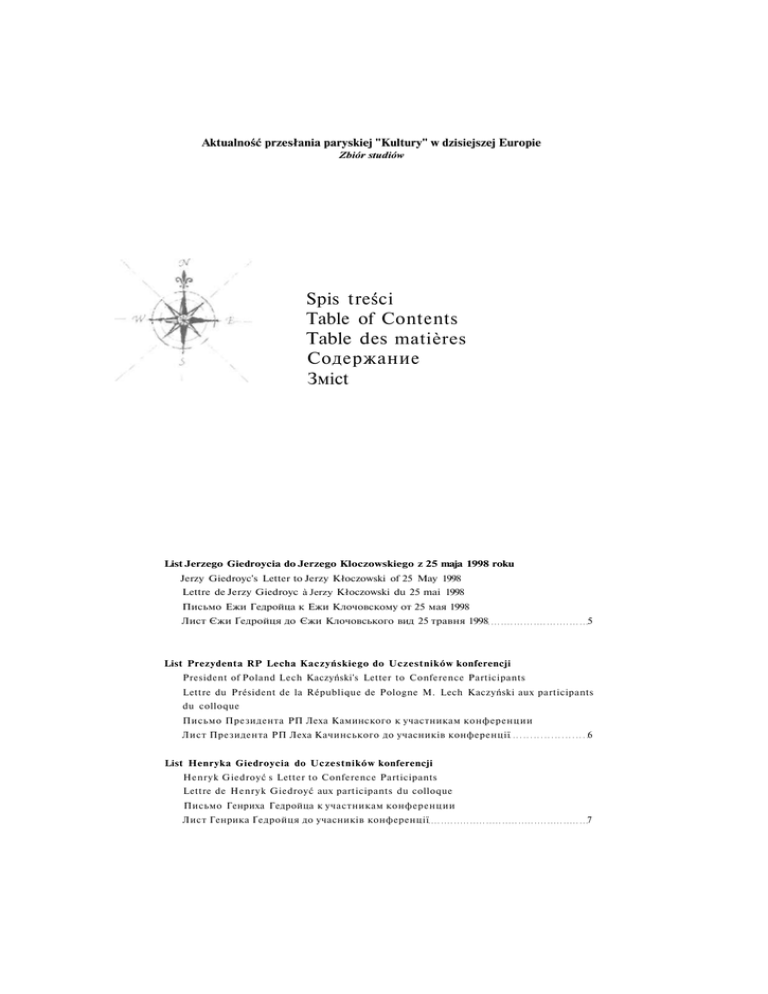Aktualność przesłania paryskiej "Kultury" w dzisiejszej Europie Zbiór studiów Spis treści Table of Contents Table des matières Содержание Змict List Jerzego Giedroycia do Jerzego Kloczowskiego z 25 maja 1998 roku Jerzy Giedroyc's Letter to Jerzy Kłoczowski of 25 May 1998 Lettre de Jerzy Giedroyc à Jerzy Kłoczowski du 25 mai 1998 Письмо Ежи Гедройца к Ежи Клочовскому от 25 мая 1998 Лист Єжи Ґедройця до Єжи Клочовського вид 25 травня 1998 5 List Prezydenta RP Lecha Kaczyńskiego do Uczestników konferencji President of Poland Lech Kaczyński's Letter to Conference Participants Lettre du Président de la République de Pologne M. Lech Kaczyński aux participants du colloque Письмо Президента РП Леха Каминского к участникам конференции Лист Президента РП Леха Качинського до учасників конференції 6 List Henryka Giedroycia do Uczestników konferencji Henryk Giedroyć s Letter to Conference Participants Lettre de Henryk Giedroyć aux participants du colloque Письмо Генриха Гедройца к участникам конференции Лист Генрика Ґедройця до учасників конференції 7 460 Spis treści Jerzy Kłoczowski Przedmowa Foreword Avant-propos Предисловие Передмова Świadkowie Bohdan Osadczuk Stanisław Szuszkiewicz Adam Michnik 9 19 23 27 Geneza Michał Giedroyć Ród Giedroyciów i tradycje Rzeczypospolitej Wielu Narodów The Giedroyć Family and the Traditions of the Commonwealth of Many Nations La famille Giedroyć et les traditions de la Res Publica de Plusieurs Nations Род Гедройцев и традиции Речи Посполитой Многих Народов Рід Ґедройців і традиции Речі Посполитої Багатьох Народів....................................33 Halina Parafianowicz Europa Środkowo-Wschodnia w amerykańskiej perspektywie. Kilka uwag o okresie międzywojennym East-Central Europe from the American Perspective. Selected Remarks Concerning the InterWar Period L'Europe du Centre-Est dans la perspective américaine. Quelques remarques sur la période d'entre-deux-guerres Центрально-Восточная Европа в американской перспективе. Несколько замечаний о междувоенном периоде Центрально-Східна Європа в американській перспективі. Кілька зауважень про міжвоєнний період..............................................................43 Dzieło Giedroycia Kazimierz Michał Ujazdowski Zaczęło się przed wojną It All Started Before the War Cela commença avant la guerre Началось перед войной Розпочалося перед війною 53 Spis treści 461 Piotr Wandycz Juliusz Mieroszewski a Niemcy Juliusz Mieroszewski and His Opinions on the Polish-German Relations Juliusz Mieroszewski et les questions allemandes Юлиуш Мерошевский и Германия Юліуш Мерошевський і Німеччина 57 Rafał Habielski Uwagi do tekstu profesora Piotra Wandycza Remarks on the Text Presented by Professor Piotr Wandycz Remarques autour du texte du professeur Piotr Wandycz Замечания к тексту профессора Петра Вандича Зауваження до тексту професора Пйотра Вандича 65 Janusz Korek Zwierzę polityczne w przeciągu między Wschodem a Zachodem A Political Animal Between the East and West L'animal politique dans une porte entre l'Est et l'Ouest Политический зверь в промежутке между Востоком и Западом Політичний звір у проміжку між Сходом і Заходом 69 Grzegorz Motyka Aktualność ukraińskiej problematyki „Kultury" Relevance of Views on the Ukrainian Issues in "Kultura" L'actualité de la problématique ukrainienne dans la « Kultura » Актуальность проблематики украинской „Культуры" Актуальність проблематики української „Культури"...................................................79 Leopold Unger Polityka wschodnia w wizji „Kultury" Visions of Eastern Policy in "Kultura" La politique orientale d'après la vision de la « Kultura » Восточная политика в представлении „Культуры" Східна політика в уявленні „Культури"..........................................................................89 Paweł Ziętara „Kultura" na tle powojennej emigracji "Kultura" in the Context of the Post-War Emigration La « Kultura » et l'émmigration d'après-la-guerre „Культура" на тле послевоенной эмиграции „Культура" на тлі повоєнної еміграції. 97 462 Spis treści Krzysztof Czyżewski Inspiracje „Kultury" Inspiration Drawn from "Kultura" Le rôle inspirateur de la « Kultura » Инспирации „Культуры" Інспірації „Культури"....................................................................................... 111 Janusz Krupski О lubelskich „Spotkaniach" On Lublin-Based Journal "Spotkania" Les editions lubliniennes « Spotkania » О люблинских „Встречах" Про люблінські „Зустрічі"......................................................................................113 Bohdan Cywiński Rola Kościoła w dynamizowaniu sytuacji na Litwie, Białorusi i Ukrainie The Role of the Church in the Changes in Lithuania, Belarus and Ukraine Le rôle de l'Eglise dans les processus de dynamisation de la situation 