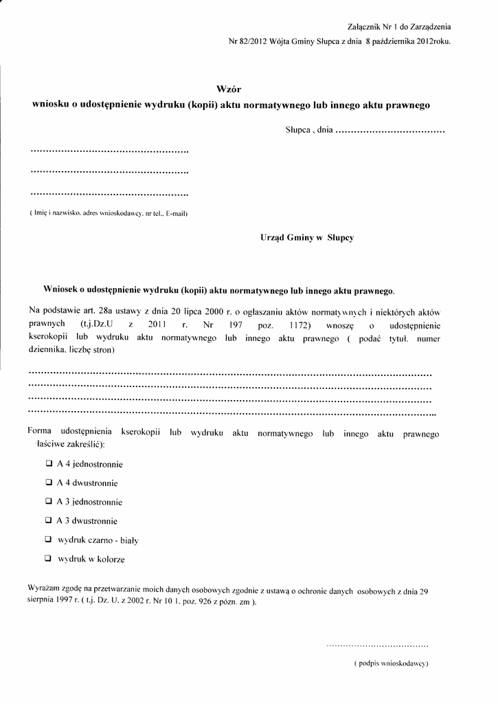 ZałącznikNr 1 do Zarządzenia Nr 82120|2 W ojta Gminy Słupcaz dnja 8 paździemika20l 2roku. WzÓr wniosku o udostępnienie wydruku (kopii) aktu normatywnego |ub innego aktu prawnego S ł u p c a ,d l l i a ( lmię i nazwisko"adreswnioskodawc1'. nr tcl.. E.mai|) IJrząd Gminy w Słupcy Wniosek o udostępnienierr7druku (kopii) aktu normat}'wnego|ub innegoaktu prawnego. Na podstawieart. 28a ustawyz dnia f0 |ipca2000 r. o ogłaszaniuaktÓw normatyrvnlych i niektÓrychaktÓł, prawnych (tj.Dz.U z f0|| r. Nr |97 poz' |172) wnoszę o udosĘpnienie kserokopii lub wydruku aktu normatywnego |ub innego aktu prawnego ( podać t5,tuł.numer dziennika, Iiczbęstron) Fonna udostępnienia kserokopii tub wydruku aktu normatywnego lub innego aktu prawnęgo ,łaściwe zakreś|ić): D A 4.jednostronnie D A 4 dwustronnie D A 3.iednostronnie D A 3 dwustronnie D wydrukczarno- biały U wydrukw kolorze WyrażamZgodę na przetwarzaniemoich danych osobowych Zgodnie Z ustawąo ochronie danych osobowych Z dnia 29 sierpnial997 r' ( tj. Dz. U. z2oo2 r. Nr |o |^poz. 926 zpÓm, zm), ( podpis n'nioskodarvo,) N a l i c z o n oo p t a t ęw w y s o k o ś c. .i . . . ............zł. Wnioskodawcadokonałr,vpłaty w wymaganejwysokościna konto Gminy Słupca. S ł u p c ad' n i a . . . . . . . PotwierdzamodbiÓr wnioskowanejdokumentacji : Słupca.dnia ...... ............... ( podpiswnioskodawcy)