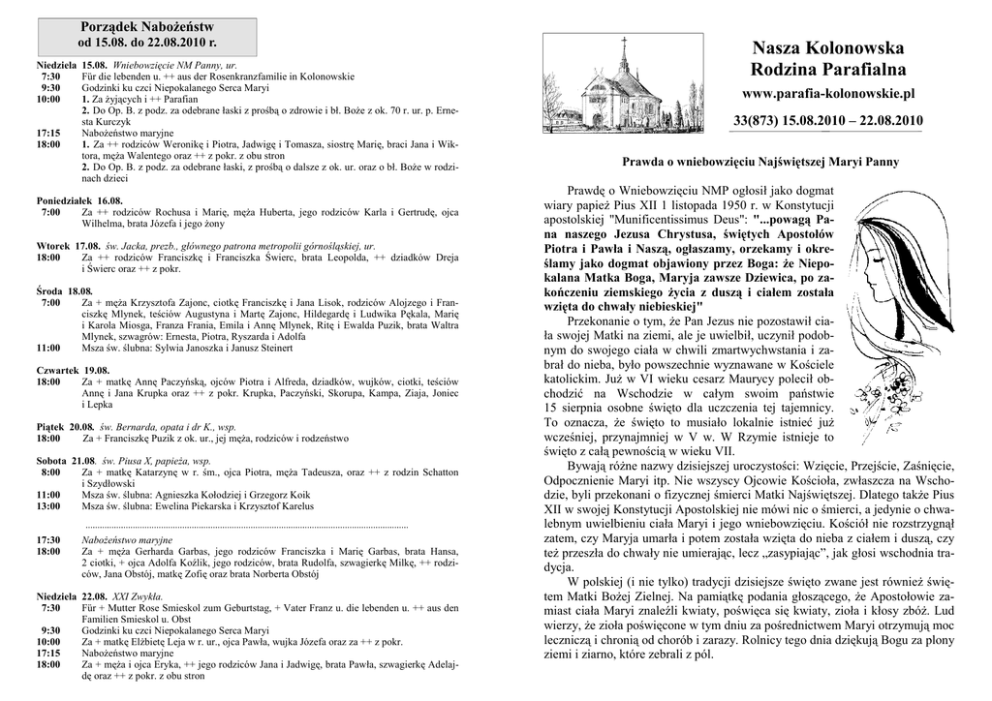 Porządek NaboŜeństw od 15.08. do 22.08.2010 r. Niedziela 7:30 9:30 10:00 17:15 18:00 15.08. Wniebowzięcie NM Panny, ur. Für die lebenden u. ++ aus der Rosenkranzfamilie in Kolonowskie Godzinki ku czci Niepokalanego Serca Maryi 1. Za Ŝyjących i ++ Parafian 2. Do Op. B. z podz. za odebrane łaski z prośbą o zdrowie i bł. BoŜe z ok. 70 r. ur. p. Ernesta Kurczyk NaboŜeństwo maryjne 1. Za ++ rodziców Weronikę i Piotra, Jadwigę i Tomasza, siostrę Marię, braci Jana i Wiktora, męŜa Walentego oraz ++ z pokr. z obu stron 2. Do Op. B. z podz. za odebrane łaski, z prośbą o dalsze z ok. ur. oraz o bł. BoŜe w rodzinach dzieci Poniedziałek 16.08. 7:00 Za ++ rodziców Rochusa i Marię, męŜa Huberta, jego rodziców Karla i Gertrudę, ojca Wilhelma, brata Józefa i jego Ŝony Wtorek 17.08. św. Jacka, prezb., głównego patrona metropolii górnośląskiej, ur. 18:00 Za ++ rodziców Franciszkę i Franciszka Świerc, brata Leopolda, ++ dziadków Dreja i Świerc oraz ++ z pokr. Środa 18.08. 7:00 Za + męŜa Krzysztofa Zajonc, ciotkę Franciszkę i Jana Lisok, rodziców Alojzego i Franciszkę Mlynek, teściów Augustyna i Martę Zajonc, Hildegardę i Ludwika Pękala, Marię i Karola Miosga, Franza Frania, Emila i Annę Mlynek, Ritę i Ewalda Puzik, brata Waltra Mlynek, szwagrów: Ernesta, Piotra, Ryszarda i Adolfa 11:00 Msza św. ślubna: Sylwia Janoszka i Janusz Steinert Czwartek 19.08. 18:00 Za + matkę Annę Paczyńską, ojców Piotra i Alfreda, dziadków, wujków, ciotki, teściów Annę i Jana Krupka oraz ++ z pokr. Krupka, Paczyński, Skorupa, Kampa, Ziaja, Joniec i Lepka Piątek 20.08. św. Bernarda, opata i dr K., wsp. 18:00 Za + Franciszkę Puzik z ok. ur., jej męŜa, rodziców i rodzeństwo Sobota 21.08. św. Piusa X, papieŜa, wsp. 8:00 Za + matkę Katarzynę w r. śm., ojca Piotra, męŜa Tadeusza, oraz ++ z rodzin Schatton i Szydłowski 11:00 Msza św. ślubna: Agnieszka Kołodziej i Grzegorz Koik 13:00 Msza św. ślubna: Ewelina Piekarska i Krzysztof Karelus 17:30 18:00 NaboŜeństwo maryjne Za + męŜa Gerharda Garbas, jego rodziców Franciszka i Marię Garbas, brata Hansa, 2 ciotki, + ojca Adolfa Koźlik, jego rodziców, brata Rudolfa, szwagierkę Milkę, ++ rodziców, Jana Obstój, matkę Zofię oraz brata Norberta Obstój Niedziela 22.08. XXI Zwykła. 7:30 Für + Mutter Rose Smieskol zum Geburtstag, + Vater Franz u. die lebenden u. ++ aus den Familien Smieskol u. Obst 9:30 Godzinki ku czci Niepokalanego Serca Maryi 10:00 Za + matkę ElŜbietę Leja w r. ur., ojca Pawła, wujka Józefa oraz za ++ z pokr. 17:15 NaboŜeństwo maryjne 18:00 Za + męŜa i ojca Eryka, ++ jego rodziców Jana i Jadwigę, brata Pawła, szwagierkę Adelajdę oraz ++ z pokr. z obu stron Nasza Kolonowska Rodzina Parafialna www.parafia-kolonowskie.pl 33(873) 15.08.2010 – 22.08.2010 Prawda o wniebowzięciu Najświętszej Maryi Panny Prawdę o Wniebowzięciu NMP ogłosił jako dogmat wiary papieŜ Pius XII 1 listopada 1950 r. w Konstytucji apostolskiej "Munificentissimus Deus": "...powagą Pana naszego Jezusa Chrystusa, świętych Apostołów Piotra i Pawła i Naszą, ogłaszamy, orzekamy i określamy jako dogmat objawiony przez Boga: Ŝe Niepokalana Matka Boga, Maryja zawsze Dziewica, po zakończeniu ziemskiego Ŝycia z duszą i ciałem została wzięta do chwały niebieskiej" Przekonanie o tym, Ŝe Pan Jezus nie pozostawił ciała swojej Matki na ziemi, ale je uwielbił, uczynił podobnym do swojego ciała w chwili zmartwychwstania i zabrał do nieba, było powszechnie wyznawane w Kościele katolickim. JuŜ w VI wieku cesarz Maurycy polecił obchodzić na Wschodzie w całym swoim państwie 15 sierpnia osobne święto dla uczczenia tej tajemnicy. To oznacza, Ŝe święto to musiało lokalnie istnieć juŜ wcześniej, przynajmniej w V w. W Rzymie istnieje to święto z całą pewnością w wieku VII. Bywają róŜne nazwy dzisiejszej uroczystości: Wzięcie, Przejście, Zaśnięcie, Odpocznienie Maryi itp. Nie wszyscy Ojcowie Kościoła, zwłaszcza na Wschodzie, byli przekonani o fizycznej śmierci Matki Najświętszej. Dlatego takŜe Pius XII w swojej Konstytucji Apostolskiej nie mówi nic o śmierci, a jedynie o chwalebnym uwielbieniu ciała Maryi i jego wniebowzięciu. Kościół nie rozstrzygnął zatem, czy Maryja umarła i potem została wzięta do nieba z ciałem i duszą, czy teŜ przeszła do chwały nie umierając, lecz „zasypiając”, jak głosi wschodnia tradycja. W polskiej (i nie tylko) tradycji dzisiejsze święto zwane jest równieŜ świętem Matki BoŜej Zielnej. Na pamiątkę podania głoszącego, Ŝe Apostołowie zamiast ciała Maryi znaleźli kwiaty, poświęca się kwiaty, zioła i kłosy zbóŜ. Lud wierzy, Ŝe zioła poświęcone w tym dniu za pośrednictwem Maryi otrzymują moc leczniczą i chronią od chorób i zarazy. Rolnicy tego dnia dziękują Bogu za plony ziemi i ziarno, które zebrali z pól. Rozliczenie wymiany pokrycia dachowego probostwa i salek Dochody: 43.095,00 zł (pozostało z ubiegłego roku) 31.122,00 zł (kolekty) 2.600,00 zł (Packprofil i Państwo Oblong) 1.110,00 zł (sprzedaŜ złomu) 10.000,00 zł (UMiG - dotacja na utylizację azbestu) RAZEM: 87.927,00 zł Wydatki: 8.335,00 zł (brakujące materiały) 12.443,00 zł (zdjęcie, transport i utylizacja azbestu) 1.648,00 zł (farby i malowanie probostwa oraz salek) 65.270,00 zł (rusztowanie, robocizna i materiały) 4.500,00 zł (instalacja odgromienia) RAZEM: 92.196,00 zł Bóg zapłać wszystkim za ofiarność! KATECHIZM W PYTANIACH I ODPOWIEDZIACH Jak naleŜy rozumieć dar płodności w małŜeństwie? Płodność jest dobrem, darem i celem małŜeństwa. Dając początek nowemu Ŝyciu, małŜonkowie uczestniczą w ojcostwie BoŜym. Czy dozwolona jest regulacja poczęć? Regulacja poczęć to jeden z aspektów odpowiedzialnego ojcostwa i macierzyństwa. Poprawność intencji małŜonków nie usprawiedliwia jednak środ-ków niedozwolonych, takich jak antykoncepcja i sterylizacja. Co przede w