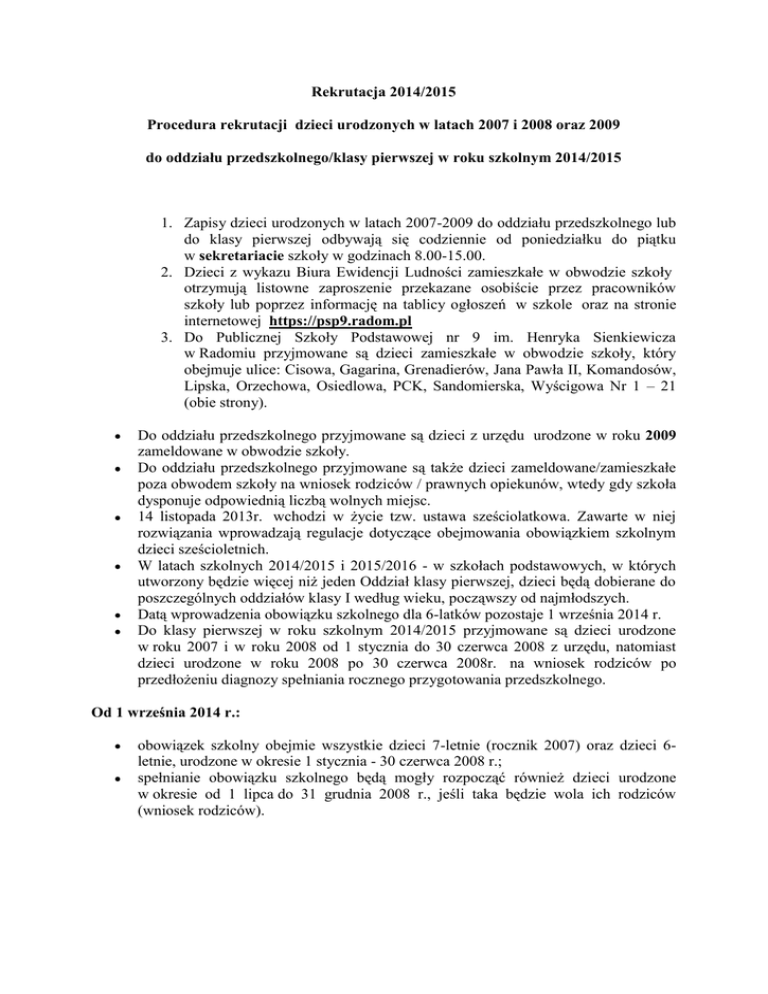 Rekrutacja 2014/2015 Procedura rekrutacji dzieci urodzonych w latach 2007 i 2008 oraz 2009 do oddziału przedszkolnego/klasy pierwszej w roku szkolnym 2014/2015 1. Zapisy dzieci urodzonych w latach 2007-2009 do oddziału przedszkolnego lub do klasy pierwszej odbywają się codziennie od poniedziałku do piątku w sekretariacie szkoły w godzinach 8.00-15.00. 2. Dzieci z wykazu Biura Ewidencji Ludności zamieszkałe w obwodzie szkoły otrzymują listowne zaproszenie przekazane osobiście przez pracowników szkoły lub poprzez informację na tablicy ogłoszeń w szkole oraz na stronie internetowej https://psp9.radom.pl 3. Do Publicznej Szkoły Podstawowej nr 9 im. Henryka Sienkiewicza w Radomiu przyjmowane są dzieci zamieszkałe w obwodzie szkoły, który obejmuje ulice: Cisowa, Gagarina, Grenadierów, Jana Pawła II, Komandosów, Lipska, Orzechowa, Osiedlowa, PCK, Sandomierska, Wyścigowa Nr 1 – 21 (obie strony). Do oddziału przedszkolnego przyjmowane są dzieci z urzędu urodzone w roku 2009 zameldowane w obwodzie szkoły. Do oddziału przedszkolnego przyjmowane są także dzieci zameldowane/zamieszkałe poza obwodem szkoły na wniosek rodziców / prawnych opiekunów, wtedy gdy szkoła dysponuje odpowiednią liczbą wolnych miejsc. 14 listopada 2013r. wchodzi w życie tzw. ustawa sześciolatkowa. Zawarte w niej rozwiązania wprowadzają regulacje dotyczące obejmowania obowiązkiem szkolnym dzieci sześcioletnich. W latach szkolnych 2014/2015 i 2015/2016 - w szkołach podstawowych, w których utworzony będzie więcej niż jeden Oddział klasy pierwszej, dzieci będą dobierane do poszczególnych oddziałów klasy I według wieku, począwszy od najmłodszych. Datą wprowadzenia obowiązku szkolnego dla 6-latków pozostaje 1 września 2014 r. Do klasy pierwszej w roku szkolnym 2014/2015 przyjmowane są dzieci urodzone w roku 2007 i w roku 2008 od 1 stycznia do 30 czerwca 2008 z urzędu, natomiast dzieci urodzone w roku 2008 po 30 czerwca 2008r. na wniosek rodziców po przedłożeniu diagnozy spełniania rocznego przygotowania przedszkolnego. Od 1 września 2014 r.: obowiązek szkolny obejmie wszystkie dzieci 7-letnie (rocznik 2007) oraz dzieci 6letnie, urodzone w okresie 1 stycznia - 30 czerwca 2008 r.; spełnianie obowiązku szkolnego będą mogły rozpocząć również dzieci urodzone w okresie od 1 lipca do 31 grudnia 2008 r., jeśli taka będzie wola ich rodziców (wniosek rodziców). Od 1 września 2015 r. Obowiązek szkolny obejmie dzieci 7-letnie, urodzone w okresie 1 lipca - 31 grudnia 2008 r., które rok wcześniej nie rozpoczęły spełniania obowiązku szkolnego, oraz wszystkie dzieci z rocznika 2009 (6-latki). Zapisów dziecka do szkoły dokonują osobiście rodzice / prawni opiekunowie na podstawie swoich dowodów osobistych oraz aktów urodzenia dziecka z numerem PESEL. Od 1 września 2014 roku wszystkie dzieci siedmioletnie oraz dzieci sześcioletnie urodzone od stycznia do czerwca 2008r. zostaną objęte obowiązkiem szkolnym i rozpoczną naukę w klasie pierwszej. Pierwsza rekrutacja dzieci zapisanych do szkoły zostanie zakończona do dnia 30 kwietnia 2014r. Listy uczniów będą udostępnione zainteresowanym rodzicom/prawnym opiekunom w sekretariacie szkoły po 27 sierpnia 2014r. Wszelkie decyzje w sprawach rekrutacji dzieci / zapisu do klasy pierwszej lub oddziału przedszkolnego nieobjętych w/w procedurą podejmuje dyrektor szkoły. Podstawa prawna: Ustawa z dnia 7 września 1991r. o systemie oświaty (Dz. U. z 2004r. Nr 256 poz. 2572 z późn. zm.) Statut Szkoły Uchwała Nr 366/2012 Rady Miejskiej w Radomiu z dnia 22 czerwca 2012 r. w sprawie ustalenia planu sieci i granic obwodów publicznych szkół podstawowych oraz gimnazjów prowadzonych na terenie Gminy Miasta Radomia. DYREKTOR SZKOŁY /-/ mgr Beata Badeńska