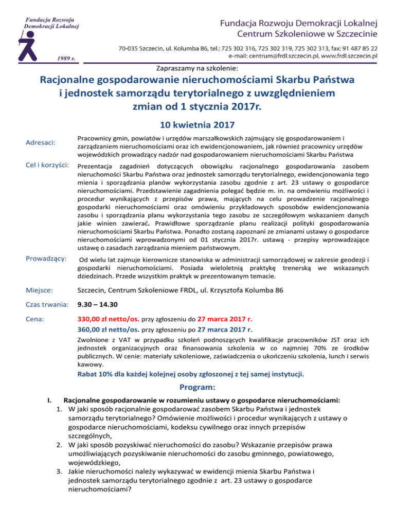 Zapraszamy na szkolenie: Racjonalne gospodarowanie nieruchomościami Skarbu Państwa i jednostek samorządu terytorialnego z uwzględnieniem zmian od 1 stycznia 2017r. 10 kwietnia 2017 Pracownicy gmin, powiatów i urzędów marszałkowskich zajmujący się gospodarowaniem i zarządzaniem nieruchomościami oraz ich ewidencjonowaniem, jak również pracownicy urzędów wojewódzkich prowadzący nadzór nad gospodarowaniem nieruchomościami Skarbu Państwa Adresaci: Cel i korzyści: Prezentacja zagadnień dotyczących obowiązku racjonalnego gospodarowania zasobem nieruchomości Skarbu Państwa oraz jednostek samorządu terytorialnego, ewidencjonowania tego mienia i sporządzania planów wykorzystania zasobu zgodnie z art. 23 ustawy o gospodarce nieruchomościami. Przedstawienie zagadnienia polegać będzie m. in. na omówieniu możliwości i procedur wynikających z przepisów prawa, mających na celu prowadzenie racjonalnego gospodarki nieruchomościami oraz omówieniu przykładowych sposobów ewidencjonowania zasobu i sporządzania planu wykorzystania tego zasobu ze szczegółowym wskazaniem danych jakie winien zawierać. Prawidłowe sporządzanie planu realizacji polityki gospodarowania nieruchomościami Skarbu Państwa. Ponadto zostaną zapoznani ze zmianami ustawy o gospodarce nieruchomościami wprowadzonymi od 01 stycznia 2017r. ustawą - przepisy wprowadzające ustawę o zasadach zarządzania mieniem państwowym. Prowadzący: Od wielu lat zajmuje kierownicze stanowiska w administracji samorządowej w zakresie geodezji i gospodarki nieruchomościami. Posiada wieloletnią praktykę trenerską we wskazanych dziedzinach. Przede wszystkim praktyk w prezentowanym temacie. Miejsce: Szczecin, Centrum Szkoleniowe FRDL, ul. Krzysztofa Kolumba 86 Czas trwania: 9.30 – 14.30 Cena: 330,00 zł netto/os. przy zgłoszeniu do 27 marca 2017 r. 360,00 zł netto/os. przy zgłoszeniu po 27 marca 2017 r. Zwolnione z VAT w przypadku szkoleń podnoszących kwalifikacje pracowników JST oraz ich jednostek organizacyjnych oraz finansowania szkolenia w co najmniej 70% ze środków publicznych. W cenie: materiały szkoleniowe, zaświadczenia o ukończeniu szkolenia, lunch i serwis kawowy. Rabat 10% dla każdej kolejnej osoby zgłoszonej z tej samej instytucji. Program: I. Racjonalne gospodarowanie w rozumieniu ustawy o gospodarce nieruchomościami: 1. W jaki sposób racjonalnie gospodarować zasobem Skarbu Państwa i jednostek samorządu terytorialnego? Omówienie możliwości i procedur wynikających z ustawy o gospodarce nieruchomościami, kodeksu cywilnego oraz innych przepisów szczególnych, 2. W jaki sposób pozyskiwać nieruchomości do zasobu? Wskazanie przepisów prawa umożliwiających pozyskiwanie nieruchomości do zasobu gminnego, powiatowego, wojewódzkiego, 3. Jakie nieruchomości należy wykazywać w ewidencji mienia Skarbu Państwa i jednostek samorządu terytorialnego zgodnie z art. 23 ustawy o gospodarce nieruchomościami? 4. Jakich nieruchomości nie ewidencjonuje w zasobie Skarbu Państwa starosta wykonujący zadania z zakresu administracji rządowej? Omówienie m.in. specyfiki wód płynących, lasów, gruntów rolnych i wojskowych oraz nieruchomości, które z mocy prawa stały się gminne, a co do których Wojewoda nie wydał decyzji komunalizacyjnych. 5. Ewidencjonowanie wartości nieruchomości – wartość rynkowa a wartość księgowa, 6. Dlaczego tak ważne jest prawidłowe ewidencjonowanie mienia publicznego? 7. Ewidencjonowanie użytkowania wieczystego – szczegółowe omówienie, przykłady rozwiązań, 8. Ewidencjonowanie zasobu SP i JST wraz z trwałym zarządem – szczegółowe omówienie, przykłady rozwiązań, 9. Ewidencjonowanie ograniczonych praw rzeczowych, praw zobowiązaniowych oraz posiadania, 10. Informatyzacja zasobu mienia Skarbu Państwa i JST, 11. Jak prawidłowo sporządzić oraz co powinna zawierać informacja o stanie mienia komunalnego sporządzana na podstawie ustawy o finansach publicznych? 12. Sprawozdania roczne do Wojewody z gospodarowania zasobem Skarbu Państwa, 13. Co to jest plan wykorzystania zasobu i po co się go sporządza? 14. Obowiązek wójta, zarządu powiatu, zarządu województwa oraz starosty do sporządzenia planów wykorzystania zasobu, 15. Jak prawidłowo sporządzić plan wykorzystania zasobu? 16. Co powinien zawierać plan wykorzystania zasobu, 17. Ramy czasowe sporządzania planu, 18. Rola prawidłowego ewidencjonowania mienia w sporządzaniu planu, 19. Zatwierdzenie planu wykorzystania zasobu, 20. Kontrole NIK w zakresie obowiązku wykorzystania zasobu, sankcje, odpowiedzialność. II. Zmiany od 01 stycznia 2017r. do ustawy o gospodarce nieruchomościami: 1. Omówienie zmian w gospodarowaniu mieniem publicznym wprowadzonych ustawą przepisy wprowadzające ustawę o zasadach zarządzania mieniem państwowym, 2. Omówienie nowych obowiązków w zakresie gospodarowania nieruchomościami Skarbu Państwa nałożonymi na starostę od 1 stycznia 2017r. m.in. dotyczących przekazywania informacji o zmianach w zasobie Skarbu Państwa, sporządzania planu realizacji polityki gospodarowania nieruchomościami Skarbu Państwa i in. 3. Omówienie nowych kompetencji wojewody w zakresie nadzoru nad gospodarowaniem nieruchomościami Skarbu Państwa, 4. Omówienie nowych kompetencji ministra właściwego do spraw budownictwa, planowania i zagospodarowania przestrzennego oraz mieszkalnictwa w zakresie gospodarowania nieruchomościami Skarbu Państwa, 5. Omówienie zmian dotyczących procedur: - zbywania nieruchomości, - ustanawiania i wygaszania trwałego zarządu 6. Dyskusja.