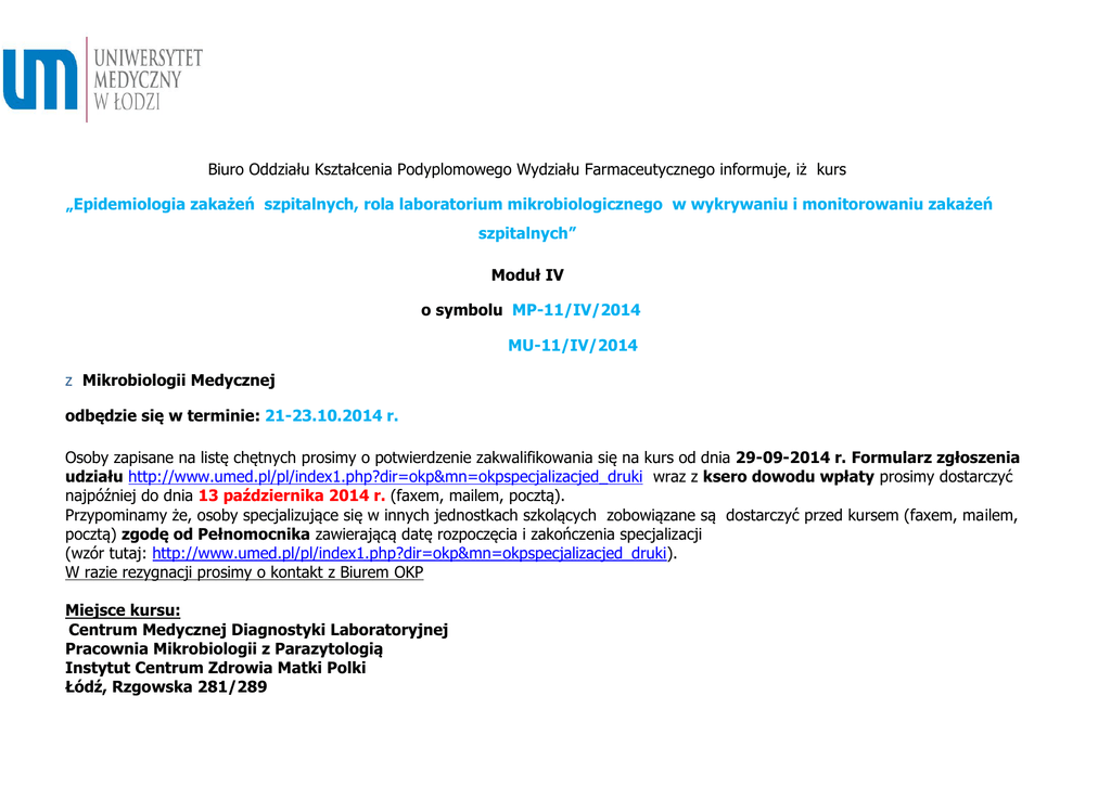Biuro Oddziału Kształcenia Podyplomowego Wydziału Farmaceutycznego informuje, iż kurs „Epidemiologia zakażeń szpitalnych, rola laboratorium mikrobiologicznego w wykrywaniu i monitorowaniu zakażeń szpitalnych” Moduł IV o symbolu MP-11/IV/2014 MU-11/IV/2014 z Mikrobiologii Medycznej odbędzie się w terminie: 21-23.10.2014 r. Osoby zapisane na listę chętnych prosimy o potwierdzenie zakwalifikowania się na kurs od dnia 29-09-2014 r. Formularz zgłoszenia udziału http://www.umed.pl/pl/index1.php?dir=okp&mn=okpspecjalizacjed_druki wraz z ksero dowodu wpłaty prosimy dostarczyć najpóźniej do dnia 13 października 2014 r. (faxem, mailem, pocztą). Przypominamy że, osoby specjalizujące się w innych jednostkach szkolących zobowiązane są dostarczyć przed kursem (faxem, mailem, pocztą) zgodę od Pełnomocnika zawierającą datę rozpoczęcia i zakończenia specjalizacji (wzór tutaj: http://www.umed.pl/pl/index1.php?dir=okp&mn=okpspecjalizacjed_druki). W razie rezygnacji prosimy o kontakt z Biurem OKP Miejsce kursu: Centrum Medycznej Diagnostyki Laboratoryjnej Pracownia Mikrobiologii z Parazytologią Instytut Centrum Zdrowia Matki Polki Łódź, Rzgowska 281/289 *wg programu zajęć przedstawionego poniżej) UWAGA SPECJALIZUJĄCY! Koszt kursu: 400,00 zł Opłaty winny być wpłacane wyłącznie na konto: Uniwersytet Medyczny, Al. Kościuszki 4, 90-419 Łódź, ING BANK ŚLĄSKI ŁÓDŹ UWAGA NOWY NUMER KONTA : 30 1050 0099 6364 1111 1111 1111 KONIECZNIE : w rubryce tytułem należy podać symbol kursu oraz dopisek 708-04- 078 Prosimy o dokładne i czytelne wypełnienie formularza, włącznie z aktualnym numerem telefonu, datą i podpisem – umożliwi to szybkie przekazanie informacji w przypadku wszelkich zmian. W przypadku rezygnacji z udziału w szkoleniu prosimy o niezwłoczne zawiadomienie o tym pracowników Biuro Oddziału Kształcenia Podyplomowego. Osoby zainteresowane otrzymaniem FAKTURY wystawionej przez UM dla podmiotu gospodarczego opłacającego szkolenie powinny wypełnić druk przelewu/ wpłaty gotówkowej podając w rubryce nazwa zleceniodawcy- nazwę i adres podmiotu gospodarczego, a w rubryce tytułem dodatkowo obok w/w : nazwisko i imię kursanta. Osoby fizyczne wypełniają druk podając swoje dane, a jeśli chcą otrzymać fakturę w rubryce tytułem obok symbolu kursu i dopisku 708-04- 078 zamieszczają dopisek Faktura. Podstawą do wystawienia faktury jest druk wpłaty (nie formularz zgłoszeniowy). Prawidłowo wypełniony druk wpłaty powinien zawierać wszystkie powyżej podane dane. Nazwa wpisanego podmiotu gospodarczego na druku wpłaty musi być zgodna z danymi na formularzu zgłoszenia. Na druku wpłaty nie ma konieczności wpisywania NIP. RAMOWY PROGRAM ZAJĘĆ Dzień 21.10.2014 09:00-10:30 Wykłady Wykładowca Ćwiczenia (w grupach 5-osobowych) 1.Od Ignacego Semmelweisa do „czystych rąk” – zakażenia szpitalne w ujęciu historycznym dr Ewa Śpiewak 2x45min 10:30-12:00 2. Definicja zakażenia szpitalnego, rozpoznawanie, częstość występowania , czynniki ryzyka, postacie dr Anna Ciebiada Adamiec 2x45min 13:30-15:00 Pobieranie próbek odciskowych, wymazów środowiskowych badanie powietrza, ocena czystości rąk, posiewy w kierunku nosicielstwa 12:00-12:45 3. Patogeny odpowiedzialne za zakażenia szpitalne mgr Małgorzata Szczypkowska 1x45min 12:45-13:30 4. Rodzaje próbek pochodzących z oddziałów, sposoby badań dr Marzena Grab 1x45min Marzena Grab 2X45min Małgorzata Szczypkowska 2x45 min Agnieszka Seraficka 2x45 min Anna Ciebiada Adamiec 2x45 min Dzień 22.10.2014 09:00-09:45 Wykłady Wykładowca Ćwiczenia (w grupach 5-osobowych) 1.Zakażenia szpitalne w oddziałach intensywnej terapii, mgr Agnieszka Seraficka 1x45min 09:45-10:30 2.Zakazenia w oddziałach chirurgii mgr Małgorzata Szczypkowska 1x45min 13:30-15:00 Ocena posiewów , izolacje drobnoustrojów, testy dodatkowe, nastawianie testów wykrywających mechanizmy oporności 10:30-11:15 3.Zakażenia szpitalne w oddziałach hematologii, transplantologii mgr Agnieszka Seraficka 1x45min 11:15-12:00 4. Zakażenia w oddziałach neonatologicznych mgr Małgorzata Szczypkowska 1x45min 12:00-12:45 5. Zasady oceny posiewów, wykonywania testów dodatkowych dr Marzena Grab 1x45min 12:45-13:30 6. Mechanizmy oporności mgr Agnieszka Seraficka 1x45min Dzień 23.10.2014 09:00-09:45 Wykłady Wykładowca Ćwiczenia (w grupach 5-osobowych) 1. Organizacja systemu kontroli zakażeń szpitalnych , metody rejestracji, przetwarzania i analiza danych dr Marzena Grab 1x45min 13:30-15:00 Interpreatcja wyników, wykonanie raportów 09:45-11:15 2.Dochodzenie epidemiologiczne lek Anetta Bartczak 2x45min 11:15-12:00 3.Zapobiegania zakażeniom szpitalnym dr Marzena Grab 1x45min 12:00-13:30 4. Zakażenia szpitalne w Polsce i na świecie dr Anna Ciebiada Adamiec 2x45min Marzena Grab 2X45min Małgorzata Szczypkowska 2x45 min Agnieszka Seraficka 2x45 min Anna Ciebiada Adamiec 2x45 min 15:00-16:30 5.Zaliczenie kursu dr Anna Ciebiada Adamiec 2x45min *BOKPWF zastrzega iż program może ulec zmianie Marzena Grab 2X45min Małgorzata Szczypkowska 2x45 min Agnieszka Seraficka 2x45 min Anna Ciebiada Adamiec 2x45 min