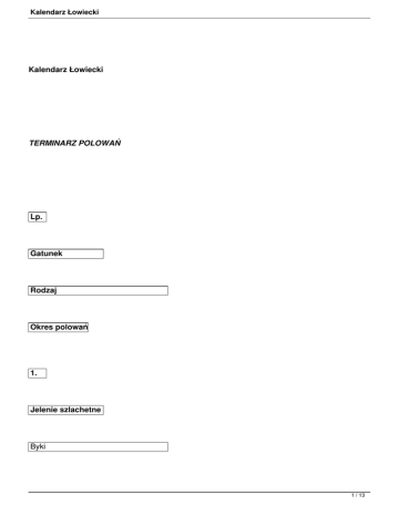 Kalendarz Łowiecki Kalendarz Łowiecki TERMINARZ POLOWAŃ Lp. Gatunek Rodzaj Okres polowań 1. Jelenie szlachetne Byki 1 / 13 Kalendarz Łowiecki 21.08 - 28.02 Łanie 01.10 - 15.01 Cielęta 01.10 - 28.02 2. Jelenie sika Byki 01.10 - 15.01 Łanie 01.10 - 15.01 2 / 13 Kalendarz Łowiecki Cielęta 01.10 - 15.01 3. Daniele Byki 01.10 - 31.01 Łanie 01.10 - 15.01 Cielęta 01.10 - 15.01 3 / 13 Kalendarz Łowiecki 4. Sarny Kozły 11.05 - 30.09 Kozy 01.10 - 15.01 Koźlęta 01.10 - 15.01 5. Dziki Odyńce, wycinki, przelatki i warchlaki 4 / 13 Kalendarz Łowiecki cały rok Lochy 15.08 - 15.01 6. Muflony Tryki 01.10 - 28.02 Owce 01.10 - 15.01 Jagnięta 01.10 - 15.01 5 / 13 Kalendarz Łowiecki 7. Borsuki 01.09 - 30.11 w obw. z głuszcem i cietrzewiem cały rok 8. Tchórze i kuny (domowe i leśne) 01.09 - 31.03 6 / 13 Kalendarz Łowiecki w obw. z głuszcem i cietrzewiem cały rok 9. Norki amerykańskie, jenoty, szopy pracze cały rok 10. Lisy 01.06 - 31.03 w obw. z głuszcem i cietrzewiem i na terenach obw. w których w ostatnich 2 latach prowadzono zasiedla 7 / 13 Kalendarz Łowiecki cały rok 11. Piżmaki 11.08 - 15.04 na terenach rybackich obrębów hodowlanych cały rok 12. Zające, szaraki i dzikie króliki 01.11 - 31-12 8 / 13 Kalendarz Łowiecki w drodze odłowów 01.11 - 15.01 13. Bażanty Koguty 01.10 - 28.02 Kury - wyłącznie na terenach hodowlanych z wolierową hodowlą bażanta 01.10 - 31.01 14. Kuropatwy 9 / 13 Kalendarz Łowiecki 11.09 - 21.10 w drodze odłowów 11.09 - 15.01 15. Kaczki Krzyżówki, cyraneczki, głowienki i czernice) 15.08 - 21.12 16. Gęsi Zbożowe i białoczelne 01.09 - 21.12 10 / 13 Kalendarz Łowiecki na terenie woj. zachodniopomorskiego, wielkopolskiego i dolnośląskiego 01.09 -31.01 Gęgawę 01.09 - 21.12 na terenie woj. Zachodniopomorskiego, lubuskiego, wielkopolskiego i dolnośląskiego 01.09 - 15.01 17. Łyski 15.08 - 21.12 11 / 13 Kalendarz Łowiecki 18. Gołębie grzywacze 15.08 - 30.11 19. Słonki 01.09 - 21.12 20. Jarząbki 12 / 13 Kalendarz Łowiecki 01.09 - 30.11 Uwaga! Jeżeli początek okresu polowań przypada bezpośrednio po dniu lub dniach wolnych od pracy, okres ten rozpoczyna się pierwszego dnia wolnego od pracy. Jeżeli koniec okresu polowań przypada na dzień poprzedzający dzień wolny od pracy, okres ten upływa z ostatnim dniem wolnym od pracy. Przy ustaleniu okresu polowań przyjmuje się, że dni wolne od pracy to niedziele i święta określone w odrębnych przepisach o dniach wolnych od pracy oraz soboty. Łosie (byki, klępy, łoszaki) obejmuje się całoroczną ochroną. 13 / 13