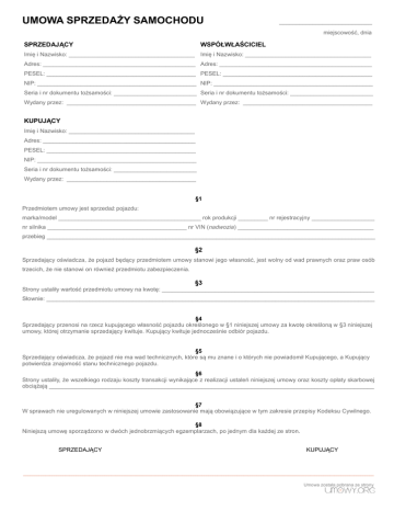 UMOWA SPRZEDAŻY SAMOCHODU ____________________________ miejscowość, dnia SPRZEDAJĄCY WSPÓŁWŁAŚCICIEL Imię i Nazwisko: ______________________________________ Imię i Nazwisko: ______________________________________ Adres: ______________________________________________ Adres: ______________________________________________ PESEL: _____________________________________________ PESEL: _____________________________________________ NIP: ________________________________________________ NIP: ________________________________________________ Seria i nr dokumentu tożsamości: _________________________ Seria i nr dokumentu tożsamości: _________________________ Wydany przez: _______________________________________ Wydany przez: _______________________________________ KUPUJĄCY Imię i Nazwisko: ______________________________________ Adres: ______________________________________________ PESEL: _____________________________________________ NIP: ________________________________________________ Seria i nr dokumentu tożsamości: _________________________ Wydany przez: _______________________________________ §1 Przedmiotem umowy jest sprzedaż pojazdu: marka/model ___________________________________________ rok produkcji _________ nr rejestracyjny ___________________ nr silnika __________________________________________ nr VIN (nadwozia) _________________________________________ przebieg ___________________________________________________________________________________________________ §2 Sprzedający oświadcza, że pojazd będący przedmiotem umowy stanowi jego własność, jest wolny od wad prawnych oraz praw osób trzecich, że nie stanowi on również przedmiotu zabezpieczenia. §3 Strony ustaliły wartość przedmiotu umowy na kwotę: ________________________________________________________________ Słownie: ___________________________________________________________________________________________________ §4 Sprzedający przenosi na rzecz kupującego własność pojazdu określonego w §1 niniejszej umowy za kwotę określoną w §3 niniejszej umowy, której otrzymanie sprzedający kwituje. Kupujący kwituje jednocześnie odbiór pojazdu. §5 Sprzedający oświadcza, że pojazd nie ma wad technicznych, które są mu znane i o których nie powiadomił Kupującego, a Kupujący potwierdza znajomość stanu technicznego pojazdu. §6 Strony ustaliły, że wszelkiego rodzaju koszty transakcji wynikające z realizacji ustaleń niniejszej umowy oraz koszty opłaty skarbowej obciążają __________________________________________________________________________________________________ §7 W sprawach nie uregulowanych w niniejszej umowie zastosowanie mają obowiązujące w tym zakresie przepisy Kodeksu Cywilnego. §8 Niniejszą umowę sporządzono w dwóch jednobrzmiących egzemplarzach, po jednym dla każdej ze stron. SPRZEDAJĄCY KUPUJĄCY _______________________________________________________________________________________________________________________________________________________________ Umowa została pobrana ze strony