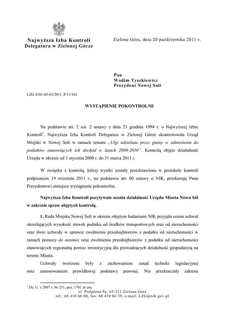 Zielona Góra, dnia 20 października 2011 r. Najwyższa Izba Kontroli Delegatura w Zielonej Górze Pan Wadim Tyszkiewicz Prezydent Nowej Soli LZG-4101-05-03/2011, P/11/163 WYSTĄPIENIE POKONTROLNE Na podstawie art. 2 ust. 2 ustawy z dnia 23 grudnia 1994 r. o Najwyższej Izbie Kontroli1, Najwyższa Izba Kontroli Delegatura w Zielonej Górze skontrolowała Urząd Miejski w Nowej Soli w ramach tematu „Ulgi udzielane przez gminy w odniesieniu do podatków stanowiących ich dochód w latach 2008-2010”. Kontrolą objęto działalność Urzędu w okresie od 1 stycznia 2008 r. do 31 marca 2011 r. W związku z kontrolą, której wyniki zostały przedstawione w protokole kontroli podpisanym 19 września 2011 r., na podstawie art. 60 ustawy o NIK, przekazuję Panu Prezydentowi niniejsze wystąpienie pokontrolne. Najwyższa Izba Kontroli pozytywnie ocenia działalność Urzędu Miasta Nowa Sól w zakresie spraw objętych kontrolą. 1. Rada Miejska Nowej Soli w okresie objętym badaniami NIK przyjęła osiem uchwał określających wysokość stawek podatku od środków transportowych oraz od nieruchomości oraz dwie uchwały w sprawie zwolnienia przedsiębiorców z podatku od nieruchomości w ramach pomocy de minimis oraz zwolnienia przedsiębiorców z podatku od nieruchomości stanowiących regionalną pomoc inwestycyjną dla prowadzących działalność gospodarczą na terenie Miasta. Uchwały oraz 1 tworzone zastosowaniem były prawidłowej z zachowaniem podstawy zasad prawnej. Nie techniki legislacyjnej przekraczały Dz. U. z 2007 r. Nr 231, poz. 1701 ze zm. ul. Podgórna 9a, 65-213 Zielona Góra tel.: 68 410 66 00, fax: 68 410 66 39, e-mail: [email protected] zakresu szczegółowego upoważnienia zawartego w odpowiedniej ustawie i nie zawierały niedozwolonych zapisów subdelegujących. Stawki podatków określone w gminnych uchwałach podatkowych mieściły się w granicach ustalonych przez Ministra Finansów, w obwieszczeniach w sprawie górnych granic stawek kwotowych podatków i opłat lokalnych. Nie wystąpiły przypadki obniżenia stawki podatkowej do „0”, tzw. ukrytego zwolnienia podmiotowego ani zwolnień podatkowych częściowych. Uchwalane były w terminach umożliwiających wejście ich w życie wraz z nowym rokiem podatkowym oraz publikowane w Dzienniku Urzędowym Województwa Lubuskiego. 2. Analizie poddano 15 wydanych przez Pana Prezydenta i osoby przez Pana upoważnione, decyzji pozytywnych w zakresie udzielania ulg indywidualnych przedsiębiorcom na łączną kwotę 1.576.343,37 zł i wszystkie (siedem) negatywne w ww. zakresie na łączną kwotę 356.748 zł. Większość decyzji przyznających ulgę (142) dotyczyła odroczenia terminu płatności zaległego podatku od nieruchomości bądź rozłożenia go na raty. Zastosowano więc instytucje znacząco mniej dolegliwe dla finansów gminy, niż umarzanie zaległości podatkowych, zwłaszcza że skorzystano z uprawnień jakie daje art. 57 § 7 Ordynacji podatkowej3 i na podstawie podjętej przez Radę Miasta uchwały, każdorazowo pobierano z tytułu zastosowania ww. ulg opłatę prolongacyjną w wysokości 25% kwoty odsetek za zwłokę. Na pozytywna ocenę zasługuje także fakt, że sprawy ulg podatkowych, z uwagi na ich znaczenie dla uzyskiwania dochodów gminy, były omawiane na posiedzeniach Kolegium Prezydenta - organu konsultacyjno-doradczego powołanego do rozpatrywania ważnych dla Miasta spraw. W przypadku pięciu decyzji na łączną kwotę 140.638,4 zł stwierdzono jednak rozbieżności pomiędzy wnioskowaną, a udzieloną formą ulgi. Zgodnie z utrwalonym poglądem doktryny w tym zakresie „organ podatkowy jest związany treścią wniosku w tym sensie, że nie może zastosować innej ulgi niż ta, o którą prosi podatnik4. Z wyjaśnień Skarbnika Miasta wynikało, że w toku postępowania podatkowego uzgadniano z podatnikami „najlepsze rozwiązania” umożliwiające wywiązanie się z obowiązków wobec gminy. Ustalenie te, oraz zmiana wniosku podatnika nie zostały jednak udokumentowane, co naruszało zasadę pisemności postępowania określoną art. 126 Ordynacji podatkowej. Ponadto ustalono, że 2 spośród 6 podatników, którym odroczono termin płatności odsetek w łącznej kwocie 860 zł nie wywiązało się z ich zapłaty. Kwoty nie uregulowanych 2 Łączna kwota decyzji – 1.516.660,87 zł Dz.U. z 2005 r. Nr 8 poz. 60 ze zm. 4 Komentarz do art. 67a ustawy Ordynacja podatkowa; L. Etel, C. Kosikowski i in., LEX 2011 3 2 odsetek nie odnotowano na kontach rozrachunkowych podatników i nie podjęto działań mających na celu wyegzekwowanie ww. kwoty. Dopiero w toku kontroli NIK podjęto stosowne działania. W pozostałym zakresie nie stwierdzono naruszenia przepisów Ordynacji podatkowej. 3. W sierpniu 2009 r. Prezydent ustalił procedury kontroli pobierania i gromadzenia środków publicznych oraz realizacji wydatków. W Urzędzie zatrudnieni są audytor wewnętrzny, realizujący przyjęty plan audytu oraz główny specjalista kontroli wewnętrznej Przedstawiając powyższe oceny i uwagi, oraz uwzględniając już zrealizowane przez Urząd działania, Najwyższa Izba Kontroli wnosi o pełne dokumentowanie postępowania podatkowego w zakresie modyfikacji wniosków podatników o udzielenie ulgi. Najwyższa Izba Kontroli Delegatura w Zielonej Górze, na podstawie art. 62 ust. 1 ustawy o NIK, oczekuje przedstawienia przez Pana Prezydenta, w terminie 14 dni od daty otrzymania niniejszego wystąpienia pokontrolnego, informacji o sposobie wykorzystania uwag i wykonania wniosku, bądź o działaniach podjętych w celu realizacji wniosku lub przyczynach niepodjęcia takich działań. Zgodnie z treścią art. 61 ustawy o NIK, w terminie 7 dni od daty otrzymania niniejszego wystąpienia pokontrolnego przysługuje Panu prawo zgłoszenia na piśmie do dyrektora Delegatury NIK w Zielonej Górze umotywowanych zastrzeżeń w sprawie ocen, uwag i wniosku zawartych w tym wystąpieniu. W razie zgłoszenia zastrze