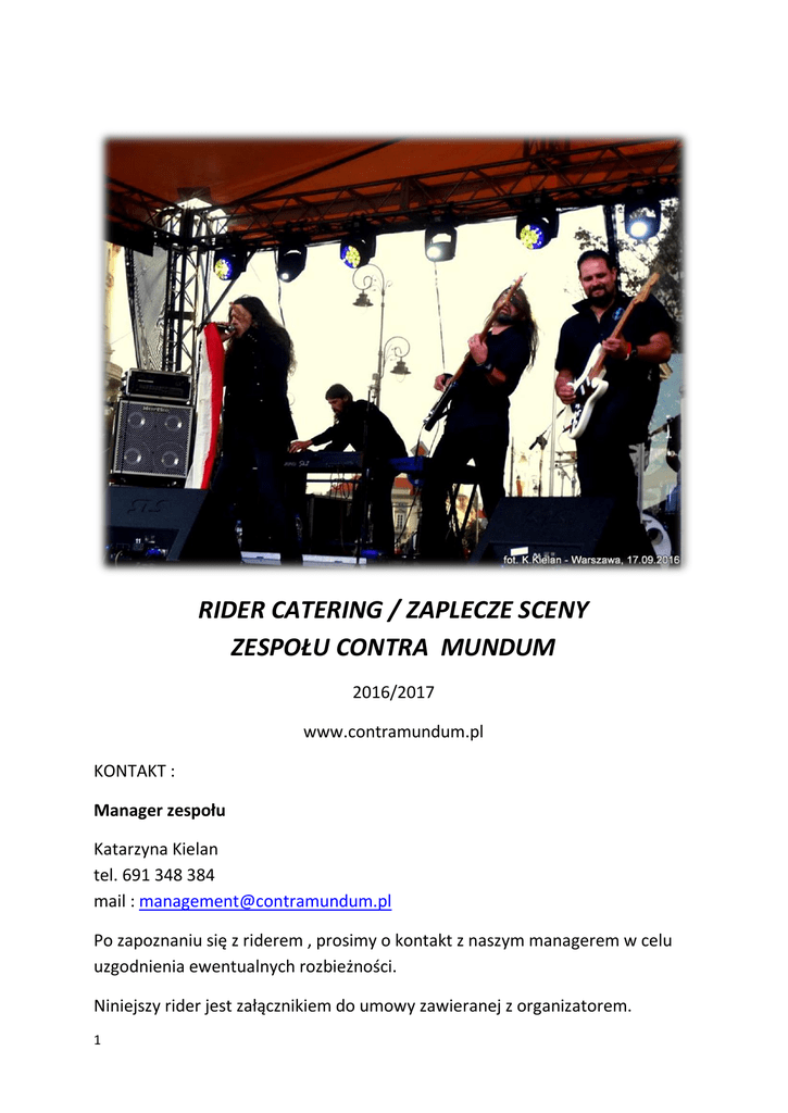 RIDER CATERING / ZAPLECZE SCENY ZESPOŁU CONTRA MUNDUM 2016/2017 www.contramundum.pl KONTAKT : Manager zespołu Katarzyna Kielan tel. 691 348 384 mail : [email protected] Po zapoznaniu się z riderem , prosimy o kontakt z naszym managerem w celu uzgodnienia ewentualnych rozbieżności. Niniejszy rider jest załącznikiem do umowy zawieranej z organizatorem. 1 Zaplecze sceny Prosimy o zabezpieczenie zaplecza sceny tak , aby miały do niego dostęp tylko osoby upoważnione . Garderoba Prosimy o przygotowanie garderoby z dostępem do gniazda 230V, zamykanej na klucz , z dostępem bezpośrednim do toalety , bieżącej zimnej i ciepłej wody , wyposażonej w niezbędne przybory higieniczne . W garderobie prosimy o osiem krzeseł , lustra , wieszaki na stroje, kosze i worki na śmieci , ręczniki papierowe . Przejście z garderoby na scenę powinno być osłonięte przed publicznością . W przypadku imprez plenerowych garderobę może stanowić namiot osłonięty ze wszystkich stron oraz pilnowany przez ochroniarza przez cały czas obecności zespołu na miejscu . W garderobie namiotowej powinien być dostęp do gniazdka 230 V oraz światło . Garderoba powinna być tak przygotowana , aby w odległości ok 30 metrów była toaleta dostępna dla członków zespołu . Catering Bardzo prosimy o dostarczenie do garderoby zespołu : Wody mineralnej niegazowanej ( ok 4 litry do dyspozycji w garderobie oraz ok 12 butelek x 0.5 litra do dyspozycji na scenie ) , kawy rozpuszczalnej , kawy mielonej , herbaty , cukru , mleka , cytryn, a także ciepłego posiłku dla ośmiu osób lub przekąsek . Jeżeli koncert zespołu jest elementem zaplanowanej trasy lub odbywa się w znacznej odległości od siedziby zespołu – prosimy organizatora o zapewnienie noclegu z wyżywieniem dla wszystkich jego członków . Szczegóły dotyczące noclegu prosimy ustalać z naszym managerem . 2 PROMOCJA Prosimy , aby organizator zadbał we własnym zakresie o materiały promocyjne dotyczące koncertu . Do przygotowania reklamy udostępniamy organizatorowi nasze logotypy oraz materiały graficzne przekazane poprzez managera zespołu . Mile widziana jest konsultacja z managerem w sprawie projektów przygotowywanych materiałów promocyjnych . WSPÓŁPRACA Chętnie współpracujemy z firmami : BMG PRO Audio Warszawa Remix1 Remigiusz Białas Ząbkowice Śląskie Pro Art. Dariusz Śmigiel Rzeszów Sound Proo Michał Kowalski Kraków Projekty i Realizacja Światła Grzegorz Prusinowski Ostrołęka 3 4