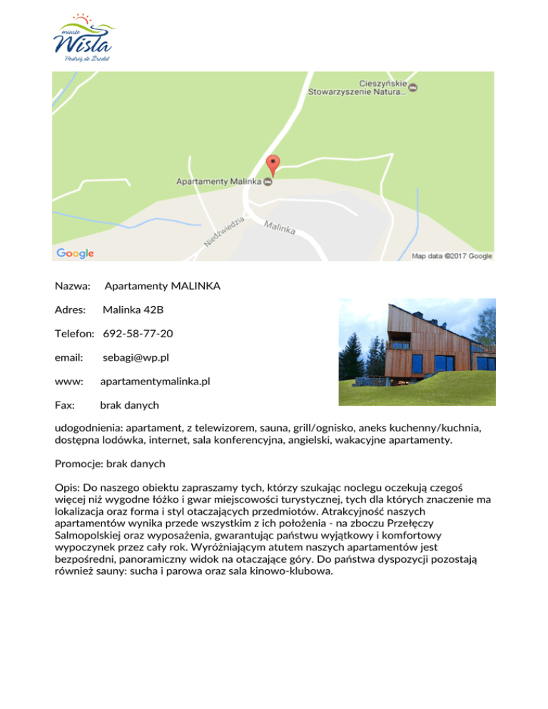 Nazwa: Apartamenty MALINKA Adres: Malinka 42B Telefon: 692-58-77-20 email: [email protected] www: apartamentymalinka.pl Fax: brak danych udogodnienia: apartament, z telewizorem, sauna, grill/ognisko, aneks kuchenny/kuchnia, dostępna lodówka, internet, sala konferencyjna, angielski, wakacyjne apartamenty. Promocje: brak danych Opis: Do naszego obiektu zapraszamy tych, którzy szukając noclegu oczekują czegoś więcej niż wygodne łóżko i gwar miejscowości turystycznej, tych dla których znaczenie ma lokalizacja oraz forma i styl otaczających przedmiotów. Atrakcyjność naszych apartamentów wynika przede wszystkim z ich położenia - na zboczu Przełęczy Salmopolskiej oraz wyposażenia, gwarantując państwu wyjątkowy i komfortowy wypoczynek przez cały rok. Wyróżniającym atutem naszych apartamentów jest bezpośredni, panoramiczny widok na otaczające góry. Do państwa dyspozycji pozostają również sauny: sucha i parowa oraz sala kinowo-klubowa.