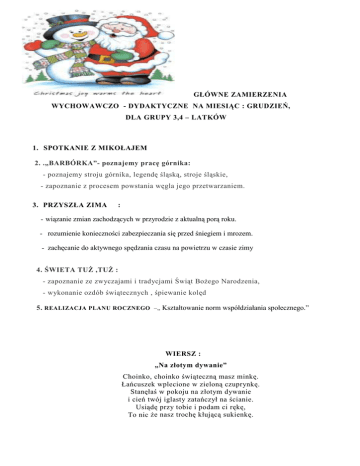 GŁÓWNE ZAMIERZENIA WYCHOWAWCZO - DYDAKTYCZNE NA MIESIĄC : GRUDZIEŃ, DLA GRUPY 3,4 – LATKÓW 1. SPOTKANIE Z MIKOŁAJEM 2. .„BARBÓRKA”- poznajemy pracę górnika: - poznajemy stroju górnika, legendę śląską, stroje śląskie, - zapoznanie z procesem powstania węgla jego przetwarzaniem. 3. PRZYSZŁA ZIMA : - wiązanie zmian zachodzących w przyrodzie z aktualną porą roku. - rozumienie konieczności zabezpieczania się przed śniegiem i mrozem. - zachęcanie do aktywnego spędzania czasu na powietrzu w czasie zimy 4. ŚWIETA TUś ,TUś : - zapoznanie ze zwyczajami i tradycjami Świąt BoŜego Narodzenia, - wykonanie ozdób świątecznych , śpiewanie kolęd 5. REALIZACJA PLANU ROCZNEGO –„ Kształtowanie norm współdziałania społecznego.” WIERSZ : „Na złotym dywanie” Choinko, choinko świąteczną masz minkę. Łańcuszek wplecione w zieloną czuprynkę. Stanęłaś w pokoju na złotym dywanie i cień twój iglasty zatańczył na ścianie. Usiądę przy tobie i podam ci rękę, To nic Ŝe nasz trochę kłującą sukienkę. ZAMIERZENIA WYCHOWAWCZO – DYDAKTYCZNE NA MIESIĄC GRUDZIEŃ DLA GRUPY 5-6 LATKÓW 1. „Górnik”- poznanie osoby górnika i zawodu jaki wykonuje. Poznanie procesu powstawania węgla. Zaprezentowanie przedmiotów, które powstają z procesu przetworzenia węgla. 2. Mikołaj w przedszkolu- powitanie gościa, zaprezentowanie się na forum, rozdanie prezentów, wspólna zabawa. 3. „Koty domowe i dzikie”- Zapoznanie z wyglądem i zwyczajami kotów domowych i dzikich. Rozumienie potrzeby ponoszenia odpowiedzialności za zwierzęta domowe i konieczności opiekowania się nimi. 4. „Coraz bliŜej święta”- Poznanie tradycji i zwyczajów Świąt BoŜego Narodzenia: przedświąteczne porządki, Wigilia, śpiewanie kolęd, dzielenie się opłatkiem, składanie Ŝyczeń, strojenie choinki. Zaprezentowanie się z programem Jasełek. Piosenka „Śpij Jezusku śpij” 1. Urodziłeś się w stajence, zimnej i ubogiej. Tylko lśniąca gwiazda złota, wskazała nam drogę. Wiersz Wiszą bombki na choince, całe kolorowe. Małe pieski, małe kotki, gwiazdki purpurowe. Śpij Jezusku śpij. Śnij, Dziecinko, śnij. Wiszą szyszki i orzeszki, malutkie jabłuszka. My – aniołki twe, Dwa jeŜe, muchomorki, Do snu tulimy Cię. czerwone serduszka. W blasku lampek teraz stoi, 2. My anioły- słudzy Twoi, bieŜymy do Ciebie. Tyś nam Panem, tyś nam Bogiem, naszym przyjacielem. 3. Śpij Jezusku, my czuwamy, od złego chronimy. A gdy Ty urośniesz BoŜe, to nam dopomoŜesz. pięknem nas urzeka. Przypomina wróŜkę z bajki i Wigilii czeka. Plan Pracy na miesiąc GRUDZIEŃ grupa 5, 6-latki Zadania wychowawczo – dydaktyczne. 1. PomóŜmy głodnym zwierzętom – pogłębianie doświadczeń z zakresu poznawania przyrody, dostrzeganie zmian zachodzących w przyrodzie w okresie zim, konieczność dokarmiania ptaków i zwierząt w okresie zimy 2. Mikołaju czekamy! zapoznanie z tradycjami związanymi z mikołajkami. 3. Święta tuŜ-tuŜ - rozwijanie wiedzy o tradycjach i zwyczajach świąt BoŜego Narodzenia, uświadomienie konieczności pielęgnowania tradycji świątecznych 4. Coraz bliŜej święta. Przygotowywanie się do świąt. Wprowadzenie radosnego nastroju. Wiersz Piosenka Święty Mikołaj W mroźną noc grudniową Wśród śnieŜnej zamieci Para reniferów Z nieba do nas leci PUK, PUK, PUK 1. Puk, puk, puk do drzwi stuka ktoś. Dzyń, dzyń, dzyń radośnie dzwoni gość. Otwieram drzwi do jesteś ty, czekałem tyle dni. Więc usiądź tu i rozgość się, a ja zaśpiewam Ci. Ref.: Mój kochany Mikołaju cały rok czekałem byłem bardzo, bardzo grzeczny, bardzo się starałem. 2. Ha, ha, ha twój śmiech miło brzmi. Hi, hi, hi radośnie dzisiaj mi. Otwierasz mu prezentów sznur przyniosłeś wiele mi. Więc cieszę się, tak miło jest, zaśpiewam znowu Ci. Ciągną piękne sanie W złocistym zaprzęgu A w saniach Mikołaj I worek prezentów Przyjdź do nas w gościnę Szczerze zapraszamy Wierszyk Ci powiemy Piosenkę zaśpiewamy