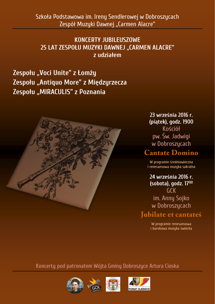 Szkoła Podstawowa im. Ireny Sendlerowej w Dobroszycach Zespół Muzyki Dawnej „Carmen Alacre” KONCERTY JUBILEUSZOWE 25 LAT ZESPOŁU MUZYKI DAWNEJ „CARMEN ALACRE” z udziałem Zespołu „Voci Unite” z Łomży Zespołu „Antiquo More” z Międzyrzecza Zespołu „MIRACULIS” z Poznania 23 września 2016 r. (piątek), godz. 1900 Kościół pw. Św. Jadwigi w Dobroszycach W programie średniowieczna i renesansowa muzyka sakralna 24 września 2016 r. (sobota), godz. 1700 GCK im. Anny Sojko w Dobroszycach W programie renesansowa i barokowa muzyka świecka Koncerty pod patronatem Wójta Gminy Dobroszyce Artura Cioska