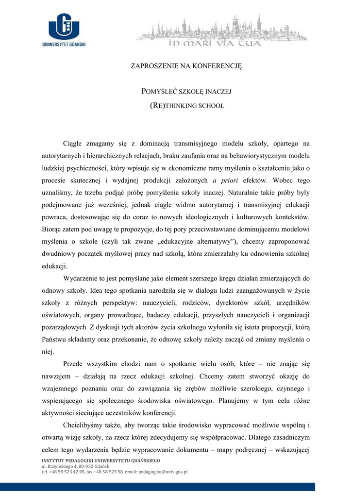 ZAPROSZENIE NA KONFERENCJĘ POMYŚLEĆ SZKOŁĘ INACZEJ (RE)THINKING SCHOOL Ciągle zmagamy się z dominacją transmisyjnego modelu szkoły, opartego na autorytarnych i hierarchicznych relacjach, braku zaufania oraz na behawiorystycznym modelu ludzkiej psychiczności, który wpisuje się w ekonomiczne ramy myślenia o kształceniu jako o procesie skutecznej i wydajnej produkcji założonych a priori efektów. Wobec tego uznaliśmy, że trzeba podjąć próbę pomyślenia szkoły inaczej. Naturalnie takie próby były podejmowane już wcześniej, jednak ciągle widmo autorytarnej i transmisyjnej edukacji powraca, dostosowując się do coraz to nowych ideologicznych i kulturowych kontekstów. Biorąc zatem pod uwagę te propozycje, do tej pory przeciwstawiane dominującemu modelowi myślenia o szkole (czyli tak zwane „edukacyjne alternatywy”), chcemy zaproponować dwudniowy początek myślowej pracy nad szkołą, która zmierzałaby ku odnowieniu szkolnej edukacji. Wydarzenie to jest pomyślane jako element szerszego kręgu działań zmierzających do odnowy szkoły. Idea tego spotkania narodziła się w dialogu ludzi zaangażowanych w życie szkoły z różnych perspektyw: nauczycieli, rodziców, dyrektorów szkół, urzędników oświatowych, organy prowadzące, badaczy edukacji, przyszłych nauczycieli i organizacji pozarządowych. Z dyskusji tych aktorów życia szkolnego wyłoniła się istota propozycji, którą Państwu składamy oraz przekonanie, że odnowę szkoły należy zacząć od zmiany myślenia o niej. Przede wszystkim chodzi nam o spotkanie wielu osób, które – nie znając się nawzajem – działają na rzecz edukacji szkolnej. Chcemy zatem stworzyć okazję do wzajemnego poznania oraz do zawiązania się zrębów możliwie szerokiego, czynnego i wspierającego się społecznego środowiska oświatowego. Planujemy w tym celu różne aktywności sieciujące uczestników konferencji. Chcielibyśmy także, aby tworząc takie środowisko wypracować możliwie wspólną i otwartą wizję szkoły, na rzecz której zdecydujemy się współpracować. Dlatego zasadniczym celem tego wydarzenia będzie wypracowanie dokumentu – mapy podręcznej – wskazującej INSTYTUT PEDAGOGIKI UNIWERSYTETU GDAŃSKIEGO ul. Bażyńskiego 4, 80-952 Gdańsk tel. +48 58 523 42 05, fax +48 58 523 58, email: [email protected] zasadnicze pola problemowe / wymiary funkcjonowania szkoły oraz propozycje ich organizacji, czy konceptualizacji, które mogłyby przyczynić się do odnowienia szkoły. Idzie o odpowiedzi na pytania: Co jest dzisiaj sprawą kluczową w pytaniu o szkołę? Na czym polegać miałaby istota zmiany szkoły / jej odnowienia? Jaki jest sens istnienia szkoły? Po co nam szkoła? Jakiej szkoły chcemy? Jak zabierać się do jej zmiany? Jak organizować zmianę szkoły? Czym dla nas jest szkoła? Co to znaczy „dobra szkoła”? Co to znaczy „dobra edukacja”? Nasza dwudniowa praca będzie się odbywać w różnych formach. Wykłady pięciu zaproszonych mówców mają na celu wprowadzenie inspirujących, niespotykanych szerzej, nowych wątków w myśleniu o szkole, które mają potencjał do przebudowy naszego o niej wyobrażenia. Swój udział potwierdzili: Ingeborg Müller – Hohagen Dr Joris Vlieghe Prof. Joanna Rutkowiak Prof. Dorota Klus – Stańska Dr hab. Piotr Laskowski Debata o sensie istnienia szkoły ma na celu zderzenie ze sobą różnych perspektyw oglądu szkoły, rozpoznanie jej wielowymiarowości i złożoności, ale także próbę budowania pomostów pomiędzy tymi różnicami i dogadywania się co do pryncypiów. Forum Dobrych Praktyk – to specjalny czas, w którym oprócz zaproszonych prezentacji wszyscy chętni uczestnicy Konferencji będą mogli zaprezentować w dowolnej formie (plakat, prezentacja multimedialna, film, wystąpienie ustne etc.) jak zmienili, bądź zmieniają szkołę na lepsze. Warsztaty mają na celu doświadczenie możliwości kierunków zmiany edukacji szkolnej, ale i barier w jej rozwoju. Seminaria mają na celu eksplikację wszystkich doświadczeń zebranych podczas wykładów, dyskusji i warsztatów w obszarze danego wątku myślenia o szkole i zebranie ich w spójne stanowisko uczestników, lub protokół rozbieżności w tej sprawie. Każdy uczestnik może wybrać grupy warsztatowe i seminaryjne, w których będzie chciał uczestniczyć. Przy wypełnianiu załączonej karty zgłoszeniowej prosimy o zapisanie się INSTYTUT PEDAGOGIKI UNIWERSYTETU GDAŃSKIEGO ul. Bażyńskiego 4, 80-952 Gdańsk tel. +48 58 523 42 05, fax +48 58 523 58, email: [email protected] na wybrane seminarium oraz o zgłoszenie swojego akcesu do udziału w dwóch różnych warsztatach. W ramach Forum Dobrych Praktyk uczestnicy konferencji mogą także zgłaszać własne propozycje wystąpienia, plakatu, bądź jakiejkolwiek innej formy publicznej prezentacji wybranej przez siebie dobrej praktyki. W załączonej karcie zgłoszeniowej znajdują się przykładowe tematy, które będą realizowane w ramach Forum Dobrych Praktyk, podczas konferencji oraz miejsce na wpisanie propozycji zgłaszanej przez uczestnika. Całość planowanego wydarzenia kończyć się będzie plenarnym podsumowaniem, podczas którego będziemy próbowali wypracować zręby dokumentu / mapy podręcznej odnowienia szkoły. Planujemy prace nad tym dokumentem ukończyć drogą korespondencji mailowej z uczestnikami konferencji. Efektem konferencji chcemy uczynić także książkę zbierającą wystąpienia mówców, doświadczenia i refleksje uczestników (o których pisemne sformułowanie będziemy prosić ex post) oraz wypracowane porozumienie, które ponadto ma stać się podstawą do dalszej pracy badawczej i polityczno-społecznej. Wszystkich z Państwa, którzy chcieliby wziąć udział w konferencji „Pomyśleć szkołę inaczej” zapraszamy do wypełnienia załączonej karty zgłoszeniowej i wysłania jej na adres: [email protected] Koszt udziału w konferencji zależy od daty d