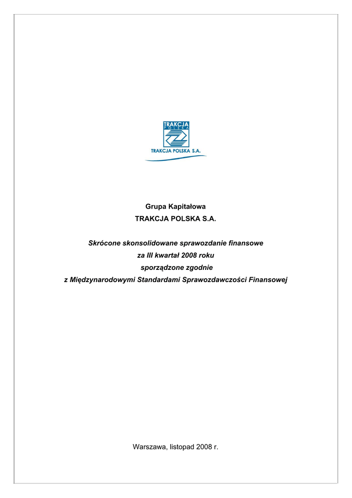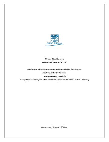 Grupa Kapitałowa TRAKCJA POLSKA S.A. Skrócone skonsolidowane sprawozdanie finansowe za III kwartał 2008 roku sporządzone zgodnie z Międzynarodowymi Standardami Sprawozdawczości Finansowej Warszawa, listopad 2008 r. GRUPA KAPITAŁOWA TRAKCJA POLSKA S.A. Skrócone skonsolidowane sprawozdanie finansowe za okres od dnia 1 stycznia do dnia 30 września 2008 roku (w tys. zł) ZATWIERDZENIE SKRÓCONEGO SKONSOLIDOWANEGO SPRAWOZDANIA FINANSOWEGO Zarząd Spółki Trakcja Polska S.A. zatwierdził skrócone skonsolidowane sprawozdanie finansowe Grupy Kapitałowej Trakcja Polska S.A. za okres od dnia 1 stycznia 2008 roku do dnia 30 września 2008 roku. Skrócone skonsolidowane sprawozdanie finansowe za drugi kwartał 2008 roku zostało sporządzone zgodnie z Międzynarodowymi Standardami Sprawozdawczości Finansowej („MSSF”) wydanymi przez Radę Międzynarodowych Standardów Rachunkowości („RMSR”, „IASB”) oraz zgodnie z MSSF zatwierdzonymi przez Unię Europejską. Informacje zostały zaprezentowane w niniejszym raporcie w następującej kolejności: 1. Skonsolidowany rachunek zysków i strat za okres od dnia 1 stycznia 2008 roku do dnia 30 września 2008 roku, wykazuje zysk netto w wysokości 41 529 tys. złotych. 2. Skonsolidowany bilans na dzień 30 września 2008 roku, po stronie aktywów i pasywów, wykazuje sumę 645 548 tys. złotych. 3. Skonsolidowany rachunek przepływów pieniężnych za okres od dnia 1 stycznia 2008 roku do dnia 30 września 2008 roku, wykazuje zwiększenie środków pieniężnych netto o kwotę 67 709 tys. złotych. 4. Zestawienie zmian w skonsolidowanych kapitałach własnych za okres od dnia 1 stycznia 2008 roku do dnia 30 września 2008 roku, wykazuje zwiększenie kapitałów własnych o kwotę 152 982 tys. złotych. 5. Skrócone informacje dodatkowe. Skrócone skonsolidowane sprawozdanie finansowe zostało sporządzone w tysiącach złotych polskich, z wyjątkiem pozycji, w których wyraźnie wskazano inaczej. Maciej Radziwiłł Tadeusz Kałdonek Prezes Zarządu Wiceprezes Zarządu Tadeusz Kozaczyński Dariusz Mańkowski Wiceprezes Zarządu Wiceprezes Zarządu Warszawa, 13 listopada 2008 roku Strona 2 z 30 GRUPA KAPITAŁOWA TRAKCJA POLSKA S.A. Skrócone skonsolidowane sprawozdanie finansowe za okres od dnia 1 stycznia do dnia 30 września 2008 roku (w tys. zł) SPIS TREŚCI Strona I. SKONSOLIDOWANE SPRAWOZDANIE FINANSOWE ......................................................................................4 SKONSOLIDOWANY RACHUNEK ZYSKÓW I STRAT .........................................................................................4 SKONSOLIDOWANY BILANS ................................................................................................................................5 SKONSOLIDOWANY RACHUNEK PRZEPŁYWÓW PIENIĘŻNYCH.....................................................................6 ZESTAWIENIE ZMIAN W SKONSOLIDOWANYCH KAPITAŁACH WŁASNYCH ..................................................7 II. INFORMACJA DODATKOWA DO SKONSOLIDOWANEGO SPRAWOZDANIA FINANSOWEGO ...................8 1. Informacje ogólne .....................................................................................................................................8 2. Skład Grupy ..............................................................................................................................................8 3. Skład Zarządu Jednostki dominującej.......................................................................................................9 4. Akcjonariat Jednostki Dominującej ...........................................................................................................9 5. Zatwierdzenie sprawozdania finansowego .............................................................................................10 6. Istotne wartości oparte na profesjonalnym osądzie i szacunkach...........................................................10 7. Podstawa sporządzenia skróconego skonsolidowanego sprawozdania finansowego............................11 8. Istotne zasady rachunkowości ................................................................................................................11 9. Efekt zastosowania nowych standardów rachunkowości i zmian polityki rachunkowości .......................15 10. Opis czynników i zdarzeń mających znaczący wpływ na wyniki finansowe Grupy Trakcja Polska S.A. za III kwartał 2008 roku ...................................................................................................................15 11. Opis czynników, które będą miały wpływ na osiągnięte przez Grupę wyniki w perspektywie co najmniej jednego kwartału ......................................................................................................................16 12. Czynniki ryzyka.......................................................................................................................................17 13. Stanowisko Zarządu odnośnie publikowanych prognoz .........................................................................17 14. Zasady przyjęte do przeliczania wybranych danych finansowych na euro .............................................18 15. Oprocentowane kredyty i pożyczki bankowe ..........................................................................................19 16. Należności i zobowiązania warunkowe...................................................................................................20 17. Istotne sprawy sądowe i sporne..............................................................................................................21 18. Dywidendy wypłacone i zadeklarowane..................................................................................................22 19. Informacje na temat udzielonych gwarancji i poręczeń oraz zabezpieczeń na majątku .........................22 20. Informacje na temat podmiotów powiązanych ........