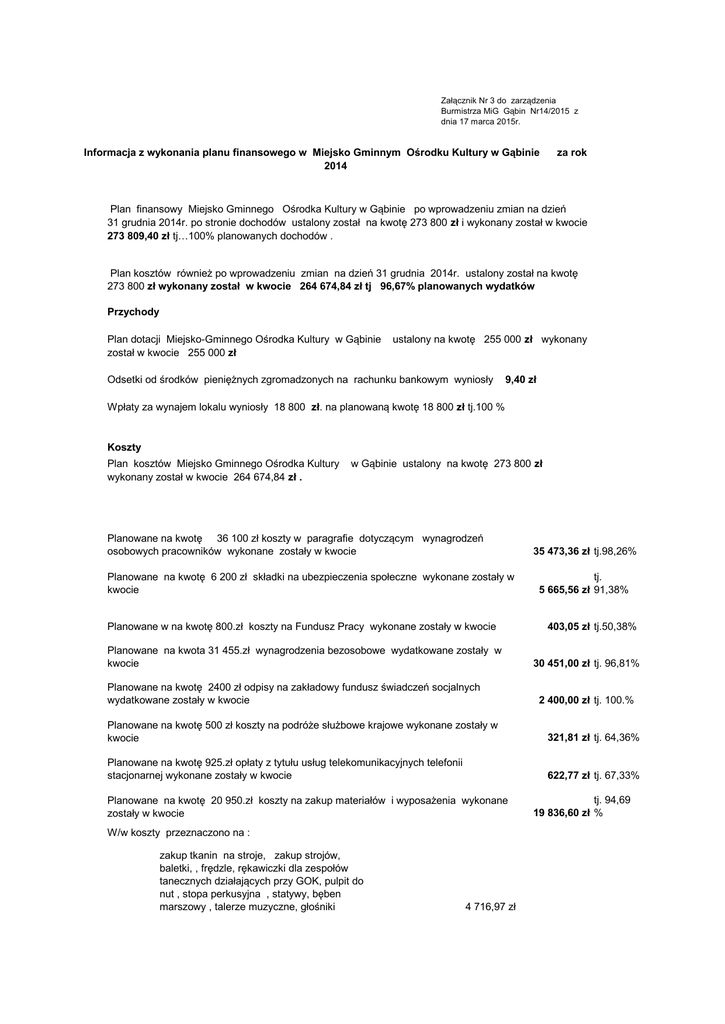 Załącznik Nr 3 do zarządzenia Burmistrza MiG Gąbin Nr14/2015 z dnia 17 marca 2015r. Informacja z wykonania planu finansowego w Miejsko Gminnym Ośrodku Kultury w Gąbinie 2014 za rok Plan finansowy Miejsko Gminnego Ośrodka Kultury w Gąbinie po wprowadzeniu zmian na dzień 31 grudnia 2014r. po stronie dochodów ustalony został na kwotę 273 800 zł i wykonany został w kwocie 273 809,40 zł tj…100% planowanych dochodów . Plan kosztów również po wprowadzeniu zmian na dzień 31 grudnia 2014r. ustalony został na kwotę 273 800 zł wykonany został w kwocie 264 674,84 zł tj 96,67% planowanych wydatków Przychody Plan dotacji Miejsko-Gminnego Ośrodka Kultury w Gąbinie został w kwocie 255 000 zł ustalony na kwotę 255 000 zł wykonany Odsetki od środków pieniężnych zgromadzonych na rachunku bankowym wyniosły 9,40 zł Wpłaty za wynajem lokalu wyniosły 18 800 zł. na planowaną kwotę 18 800 zł tj.100 % Koszty Plan kosztów Miejsko Gminnego Ośrodka Kultury wykonany został w kwocie 264 674,84 zł . w Gąbinie ustalony na kwotę 273 800 zł Planowane na kwotę 36 100 zł koszty w paragrafie dotyczącym wynagrodzeń osobowych pracowników wykonane zostały w kwocie Planowane na kwotę 6 200 zł składki na ubezpieczenia społeczne wykonane zostały w kwocie Planowane w na kwotę 800.zł koszty na Fundusz Pracy wykonane zostały w kwocie Planowane na kwota 31 455.zł wynagrodzenia bezosobowe wydatkowane zostały w kwocie Planowane na kwotę 2400 zł odpisy na zakładowy fundusz świadczeń socjalnych wydatkowane zostały w kwocie 35 473,36 zł tj.98,26% tj. 5 665,56 zł 91,38% 403,05 zł tj.50,38% 30 451,00 zł tj. 96,81% 2 400,00 zł tj. 100.% Planowane na kwotę 500 zł koszty na podróże służbowe krajowe wykonane zostały w kwocie 321,81 zł tj. 64,36% Planowane na kwotę 925.zł opłaty z tytułu usług telekomunikacyjnych telefonii stacjonarnej wykonane zostały w kwocie 622,77 zł tj. 67,33% Planowane na kwotę 20 950.zł koszty na zakup materiałów i wyposażenia wykonane zostały w kwocie W/w koszty przeznaczono na : zakup tkanin na stroje, zakup strojów, baletki, , frędzle, rękawiczki dla zespołów tanecznych działających przy GOK, pulpit do nut , stopa perkusyjna , statywy, bęben marszowy , talerze muzyczne, głośniki 4 716,97 zł tj. 94,69 19 836,60 zł % zakup materiałów biurowych , księga inwetarzowa , kronika , znaczki pocztowe, tonery do drukarki , dzienniki , tabliczki , wyposażenie apteczki , zakup środków spożywczych dla dzieci na konkursy organizowane przez MGOK zakup środków czystości , dozownik na mydło zakup maski , okleiny , armatutry hydraulicznej, płyta pilśniowa , kwiaty,półka regałowa, sznur do wełny , pigment, kosze na śmieci,wieszaki , instrukcja bhp, sztaluga trójnożna, wycieraczki , odkurzacz, firanka, foloa okienna, gablota , kabel , taboret gazowy, płyty chodnikowe , obrzeża, wkręty, choinki,stajak, lustro, żyrandole, krata przesuwana, farba, żarówki 1 289,960 zł 965,31 zł 1 101,07 zł 11 763,29 zł Razem: Plan kosztów ustalony na kwotę został w kwocie : 19 836,60 zł 173 470 zł na zakup usług pozostałych , wykonany tj. 97,62 169 340,69 zł % 1 461,77 tj. prowizja za prowadzenie rachunku bankowego , −wynagrodzenie zespołów w artrystycznych biorących udział w "Dniach Gąbina", zabezpieczenie imprezy, konferansjerka , przygotowanie oświetlenia 88 456,16 −wynagrodzenie zespołów w artrystycznych biorących udział w "Jarmarku Gąbińskim ", zabezpieczenie imprezy 35 173,33 −wynagrodzenie zespołów artystycznych biorących udział w pożegnaniu lata , zabezpieczenie imprezy, pokaz iluzjonistyczny 22 673,84 −wynagrodzenie zespołów artystycznych biorących udział w innych imprezach kulturaqlno-oświatolwych tj. gala noworoczna , występy dla dzieci w czasie ferii, finał WOPŚ, koncert dożynkowy, koncerty kameralne itp.. 10 124,30 − wywóz nieczystoścvi , szkolenie bhp o z danych osobowych, przygotowanie stadionu do rozgrywek sportowych , dorobiennie kluczy , uszycie kotar, wymiana modułu, czyszczenie i konserwacja napędu, 3 492,29 − zajęcia na Uniwersytecie Trzeciego Wieku, plener malarski 3 285,00 4 674,00 −wpłata na ZAIX Razem : Plan wydatków ustalony na kwotę 600 zł na wydatki osobowe niezaliczone do wynagrodzeń , wykonany został w kwocie : Plan wydatków ustalony na kwotę 400 został w kwocie : MGOK w Gąbinie na dzień 31.12.2014r. nie posiadał zobowiązań. Należności wynosiły 10 084,74..zł jest to niewykorzystana dotacja na rachunku bankowym. marzec 2015r. 160,00 zł zł za korzystanie z sieci internet , wykonany Razem plan kosztów ustalony na kwotę 273 800zł wykonany został w kwocie 264 674,84 zł tj 96,67% planowanych kosztów. Gąbin , 169 340,69 0,00 zł