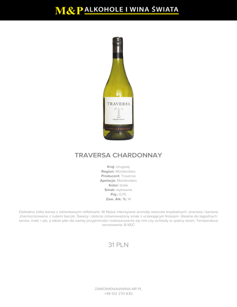 TRAVERSA CHARDONNAY Kraj: Urugwaj Region: Montevideo Producent: Traversa Apelacja: Montevideo Kolor: białe Smak: wytrawne Poj.: 0,75 Zaw. Alk. %: 14 Delikatna żółta barwa z zielonkawymi refleksami. W Nosie intensywne aromaty owoców tropikalnych: ananasa i banana zharmonizowane z nutami beczki. Świeży i dobrze zrównoważony smak z urzekającym finiszem. Idealne do łagodnych serów, małż i ryb, a także pite dla samej przyjemności rozkoszowania się nim czy ochłody w upalny dzień. Temperatura serwowania: 8-10°C 31 PLN [email protected] +48 512 270 830