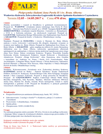 Biuro Usług Turystycznych i Rehabilitacyjnych „ALF” ul. Ozimska 38/2, 45-058 Opole tel. 077/ 454-08-82, 456-41-22, fax. 077/ 453-63-22 www.alf.com.pl e-mail: [email protected] Pielgrzymka śladami Jana Pawła II i św. Brata Alberta: Wadowice-Kalwaria Zebrzydowska-Łagiewniki-Kraków-Igołomia-Kazimierz-Częstochowa Termin:12.05 – 14.05.2017 r. Cena:470 zł/os. 1 dzień: Zbiórka uczestników i wyjazd ze Strzałkowa w godzinach wczesnorannych. Przejazd do WADOWIC: zwiedzanie miasta rodzinnego Jana Pawła II: Dom Rodzinny – Muzeum Jana Pawła II, kościół p.w. ONMP. Następnie KALWARIA ZEBRZYDOWSKA: zwiedzanie zespołu Klasztoru i kościoła o.o. Bernardynów z XVII w. z Kalwarią położoną na okolicznych wzgórzach. Przejazd do ŁAGIEWNIK: Sanktuarium Bożego Miłosierdzia oraz Sanktuarium Jana Pawła II w KRAKOWIE. Przejazd do hotelu w Krakowie. Obiadokolacja i nocleg. 2 dzień: Śniadanie. Przejazd do IGOŁOMIA i wizyta w Muzeum św. Brata Alberta: audycja o życiu, twórczości i poświęceniu dla ubogich, eksponaty związane ze świętym oraz kaplica św. Brata Alberta. Przejazd do Sanktuarium Ecce Homo św. Brata Alberta w KRAKOWIE – gdzie znajdują się relikwie bł. siostry Bernardyny Jabłońskiej oraz św. Brata Alberta, założyciela zgromadzenia albertynek opiekujących się sanktuarium, w którym można podziwiać namalowany przez niego obraz Ecce Homo. Dalsze zwiedzanie Krakowa: Wzgórze Wawelskie Katedra Królewska (Groby Zasłużonych Polaków), Zamek Królewski z Dziedzińcem Arkadowym. Przejście „Drogą Królewską”: ulica Kanoniczą, ulica Grodzka z kościołami: św. Andrzeja, św. Piotra i Pawła, O.O. Franciszkanów, Pałac Arcybiskupów, Collegium Maius, Rynek Główny z Wieżą Ratuszową, Sukiennice, Kościół Mariacki z Ołtarzem Wita Stwosza, Okno Papieskie w Pałacu Biskupim. Powrót do hotelu. Obiadokolacja i nocleg. 3 Dzień: Śniadanie. Wykwaterowanie. Zwiedzanie m.in. Żydowskiej dzielnicy Krakowa, KAZIMIERZ: kościół na Skałce – Panteon Narodowy: Krypty Zasłużonych Polaków, Kościół św. Katarzyny, Kościół Bożego Ciała, Stara Synagoga, Synagoga Remuh i Stary Cmentarz Żydowski. Wyjazd w drogę powrotną do Strzałkowa. Przyjazd do CZĘSTOCHOWY: Kaplica Cudownego Obrazu Matki Bożej, Bazylika Jasnogórska, Sala Rycerska, Skarbiec, Muzeum Jubileuszu 600-lecia Jasnej Góry, Bastion Św. Rocha, Arsenał, Wieża Jasnogórska. Udział w Apelu Jasnogórskim o godzinie 21:00. Przyjazd do Strzałkowa w późnych godzinach wieczornych. Zakończenie pielgrzymki. Świadczenia: Przejazd komfortowym autokarem (klimatyzacja, barek, WC, DVD) Zakwaterowanie: 2 noclegi w hotelu** w Krakowie, pokoje 2-3 osobowe z łazienkami Wyżywienie: 2 obiadokolacje, 2 śniadania Opieka pilota Ubezpieczenie: NNW (10.000 PLN) Uwaga: Na realizację programu należy posiadać 100 zł/os. Kwota ta nie podlega rozliczeniu i obejmuje: bilety wstępu do zwiedzanych obiektów, miejscowego przewodnika I, II i III dnia pielgrzymki oraz słuchawki turystyczne. Kolejność zwiedzanych obiektów może ulec zmianie. Kalkulacja została wykonana dla grupy 47 osób. Wstęp do Domu Jana Pawła II zwiedzania przez muzeum. w Wadowicach będzie możliwy po potwierdzeniu