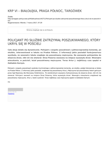 KRP VI – BIAŁOŁĘKA, PRAGA PÓŁNOC, TARGÓWEK Źródło: http://pragapn.policja.waw.pl/r6/aktualnosci/42713,Policjant-po-sluzbie-zatrzymal-poszukiwanego-ktory-ukryl-sie-w-poscieli.h tml Wygenerowano: Wtorek, 7 marca 2017, 07:29 Strona znajduje się w archiwum. POLICJANT PO SŁUŻBIE ZATRZYMAŁ POSZUKIWANEGO, KTÓRY UKRYŁ SIĘ W POŚCIELI Cała akcja działa się dynamicznie. Policjant z zespołu poszukiwań z północnopraskiej komendy, po służbie, interweniował w lokalu na Pradze Północ. Z informacji jakie posiadał funkcjonariusz wynikało, że wewnatrz lokalu znajduje się poszukiwany mężczyzna. Na wezwanie policjantów do otwarcia drzwi, nikt ich nie otwierał. Straż Pożarna wezwana na miejsce wyważyła drzwi. Wewnątrz mieszkania, w pościeli, leżał poszukiwany mężczyzna. Teraz Artur J. najbliższy czas spędzi w Zakładzie Karnym. Policjant z zespołu poszukiwań wydziału kryminalnego z północnopraskiej komendy, po służbie, podjął interwencję w lokalu na Pradze Północ. Z informacji jakie posiadał, znajdował się poszukiwany Artur J. Mężczyzna był poszukiwany listem gończym przez Sąd Rejonowy dla Warszawy Śródmieścia. Po wielokrotnym wzywaniu funkcjonariuszy do otwarcia drzwi, nikt ich nie otwierał. Policjanci wezwali na miejsce Straż Pożarną, która wyważyła drzwi. Wewnątrz mieszkania znajdował się poszukiwany mężczyzna. Artur J. leżał w pościeli. Teraz najbliższy czas mężczyzna spędzi w Zakładzie Karnym. ms Ocena: 0/5 (0) Tweetnij