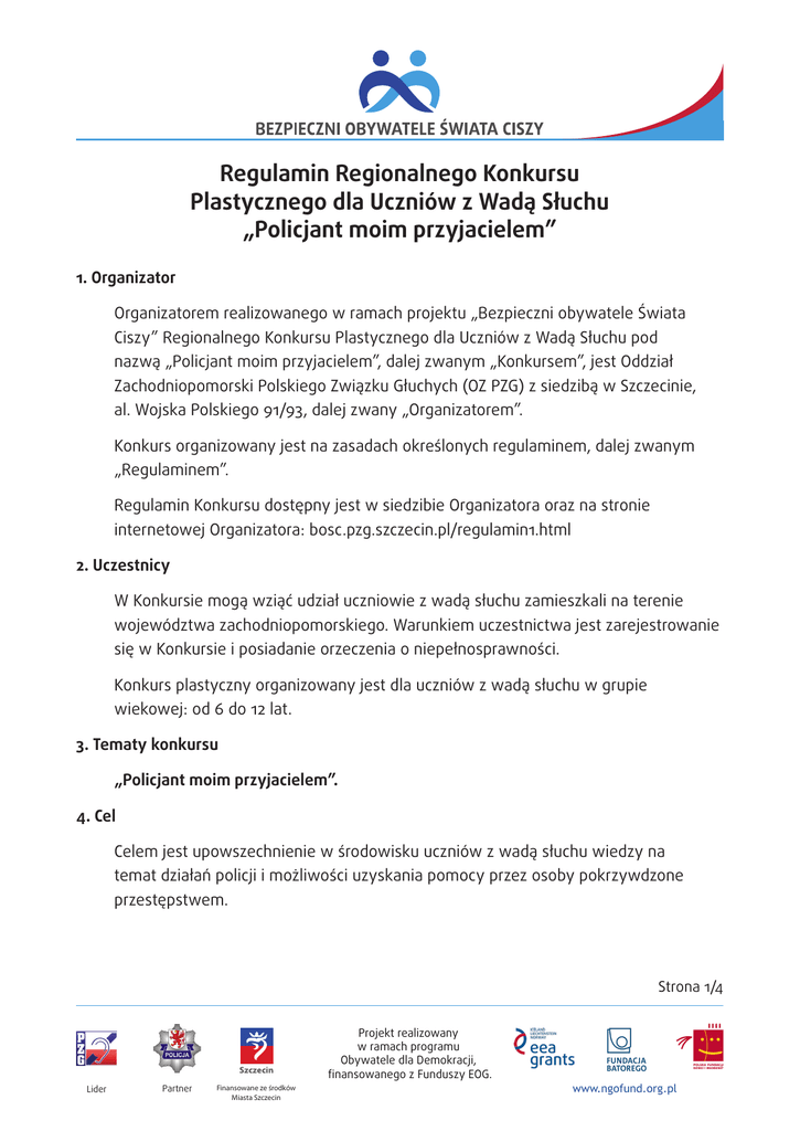 Regulamin Regionalnego Konkursu Plastycznego dla Uczniów z Wadą Słuchu „Policjant moim przyjacielem” 1. Organizator Organizatorem realizowanego w ramach projektu „Bezpieczni obywatele Świata Ciszy” Regionalnego Konkursu Plastycznego dla Uczniów z Wadą Słuchu pod nazwą „Policjant moim przyjacielem”, dalej zwanym „Konkursem”, jest Oddział Zachodniopomorski Polskiego Związku Głuchych (OZ PZG) z siedzibą w Szczecinie, al. Wojska Polskiego 91/93, dalej zwany „Organizatorem”. Konkurs organizowany jest na zasadach określonych regulaminem, dalej zwanym „Regulaminem”. Regulamin Konkursu dostępny jest w siedzibie Organizatora oraz na stronie internetowej Organizatora: bosc.pzg.szczecin.pl/regulamin1.html 2. Uczestnicy W Konkursie mogą wziąć udział uczniowie z wadą słuchu zamieszkali na terenie województwa zachodniopomorskiego. Warunkiem uczestnictwa jest zarejestrowanie się w Konkursie i posiadanie orzeczenia o niepełnosprawności. Konkurs plastyczny organizowany jest dla uczniów z wadą słuchu w grupie wiekowej: od 6 do 12 lat. 3. Tematy konkursu „Policjant moim przyjacielem”. 4. Cel Celem jest upowszechnienie w środowisku uczniów z wadą słuchu wiedzy na temat działań policji i możliwości uzyskania pomocy przez osoby pokrzywdzone przestępstwem. Strona 1/4 Projekt realizowany w ramach programu Obywatele dla Demokracji, finansowanego z Funduszy EOG. Lider Partner Finansowane ze środków Miasta Szczecin www.ngofund.org.pl 5. Warunki przystąpienia do konkursu Konkurs trwa od 07.04.2015 do 19.06.2015. Warunkiem uczestnictwa w Konkursie jest: • Rejestracja poprzez nadesłanie wypełnionego formularza zgłoszeniowego dostępnego na stronie internetowej Organizatora bosc.pzg.szczecin.pl lub w Kołach Terenowych OZ PZG. • Zaakceptowanie warunków uczestnictwa w Konkursie poprzez wypełnienie i podpisanie „Oświadczenia uczestnika konkursu” znajdującego się na końcu formularza zgłoszeniowego dostępnego na stronie internetowej Organizatora bosc.pzg.szczecin.pl lub w Kołach Terenowych OZ PZG. • Wymaganym do formularza zgłoszeniowego załącznikiem jest kserokopia orzeczenia o stopniu niepełnosprawności uczestnika. • Prace konkursowe może przesłać jedynie uczestnik, który spełni wszystkie powyższe warunki uczestnictwa. • W Konkursie wezmą udział prace plastyczne, które spełniają wymogi techniczne opisane w Regulaminie, nadesłane w terminie wskazanym przez Organizatora, tj. najpóźniej do dnia 19.06.2015 do godz. 12-ej. Prace nadesłane po terminie nie będą brane pod uwagę. • Wysyłając pracę na Konkurs, uczestnik potwierdza, że zapoznał się z Regulaminem i akceptuje jego postanowienia. 6. Wymagania dotyczące prac konkursowych Prace nadesłane na Konkurs muszą spełniać następujące warunki: • muszą być zgodne z tematem konkursu; • muszą być wykonane w 2015 roku na terenie województwa zachodniopomorskiego; • prace plastyczne wykonane dowolną techniką muszą być nadesłane w oryginale w formacie A4 lub A3; • każda praca musi mieć tytuł; • jeden uczestnik konkursu może nadesłać maksymalnie 3 prace. Strona 2/4 Projekt realizowany w ramach programu Obywatele dla Demokracji, finansowanego z Funduszy EOG. Lider Partner Finansowane ze środków Miasta Szczecin www.ngofund.org.pl 7. Finał i rozstrzygnięcie konkursu Rozstrzygnięcie Konkursu nastąpi do dnia 25.06.2015. Prace będą oceniane przez jury (artyści plastyczny oraz przedstawiciele Komendy Wojewódzkiej Policji i OZ PZG). Do finału wejdą trzy najlepsze prace. Decyzja jury (komisji konkursowej) jest ostateczna. Ogłoszenie wyników nastąpi w dniu 26.06.2015 na stronie internetowej Organizatora bosc.pzg.szczecin.pl. Informację o wynikach będzie można również otrzymać w Kołach Terenowych OZ PZG po dniu 26.06.2015 r. Zwycięzcy konkursu zostaną powiadomieni o wygranej drogą e-mailową. Wiadomość zostanie wysłana na adres wskazany w formularzu zgłoszeniowym. Organizator zastrzega sobie prawo do wykorzystania nagrodzonych prac w kampaniach reklamowych i/lub materiałach reklamowych Organizatora bez obowiązku wynagrodzenia dla autora prac. 8. Wystawa i nagrody Prace zwycięzców Konkursu zostaną pokazane na wystawach organizowanych w ramach realizacji projektu „Bezpieczni obywatele Świata Ciszy”. Uroczyste podsumowanie projektu oraz wręczenie nagród zwycięzcom konkursu odbędzie się 25.06.2015 w siedzibie OZ PZG al. Wojska Polskiego 91/93. Ponadto prace laureatów pokazane zostaną w trakcie imprezy integracyjnej na „Różance”. 9. Postanowienia dodatkowe Organizator nie zwraca żadnych kosztów związanych z uczestnictwem w Konkursie. Odpowiedzialność za naruszenie praw osób trzecich do pracy nadesłanej na Konkurs w całości obciąża uczestnika. Nagrodzone i wyróżnione prace przechodzą na własność Organizatora. Uczestnik, zgłaszając się do konkursu oświadcza, iż przysługują mu wyłączne nieograniczone prawa autorskie do nadesłanych prac. Ponadto oświadcza, że wyraża zgodę na wielokrotne, nieodpłatne publikowanie nagrodzonych prac oraz Strona 3/4 Projekt realizowany w ramach programu Obywatele dla Demokracji, finansowanego z Funduszy EOG. Lider Partner Finansowane ze środków Miasta Szczecin www.ngofund.org.pl opublikowanie jego imienia, nazwiska oraz miejscowości zamieszkania w materiałach promocyjnych związanych z konkursem, w wydawnictwach oraz na stronach internetowych Organizatora, a także na ich wykorzystywanie w celach promocyjnych i marketingowych, w szczególności na utrwalanie, modyfikowanie i zwielokrotnianie prac każdą techniką, w tym m. in. drukarską, reprograficzną, zapisu magnetycznego, cyfrową, audiowizualną, na jakichkolwiek nośnikach, bez ograniczeń, co do ilości i wielkości nakładu, oraz rozpowszechnianie prac poprzez publiczne udostępnianie w taki sposób, aby każdy mógł mieć do nich dostęp w miejscu i w czasie przez siebie wyb