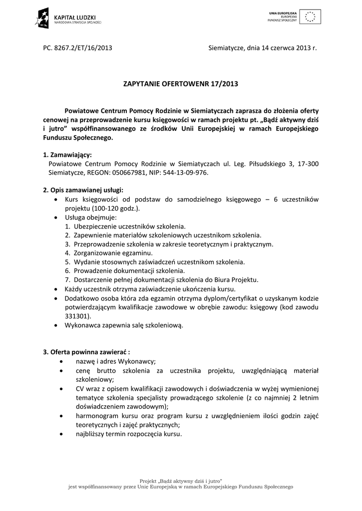 PC. 8267.2/ET/16/2013 Siemiatycze, dnia 14 czerwca 2013 r. ZAPYTANIE OFERTOWENR 17/2013 Powiatowe Centrum Pomocy Rodzinie w Siemiatyczach zaprasza do złożenia oferty cenowej na przeprowadzenie kursu księgowości w ramach projektu pt. „Bądź aktywny dziś i jutro” współfinansowanego ze środków Unii Europejskiej w ramach Europejskiego Funduszu Społecznego. 1. Zamawiający: Powiatowe Centrum Pomocy Rodzinie w Siemiatyczach ul. Leg. Piłsudskiego 3, 17-300 Siemiatycze, REGON: 050667981, NIP: 544-13-09-976. 2. Opis zamawianej usługi: Kurs księgowości od podstaw do samodzielnego księgowego – 6 uczestników projektu (100-120 godz.). Usługa obejmuje: 1. Ubezpieczenie uczestników szkolenia. 2. Zapewnienie materiałów szkoleniowych uczestnikom szkolenia. 3. Przeprowadzenie szkolenia w zakresie teoretycznym i praktycznym. 4. Zorganizowanie egzaminu. 5. Wydanie stosownych zaświadczeń uczestnikom szkolenia. 6. Prowadzenie dokumentacji szkolenia. 7. Dostarczenie pełnej dokumentacji szkolenia do Biura Projektu. Każdy uczestnik otrzyma zaświadczenie ukończenia kursu. Dodatkowo osoba która zda egzamin otrzyma dyplom/certyfikat o uzyskanym kodzie potwierdzającym kwalifikacje zawodowe w obrębie zawodu: księgowy (kod zawodu 331301). Wykonawca zapewnia salę szkoleniową. 3. Oferta powinna zawierać : nazwę i adres Wykonawcy; cenę brutto szkolenia za uczestnika projektu, uwzględniającą materiał szkoleniowy; CV wraz z opisem kwalifikacji zawodowych i doświadczenia w wyżej wymienionej tematyce szkolenia specjalisty prowadzącego szkolenie (z co najmniej 2 letnim doświadczeniem zawodowym); harmonogram kursu oraz program kursu z uwzględnieniem ilości godzin zajęć teoretycznych i zajęć praktycznych; najbliższy termin rozpoczęcia kursu. Projekt „Bądź aktywny dziś i jutro” jest współfinansowany przez Unię Europejską w ramach Europejskiego Funduszu Społecznego 4. Ofertę mogą składać Wykonawcy, którzy: posiadają uprawnienia do wykonywania określonej działalności lub czynności, posiadają niezbędną wiedzę i doświadczenie oraz dysponują potencjałem technicznym i osobami zdolnymi do wykonywania zamówienia, znajdują się w sytuacji ekonomicznej i finansowej zapewniającej wykonanie zamówienia. 5. Kryterium wyboru oferty: oferta zgodna z opisem przedmiotu zamówienia oraz innymi wymaganiami określonymi przez Zamawiającego: cena oferty. 6. Sposób i termin składania ofert: Oferty należy przygotować oraz złożyć w terminie do dnia 28 czerwca 2013 roku do godziny 15:30 na adres Powiatowe Centrum Pomocy Rodzinie w Siemiatyczach ul. Leg. Piłsudskiego 3, 17-300 Siemiatycze lub na adres e-mail: [email protected]. Osoby do kontaktu: Beata Pogorzelska tel. 85 730 05 07 kom. 500 158 766, Elwira Tołwińska-Filipiak kom. 668 377 097. 7. Termin i miejsce realizacji: Termin: lipiec-sierpień 2013 r. Miejsce: Siemiatycze 8. Informacje dotyczące płatności: Zapłata za realizację zamówienia będzie uiszczona przelewem na podstawie faktury lub rachunku wystawionego przez Wykonawcę w terminie 14 dni z konta Zamawiającego na konto Wykonawcy. Zapytanie ofertowe nie jest dokumentem wiążącym. Projekt „Bądź aktywny dziś i jutro” jest współfinansowany przez Unię Europejską w ramach Europejskiego Funduszu Społecznego