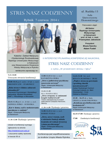 STRES NASZ CODZIENNY Rybnik 7 czerwca 2014 r. ul. Rudzka 13 Aula Uniwersytetu Ekonomicznego Patronatem objęli: JM Rektor Śląskiego Uniwersytetu Medycznego w Katowicach prof. dr hab. n. med. Przemysław Jałowiecki Prezydent Miasta Rybnika Adam Fudali Katedra i Zakład Medycyny i Epidemiologii Środowiskowej Śląskiego Uniwersytetu Medycznego w Katowicach oraz Stowarzyszenie Wspierania Wiedzy Medycznej w Rybniku II INTERDYSCYPLINARNĄ KONFERENCJĘ NAUKOWĄ STRES NASZ CODZIENNY z cyklu „W przestrzeni stresu i lęku” serdecznie zapraszają na : 9.45-10.00 Uroczyste otwarcie konferencji 10.00-10.45 prof. nadzw. dr hab. n. med. ZBIGNIEW LEW – STAROWICZ „Wpływ stresu na powstanie i przebieg chorób nowotworowych”. „Stres związany ze zmianami kręgów kulturowych” JADWIGA JOŚKO – OCHOJSKA „Kat w domu, czyli o molestowaniu moralnym w rodzinie” zgłoszenia na stronie: RENATA RUMIŃSKA – BUSZ „Stres a jadłowstręt psychiczny (anorexsia nervosa)” M.A. JOANNA SELL 10.45-11.30 prof. zw. dr hab. n. med. Udział w konferencji wymaga KATARZYNA ZIORA 12.45-13.30 Pracownia Psychoterapii i Rehabilitacji Seksualnej. Wydział Rehabilitacji AWF J. Piłsudskiego w Warszawie 11.30-12.00 Dyskusja i przerwa 14.45-15.30 lek. med. Śląski Uniwersytet Medyczny w Katowicach „Rola stresu w klinice zaburzeń seksualnych” Śląski Uniwersytet Medyczny w Katowicach 12.00-12.45 dr hab. n. med. Zakład Radioterapii Centrum Onkologii Instytutu im. Marii Skłodowskiej – Curie Oddział w Gliwicach 15.30 – 16.15 dr n. hum. Trener interkulturowy & Coach Intercultural Compass Hannover, Niemcy URSZULA MARCINKOWSKA 13.30-14.00 Dyskusja i przerwa Śląski Uniwersytet Medyczny w Katowicach 14.00-14.45 dr hab. n. med. ROBERT PUDLO „Stres, serce i rozum, czyli o zależności funkcji układu krążenia od reakcji stresowej i stanu psychicznego” Śląski Uniwersytet Medyczny w Katowicach http://medsrod.sum.edu.pl i uiszczenia opłaty wpisowej Konferencja jest współfinansowana w kwocie 50 zł. ze środków Urzędu Miasta Rybnika. „Kondycja psychofizyczna osób bezdomnych”. 16.15-17.00 Dyskusja i przerwa 17.00 Zamknięcie konferencji