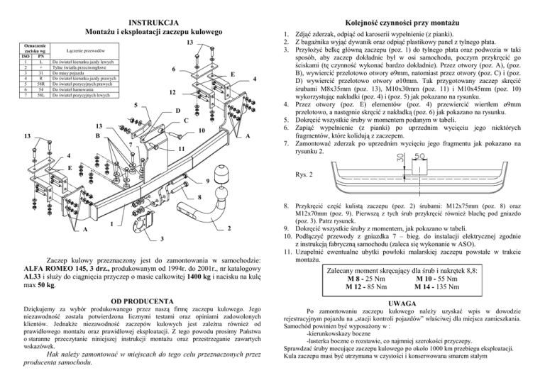 INSTRUKCJA MontaŜu i eksploatacji zaczepu kulowego Oznaczenie zacisku wg ISO PN 1 L 2 + 3 31 4 R 5 58R 6 54 7 58L Kolejność czynności przy montaŜu 13 Łączenie przewodów Do świateł kierunku jazdy lewych Tylne światła przeciwmgłowe Do masy pojazdu Do świateł kierunku jazdy prawych Do świateł pozycyjnych prawych Do świateł hamowania Do świateł pozycyjnych lewych 6 4 12 5 D C 13 B 13 E 10 7 A 11 4 1. Zdjąć zderzak, odpiąć od karoserii wypełnienie (z pianki). 2. Z bagaŜnika wyjąć dywanik oraz odpiąć plastikowy panel z tylnego płata. 3. PrzyłoŜyć belkę główną zaczepu (poz. 1) do tylnego płata oraz podwozia w taki sposób, aby zaczep dokładnie był w osi samochodu, poczym przykręcić go ściskami (tę czynność wykonać bardzo dokładnie). Przez otwory (poz. A), (poz. B), wywiercić przelotowo otwory ø9mm, natomiast przez otwory (poz. C) i (poz. D) wywiercić przelotowo otwory ø10mm. Tak przygotowany zaczep skręcić śrubami M8x35mm (poz. 13), M10x30mm (poz. 11) i M10x45mm (poz. 10) wykorzystując nakładki (poz. 4) i (poz. 5) jak pokazano na rysunku. 4. Przez otwory (poz. E) elementów (poz. 4) przewiercić wiertłem ø9mm przelotowo, a następnie skręcić z nakładką (poz. 6) jak pokazano na rysunku. 5. Dokręcić wszystkie śruby w momentem podanym w tabeli. 6. Zapiąć wypełnienie (z pianki) po uprzednim wycięciu jego niektórych fragmentów, które kolidują z zaczepem. 7. Zamontować zderzak po uprzednim wycięciu jego fragmentu jak pokazano na rysunku 2. E Rys. 2 9 8 8. Przykręcić część kulistą zaczepu (poz. 2) śrubami: M12x75mm (poz. 8) oraz A M12x70mm (poz. 9). Pierwszą z tych śrub przykręcić równieŜ blachę pod gniazdo (poz. 3). Patrz rysunek. 1 2 3 Zaczep kulowy przeznaczony jest do zamontowania w samochodzie: ALFA ROMEO 145, 3 drz., produkowanym od 1994r. do 2001r., nr katalogowy AL33 i słuŜy do ciągnięcia przyczep o masie całkowitej 1400 kg i nacisku na kulę max 50 kg. OD PRODUCENTA Dziękujemy za wybór produkowanego przez naszą firmę zaczepu kulowego. Jego niezawodność została potwierdzona licznymi testami oraz opiniami zadowolonych klientów. JednakŜe niezawodność zaczepów kulowych jest zaleŜna równieŜ od prawidłowego montaŜu oraz prawidłowej eksploatacji. Z tego powodu prosimy Państwa o staranne przeczytanie niniejszej instrukcji montaŜu oraz przestrzeganie zawartych wskazówek. Hak naleŜy zamontować w miejscach do tego celu przeznaczonych przez producenta samochodu. 9. Dokręcić wszystkie śruby z momentem, jak pokazano w tabeli. 10. Podłączyć przewody z gniazdka 7 – bieg. do instalacji elektrycznej zgodnie z instrukcją fabryczną samochodu (zaleca się wykonanie w ASO). 11. Uzupełnić ewentualne ubytki powłoki malarskiej zaczepu powstałe w trakcie montaŜu. Zalecany moment skręcający dla śrub i nakrętek 8,8: M 8 - 25 Nm M 10 - 55 Nm M 12 - 85 Nm M 14 - 135 Nm UWAGA Po zamontowaniu zaczepu kulowego naleŜy uzyskać wpis w dowodzie rejestracyjnym pojazdu na „stacji kontroli pojazdów” właściwej dla miejsca zamieszkania. Samochód powinien być wyposaŜony w : -kierunkowskazy boczne -lusterka boczne o rozstawie, co najmniej szerokości przyczepy. Sprawdzać śruby mocujące zaczepu kulowego po około 1000 km przebiegu eksploatacji. Kula zaczepu musi być utrzymana w czystości i konserwowana smarem stałym PPUH AUTO-HAK S. J. WyposaŜenie zaczepu: Produkcja Zaczepów Kulowych Henryk & Zbigniew Nejman 76-200 SŁUPSK ul. Słoneczna 16K tel/fax (059) 8-414-414; 8-414-413 E-mail: [email protected] www.autohak.com.pl Zaczep kulowy bez wyposaŜenia elektrycznego Klasa: A50-X Nr kat. AL33 Przeznaczony do zamontowania w samochodzie: Producent: ALFA ROMEO Model: 145 Typ: 3 drz. produkowanym od 1994r. do 2001r. KARTA GWARANCYJNA Dane techniczne: Wartość siły D : 7,73 kN maksymalna masa przyczepy: 1400 kg maksymalny nacisk na kulę: 50 kg Numer homologacji zgodnie z dyrektywą 94/20/WE: e20*94/20*0385*00 Producent udziela gwarancji niniejszą kartą gwarancyjną na okres 24 miesięcy licząc od dnia zakupu zaczepu kulowego do samochodu: ALFA ROMEO 145, 3 drz. produkowanego od 1994r. do 2001r. Data produkcji .............................. Data zakupu.................................. Zakres gwarancji obejmuje wyłącznie wady jakościowe wynikające z winy producenta. Gwarancja nie obejmuje natomiast uszkodzeń zawinionych przez nabywcę, wynikających z niewłaściwego montaŜu, uŜytkowania lub konserwacji, uszkodzeń mechanicznych, normalnego zuŜycia podczas eksploatacji itp. Gwarancja udzielona na zakupiony towar nie wyłącza, nie ogranicza ani nie zawiesza uprawnień kupującego wynikających z niezgodności towaru z umową. Reklamacje naleŜy zgłaszać w punkcie sprzedaŜy, składając jednocześnie kartę gwarancyjną. Usunięcie "wady" następuje po stwierdzeniu przez punkt sprzedaŜy wspólnie z producentem słuszności złoŜonej reklamacji. Reklamacja powinna być załatwiona w ciągu czternastu dni od dnia uznania reklamacji. Karta gwarancyjna jest niewaŜna jeŜeli nie jest wypełniona i podpisana. Data zgłoszenia reklamacji: ................................................................... INFORMACJA WSTĘPNA Zaczep kulowy jest skonstruowany zgodnie z zasadami bezpieczeństwa ruchu drogowego. Zaczep kulowy jest elementem wpływającym na bezpieczeństwo jazdy i moŜe zostać zainstalowany wyłącznie przez personel wyspecjalizowany. Niedopuszczalne jest dokonywanie jakichkolwiek zmian w konstrukcji zaczepu. Powoduje to wygaśniecie dopuszczenia do stosowania. W przypadku obecności masy izolacyjnej lub osłony podwozia w miejscu przylegania zaczepu, naleŜy ją usunąć. Nieosłonięte miejsca karoserii oraz wywiercone otwory naleŜy pomalować farbą antykorozyjną. Informacjami wiąŜącymi odnośnie wartości obciąŜeń są dane podawane przez producenta samochodu, względnie wartości maksymalnej masy przyczepy oraz maksymalnego nacisku na kulę, przy czym 