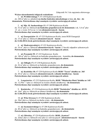 Załącznik Nr 3 do zapytania ofertowego. Wykaz nieruchomości objętych wnioskiem: 1. ul. Wróblewskiego 7; 47-230 Kędzierzyn-Koźle ok. 240 m2 płyt a-c płaskich na dachu budynku mieszkalnego o wys. ok. 4m – do demontażu. Potwierdzona chęć usunięcia wyrobów zawierających azbest. 2. ul. Mjr. H. Sucharskiego 13; 47-200 Kędzierzyn-Koźle ok. 52 m2 płyt a-c falistych na budynku gospodarczym do demontażu i ok. 5,4 m2 płyt (5 szt. o wym. 0,9 m na 1,2 m) zdemontowanych - luzem. Potwierdzona chęć usunięcia wyrobów zawierających azbest. 3. ul. Energetyków 11; 47-225 Kędzierzyn-Koźle, teren ROD Energetyk ok. 15 m2 płyt a-c falistych zdemontowanych – luzem do 12.06.2012r.brak potwierdzenia chęci usunięcia wyrobów zawierających azbest; 4. ul. Modrzejewskiej 6; 47-225 Kędzierzyn-Koźle ok. 24 m2 płyt a-c falistych zdemontowanych - luzem i 2 beczki odpadów azbestowych Potwierdzona chęć usunięcia wyrobów zawierających azbest. 5. ul. Przyjaźni 39; 47-225 Kędzierzyn- Koźle ok. 180 m2 płyt a-c falistych na budynku gospodarczym – komórka, do demontażu Potwierdzona chęć usunięcia wyrobów zawierających azbest. 6. ul. Odległa 17; 47-230 Kędzierzyn-Koźle ok. 36 m2 płyt a-c falistych na budynku gospodarczym, do demontażu Potwierdzona chęć usunięcia wyrobów zawierających azbest. 7. ul. Kozielska 18; 47-220 Kędzierzyn-Koźle ROD "Tecza" działka nr. 365 ok. 20 m2 płyt a-c falistych zdemontowanych z altanki działkowej – luzem Potwierdzona chęć usunięcia wyrobów zawierających azbest. 8. Lenartowice; 47-232 Kędzierzyn-Koźle, ROD "Miedarska Huta"działka nr 145 ok. 12,39m2 7 płyt a-c falistych na ścianie altanki działkowej - do demontażu Potwierdzona chęć usunięcia wyrobów zawierających azbest. 9. Kuźniczka ; 47-234 Kędzierzyn-Koźle ROD "Kuźniczka" działka nr. 45/19: ok. 16m2 płyt a-c falistych na altance działkowej- do demontażu do 12.06.2012r.brak potwierdzenia chęci usunięcia wyrobów zawierających azbest; 10. ul. Wita Stwosza 3; 47-206 Kędzierzyn-Koźle: ok. 28m2 płyt a-c falistych na dachu wiaty - do demontażu Potwierdzona chęć usunięcia wyrobów zawierających azbest. 11. ul. Szymanowskiego 1; 47-206 Kędzierzyn-Koźle: ok. 40 m2 płyt a-c falistych na budynku gospodarczym - do demontażu Potwierdzona chęć usunięcia wyrobów zawierających azbest. 12. ul. Gliwicka, 47-224 Kędzierzyn-Koźle: ROD „Synteza” ok. 264m2 płyt a-c falistych oraz płyt a-c elewacyjnych zdemontowanych – luzem Potwierdzona chęć usunięcia wyrobów zawierających azbest. 13. ul. Główna 37; 47-200 Kędzierzyn-Koźle: ok. 40 m2 płyt a-c falistych w tym 34m2 na budynku gospodarczym- szopie do demontażu oraz ok. 8m2 zdemontowanych – luzem Potwierdzona chęć usunięcia wyrobów zawierających azbest. 14. ul. Skowronków 18; 47-230 Kędzierzyn-Koźle: ok. 20 m2 płyt a-c falistych zdemontowanych – luzem Potwierdzona chęć usunięcia wyrobów zawierających azbest. 15. ul. Szymanowskiego 23; 47-206 Kędzierzyn-Koźle: ok. 16 m2 płyt a-c elewacyjnych zdemontowanych - luzem Potwierdzona chęć usunięcia wyrobów zawierających azbest. 16. ul. Wyspiańskiego 1; 47-206 Kędzierzyn-Koźle: ok. 200 m2 płyt a-c falistych na stodole do demontażu Potwierdzona chęć usunięcia wyrobów zawierających azbest. 17. ul. Połanieckich 25; 47-225 Kędzierzyn-Koźle: ok. 2 m2 płyt a-c falistych zdemontowanych – luzem Potwierdzona chęć usunięcia wyrobów zawierających azbest. 18. MZK, ul. Kozielska 2; 47-224 Kędzierzyn-Koźle: ok. 400 m2 płyt a-c dach i ścianki działowe w budynkach zlokalizowanych na terenie posesji - do demontażu Potwierdzona chęć usunięcia wyrobów zawierających azbest. 19. ul. Pułaskiego 12/1; 47-220 Kędzierzyn-Koźle : ok. 22,14 m2 płyt a-c falistych na budynku gospodarczym - do demontażu Potwierdzona chęć usunięcia wyrobów zawierających azbest. 20. ul. Jaskółek 1; 47-230 Kędzierzyn-Koźle : ok. 220 m2 płyt a-c falistych stodoła i wiata oraz płyty luzem do demontażu do 12.06.2012r.brak potwierdzenia chęci usunięcia wyrobów zawierających azbest; 21. ul. Przyjaźni, ROD "Miedarska Huta"działki nr 20 i 58 : łącznie ok. 32 m2 płyt a-c falistych z altanek działkowych zdemontowanych – luzem Potwierdzona chęć usunięcia wyrobów zawierających azbest. 22. ul. Kozielska 18; 47-230 Kędzierzyn-Koźle ROD "Tęcza" działka nr. 145 : ok. 20m2 płyt a-c płaskich elewacyjnych na altance działkowej - do demontażu Potwierdzona chęć usunięcia wyrobów zawierających azbest. 23. ul. Kozielska 18; 47-220 Kędzierzyn-Koźle ROD "Tęcza" działka nr.129 : ok. 20m2 płyt a-c falistych na altance działkowej do demontażu Potwierdzona chęć usunięcia wyrobów zawierających azbest.