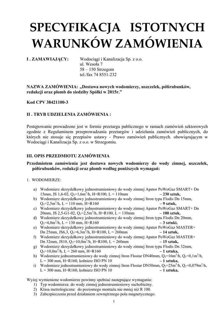 SPECYFIKACJA ISTOTNYCH WARUNKÓW ZAMÓWIENIA I . ZAMAWIAJĄCY: Wodociągi i Kanalizacja Sp. z o.o. ul. Wesoła 7 58 – 150 Strzegom tel./fax 74 8551-232 NAZWA ZAMÓWIENIA: „Dostawa nowych wodomierzy, uszczelek, półśrubunków, redukcji oraz plomb do siedziby Spółki w 2015r.” Kod CPV 38421100-3 II . TRYB UDZIELENIA ZAMÓWIENIA : Postępowanie prowadzone jest w formie przetargu publicznego w ramach zamówień sektorowych zgodnie z Regulaminem przeprowadzania przetargów i udzielania zamówień publicznych, do których nie stosuje się przepisów ustawy - Prawo zamówień publicznych. obowiązującym w Wodociągi i Kanalizacja Sp. z o.o. w Strzegomiu. III. OPIS PRZEDMIOTU ZAMÓWIENIA Przedmiotem zamówienia jest dostawa nowych wodomierzy do wody zimnej, uszczelek, półśrubunków, redukcji oraz plomb według poniższych wymagań: 1. WODOMIERZE: a) Wodomierz skrzydełkowy jednostrumieniowy do wody zimnej Apator PoWoGaz SMART+ Dn 15mm, JS 1,6-02, Q3=1,6m3/h, H=R100, L = 110mm – 230 sztuk, b) Wodomierz skrzydełkowy jednostrumieniowy do wody zimnej Itron typu Flodis Dn 15mm, Q3=2,5m3/h, L = 110 mm, H=R160 – 9 sztuk, c) Wodomierz skrzydełkowy jednostrumieniowy do wody zimnej Apator PoWoGaz SMART+ Dn 20mm, JS 2,5-G1-02, Q3=2,5m3/h, H=R100, L = 130mm – 100 sztuk, d) Wodomierz skrzydełkowy jednostrumieniowy do wody zimnej Itron typu Flodis Dn 20mm, Q3=4,0m3/h, L = 130 mm, H=R160 – 3 sztuki, e) Wodomierz skrzydełkowy jednostrumieniowy do wody zimnej Apator PoWoGaz MASTER+ Dn 25mm, JS6,3, Q3=6,3m3/h, H=R100, L = 260mm – 14 sztuk, f) Wodomierz skrzydełkowy jednostrumieniowy do wody zimnej Apator PoWoGaz MASTER+ Dn 32mm, JS10, Q3=10,0m3/h, H=R100, L = 260mm – 15 sztuk, g) Wodomierz skrzydełkowy jednostrumieniowy do wody zimnej Itron typu Flodis Dn 32mm, Q3=10,0m3/h, L = 260 mm, H=R160 – 1 sztuka, h) Wodomierz jednostrumieniowy do wody zimnej Itron Flostar DN40mm, Q3=16m3/h, Q1=0,1m3/h, L = 300 mm, H=R160, kołnierz ISO PN 10 – 1 sztuka, i) Wodomierz jednostrumieniowy do wody zimnej Itron Flostar DN50mm, Q3=25m3/h, Q1=0,079m3/h, L = 300 mm, H=R160, kołnierz ISO PN 10 – 1 sztuka, Wyżej wymienione wodomierze powinny spełniać następujące wymagania: 1) Typ wodomierza: do wody zimnej jednostrumieniowy suchobieżny. 2) Klasa metrologiczna: do poziomego montażu nie mniej niż R 100. 3) Zabezpieczenia przed działaniem zewnętrznego pola magnetycznego. 1 4) 5) 6) 7) 8) 9) 10) Zabezpieczenie przed zewnętrzną ingerencją mechaniczną. Blokada pełnego obrotu liczydła. Liczydło hermetyczne odporne na zaparowanie. Zainstalowany filtr sitkowy na wlocie wodomierza. Obustronne łożyskowany wirnik (przy zastosowanie najwyższej jakości kamieni technicznych). Kierunek przepływu wody uwidoczniony na korpusie. Wodomierze powinny posiadać: a) certyfikat typu WE, wykonanie zgodnie z PN-EN 14154 b) aktualną na dany rok cechę legalizacyjną lub ocenę zgodności c) oznaczenie numerem fabrycznym. d) możliwość montażu nakładek radiowych w trakcie eksploatacji wodomierzy. 2. WODOMIERZE SPRZĘŻONE: a) Wodomierz sprzężony, szeregowy Sensu MeiTwin Dn80,30/16, Q3=63m3/h, Q3’=120m3/h, L=300mm, wodomierz szeregowy 612MTW-ER56, Q3=4m3/h – 1 sztuka. b) Wodomierz sprzężony Apator PoWoGaz MWN/JS80/4,0-S-NKP, Q3=63m3/h, Q1=0,04m3/h, L = 300 mm – 1 sztuka. c) Wodomierz sprzężony Apator PoWoGaz MWN/JM100/4,0-S-NKP, Q3=100m3/h, Q1=0,025m3/h, L = 360 mm – 1 sztuka. Wyżej wymienione wodomierze sprzężone powinny spełniać następujące wymagania: 1. śrubowe z poziomą ośką wirnika 2. sprzężone z zaworem sprężynowym 3. ciśnienie robocze max 1,6 MPa 4. dodatkowa osłona liczydła 5. sprzęgło magnetyczne 6. przystosowane do późniejszego wbudowania nadajnika impulsów 7.Wodomierze powinny posiadać: a) certyfikat typu WE, wykonanie zgodnie z PN-EN 14154 b) aktualną na dany rok cechę legalizacyjną lub ocenę zgodności c) oznaczenie numerem fabrycznym. d) możliwość montażu nakładek radiowych w trakcie eksploatacji wodomierzy. 3. WODOMIERZE PRZEMYSŁOWE: a) Wodomierz Itron Woltex M WEN śrubowy z poziomą osia wirnika DN100mm, Qn=60m3/h, L = 250 mm, kołnierz ISO PN 10 – 1 sztuka. Wyżej wymieniony wodomierz powinien spełniać następujące wymagania: 1) Wodomierz śrubowy z poziomą ośką wirnika 2) Typ wodomierza: do wody zimnej jednostrumieniowy suchobieżny. 3) Klasa metrologiczna: do poziomego montażu nie mniej niż klasa B. 4) Liczydło hermetyczne odporne na zaparowanie. 5) Temperatura robocza dla wody do 500 C 6) Kierunek przepływu wody uwidoczniony na korpusie. 7) Wodomierze powinny posiadać: e) Wymagania klasy B według PN-ISO 4064 f) aktualną na dany rok cechę legalizacyjną g) oznaczenie numerem fabrycznym. możliwość montażu nakładek radiowych w trakcie eksploatacji wodomierzy. 2. Uszczelki fibrowe do wodomierzy według poniższej specyfikacji: Lp. Typ 1 Uszczelki DN 15 2 Uszczelki DN 20 Ilość 1000 sztuk 800 sztuk 2 3 Uszczelki DN 25 30 sztuk 3. Plomby do wodomierzy według poniższej specyfikacji: Lp. Typ 1 Plomby dwuczęściowe z osobnym zatrzaskiem DN 15 2 Plomby dwuczęściowe z osobnym zatrzaskiem DN 20 3 Plomby (materiał: moplen) DN 25 ORFIX 4 Plomby (materiał: moplen) DN 32 ORFIX 5 Plomby (materiał: moplen) DN 40 ORFIX 6 Plomby typu twist BIG SCUT ORFIX, długość linki 60 cm 7 Plomby typu twist BIG SCUT ORFIX, długość linki 40 cm Ilość 500 sztuk 200 sztuk 54 sztuki 86 sztuk 4 sztuki 30 sztuk 30 sztuk 4. Redukcje mosiężne do wodomierzy Lp. Typ 1 Dn 20 zewnętrzna x Dn 15 wewnętrzna Ilość 600 sztuk 5. Półśrubunki mosiężne do wodomierzy Lp. Typ 1 Półśrubunki Dn 20 (¾ cala) 2 Półśrubunki Dn 25 (1 cal) Ilość 50 kompletów 5 kompletów IV. WYMAGANY TERMIN WYKONANIA ZAMÓWIENIA Termin wykonania zamówienia – od dnia podpisania umowy do 31 grudnia 2015r. V. INFORMACJE OGÓLNE 1. Ilekroć w Specyfikacji Istotnych Warunków Zamówienia zastosowane jest pojęcie „ustawa” bez bliższego określenia o 
