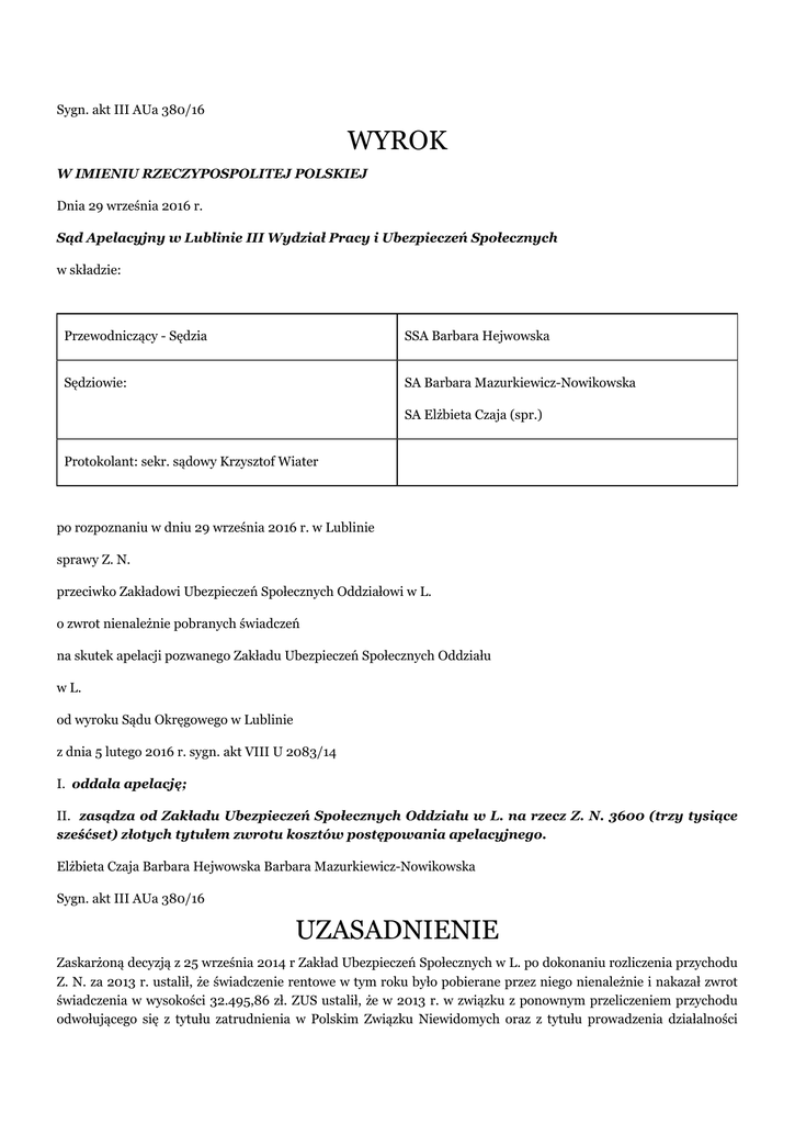 Sygn. akt III AUa 380/16 WYROK W IMIENIU RZECZYPOSPOLITEJ POLSKIEJ Dnia 29 września 2016 r. Sąd Apelacyjny w Lublinie III Wydział Pracy i Ubezpieczeń Społecznych w składzie: Przewodniczący - Sędzia SSA Barbara Hejwowska Sędziowie: SA Barbara Mazurkiewicz-Nowikowska SA Elżbieta Czaja (spr.) Protokolant: sekr. sądowy Krzysztof Wiater po rozpoznaniu w dniu 29 września 2016 r. w Lublinie sprawy Z. N. przeciwko Zakładowi Ubezpieczeń Społecznych Oddziałowi w L. o zwrot nienależnie pobranych świadczeń na skutek apelacji pozwanego Zakładu Ubezpieczeń Społecznych Oddziału w L. od wyroku Sądu Okręgowego w Lublinie z dnia 5 lutego 2016 r. sygn. akt VIII U 2083/14 I. oddala apelację; II. zasądza od Zakładu Ubezpieczeń Społecznych Oddziału w L. na rzecz Z. N. 3600 (trzy tysiące sześćset) złotych tytułem zwrotu kosztów postępowania apelacyjnego. Elżbieta Czaja Barbara Hejwowska Barbara Mazurkiewicz-Nowikowska Sygn. akt III AUa 380/16 UZASADNIENIE Zaskarżoną decyzją z 25 września 2014 r Zakład Ubezpieczeń Społecznych w L. po dokonaniu rozliczenia przychodu Z. N. za 2013 r. ustalił, że świadczenie rentowe w tym roku było pobierane przez niego nienależnie i nakazał zwrot świadczenia w wysokości 32.495,86 zł. ZUS ustalił, że w 2013 r. w związku z ponownym przeliczeniem przychodu odwołującego się z tytułu zatrudnienia w Polskim Związku Niewidomych oraz z tytułu prowadzenia działalności gospodarczej, przychód odwołującego wyniósł 71.133,60 zł i przekroczył wyższą graniczną kwotę ustaloną dla tego roku w wysokości 56.941,30 zł łącznie o kwotę 14192,30 zł. W odwołaniu od decyzji Z. N. podniósł, że z samego faktu podjęcia jedynie czynności przygotowawczych w celu rozpoczęcia prowadzenia działalności gospodarczej w przyszłości nie można wywodzić podstawy do zwiększania kwoty rocznego przychodu. W odpowiedzi na odwołanie ZUS wniósł o jego oddalenie. Wyrokiem z dnia 5 lutego 2016 roku Sąd Okręgowy w Lublinie zmienił zaskarżoną decyzję i ustalił, że Z. N. nie ma obowiązku zwrotu na rzecz Zakładu ubezpieczeń Społecznych kwoty 32 495, 86 tytułem nienależnie pobranego świadczenia , oraz zasądził od Zakładu Ubezpieczeń Społecznych na rzecz Z. N. kwotę 60 zł tytułem zwrotu kosztów procesu. Podstawą wyroku były następujące ustalenia: Z. N., ur. (...), od grudnia 1975 r. pobierał świadczenie rentowe. W okresie od marca 2000 r. do czerwca 2007 r. wypłata świadczenia rentowego została zawieszona z uwagi na osiąganie przez Z. N. z tytułu wynagrodzenia za pracę przychodu w kwocie przekraczającej 130% przeciętnego wynagrodzenia. Z dniem 1 lipca 2007 r. wypłatę świadczenia rentowego wznowiono, co trwało nieprzerwanie do(...)., tj. do osiągnięcia przez Z. N. wieku emerytalnego i przyznania mu emerytury. Świadczenie rentowe wypłacano odwołującemu się w pomniejszonej wysokości, z uwagi na równolegle osiągany przez niego przychód z tytułu wynagrodzenia za pracę. W 2013 roku, z tytułu zatrudnienia na podstawie umowy o pracę w Polskim Związku Niewidomych w L., Z. N. osiągnął przychód w kwocie 44.400 zł, przekraczając tym samym kwotę odpowiadającą 70% przeciętnego wynagrodzenia, wynoszącą 30.661,20 zł. Z tego tytułu wypłacone odwołującemu się świadczenie rentowe za rok 2013 uległo pomniejszeniu o łączną kwotę 6.547,20 zł, co nastąpiło w skutek potrącania odpowiednich kwot ze świadczenia wypłacanego Z. N.. 5 listopada 2010 r. odwołujący się został wpisany do ewidencji działalności gospodarczej pod nazwą: Z. N. Przedsiębiorstwo Usługowo Handlowe (...). Odwołujący się zarejestrował powyższą działalność gospodarczą w związku z planowanym ubieganiem się o pozyskanie środków finansowych z L.(...), pochodzących z Regionalnego Programu Operacyjnego Województwa L. na lata 2007-2013, w ramach programu dotacji dla nowopowstałych mikro przedsiębiorców. Złożony przez Z. N. wniosek został odrzucony z przyczyn formalnych i mimo zgłoszonego sprzeciwu, odwołujący się nie uzyskał żadnego dofinansowania. W dniu 1 grudnia 2012 r. Z. N. dokonał zgłoszenia do ubezpieczenia zdrowotnego z tytułu prowadzonej działalności gospodarczej bowiem udzielono mu informacji, że musi opłacać składki na to ubezpieczenie. W latach 2010-2014 Z. N. nie osiągnął żadnego przychodu z tytułu prowadzenia działalności gospodarczej, bowiem nie rozpoczął jej faktycznego wykonywania. Jedynymi działaniami podjętymi w związku z zarejestrowaną działalnością było zawarcie umowy bezpłatnego użyczenia lokalu na siedzibę przedsiębiorstwa oraz opłacanie składek na ubezpieczenie zdrowotne. Sąd zaznaczył, że niesporny był fakt, że wnioskodawca miał formalnie zarejestrowaną działalność gospodarczą oraz, że opłacał składki na ubezpieczenie zdrowotne. Fakt ten potwierdzały zarówno obdarzone w całości wiarą zeznania wnioskodawcy, jak i przedłożone w sprawie, niekwestionowane dowody z dokumentów, w tym odpisy zeznań podatkowych, z których wynikało, że jedynym źródłem dochodu Z. N. było wynagrodzenie z umowy o pracę oraz pobierane świadczenie rentowe. Zasadniczy spór w przedmiotowej sprawie dotyczył zaś ustalenia czy fakt nie zawieszenia działalności gospodarczej i odprowadzanie składek należy rozumieć, czy też nie, jako faktyczne prowadzenie tej działalności i uzyskiwanie z jej tytułu przychodów. Zgodnie z art. 104 ust. 1 ustawy z dnia 17 grudnia 1998 r. o emeryturach i rentach z Funduszu Ubezpieczeń Społecznych (Dz. U. 2015 poz. 748, tekst jednolity) prawo do emerytury lub renty ulega zawieszeniu lub świadczenia te ulegają zmniejszeniu, na zasadach określonych w ust. 3-8 oraz w art. 105, w razie osiągania przychodu z tytułu działalności podlegającej obowiązkowi ubezpieczenia społecznego, o której mowa w ust. 2 oraz z tytułu służby wymienionej w art. 6 ust. 1 pkt 4 i 6. W myśl ust.
