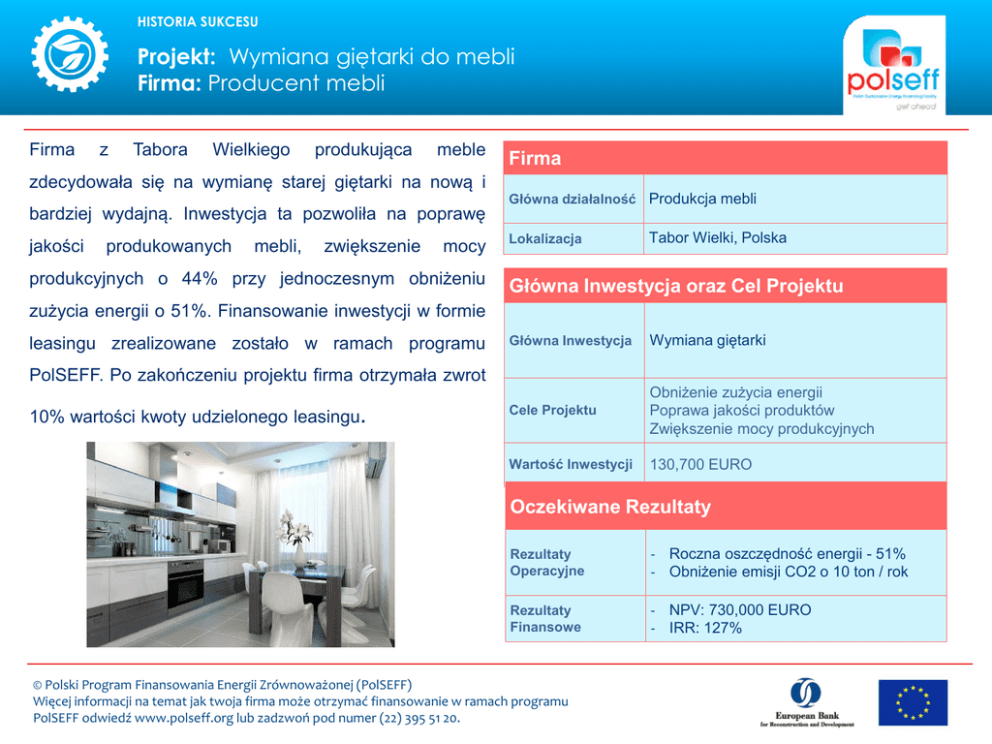 HISTORIA SUKCESU HISTORIE SUKCESÓW Projekt: Wymiana giętarkidodo mebli Projekt: Wymiana obrabiarki metalu Firma: mebli Firma: Producent Producent gotowych elementów z blach Firma z Tabora Przed zdecydowała się Wielkiego produkująca meble na wymianę starej giętarki na nową i modernizacją bardziej wydajną. Inwestycja ta pozwoliła na poprawę jakości produkowanych mebli, zwiększenie mocy produkcyjnych o 44% przy jednoczesnym obniżeniu Po Firma modernizacji Główna działalność Produkcja mebli Lokalizacja Tabor Wielki, Polska Główna Inwestycja oraz Cel Projektu zużycia energii o 51%. Finansowanie inwestycji w formie leasingu zrealizowane zostało w ramach programu Główna Inwestycja Wymiana giętarki Cele Projektu Obniżenie zużycia energii Poprawa jakości produktów Zwiększenie mocy produkcyjnych Wartość Inwestycji 130,700 EURO PolSEFF. Po zakończeniu projektu firma otrzymała zwrot 10% wartości kwoty udzielonego leasingu. Oczekiwane Rezultaty Rezultaty Operacyjne ‐ Roczna oszczędność energii - 51% ‐ Obniżenie emisji CO2 o 10 ton / rok Rezultaty Finansowe ‐ NPV: 730,000 EURO ‐ IRR: 127% © Polski Program Finansowania Energii Zrównoważonej (PolSEFF) Więcej informacji na temat jak twoja firma może otrzymać finansowanie w ramach programu PolSEFF odwiedź www.polseff.org lub zadzwoń pod numer (22) 395 51 20.
