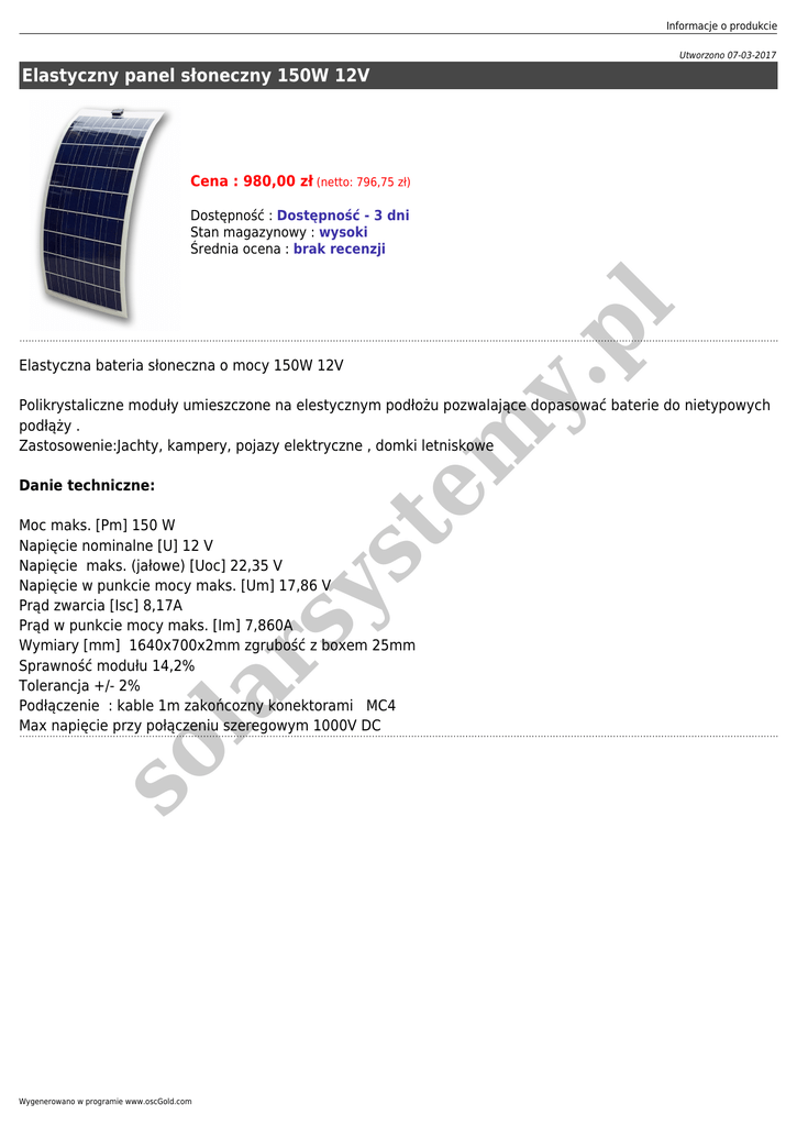 Informacje o produkcie Utworzono 07-03-2017 Elastyczny panel słoneczny 150W 12V Cena : 980,00 zł (netto: 796,75 zł) Elastyczna bateria słoneczna o mocy 150W 12V y. p l Dostępność : Dostępność - 3 dni Stan magazynowy : wysoki Średnia ocena : brak recenzji Danie techniczne: te m Polikrystaliczne moduły umieszczone na elestycznym podłożu pozwalające dopasować baterie do nietypowych podłąży . Zastosowenie:Jachty, kampery, pojazy elektryczne , domki letniskowe so la rs ys Moc maks. [Pm] 150 W Napięcie nominalne [U] 12 V Napięcie maks. (jałowe) [Uoc] 22,35 V Napięcie w punkcie mocy maks. [Um] 17,86 V Prąd zwarcia [Isc] 8,17A Prąd w punkcie mocy maks. [Im] 7,860A Wymiary [mm] 1640x700x2mm zgrubość z boxem 25mm Sprawność modułu 14,2% Tolerancja +/- 2% Podłączenie : kable 1m zakońcozny konektorami MC4 Max napięcie przy połączeniu szeregowym 1000V DC Wygenerowano w programie www.oscGold.com