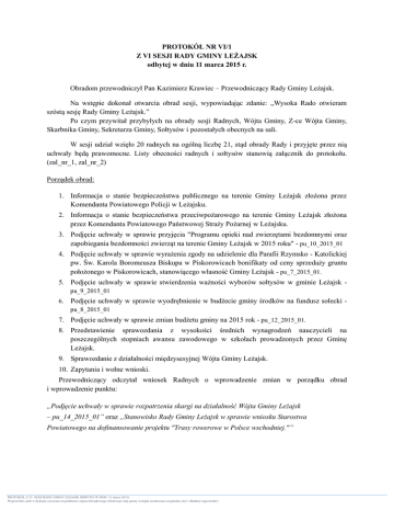 PROTOKÓŁ NR VI/1 Z VI SESJI RADY GMINY LEŻAJSK odbytej w dniu 11 marca 2015 r. Obradom przewodniczył Pan Kazimierz Krawiec – Przewodniczący Rady Gminy Leżajsk. Na wstępie dokonał otwarcia obrad sesji, wypowiadając zdanie: „Wysoka Rado otwieram szóstą sesję Rady Gminy Leżajsk.” Po czym przywitał przybyłych na obrady sesji Radnych, Wójta Gminy, Z-ce Wójta Gminy, Skarbnika Gminy, Sekretarza Gminy, Sołtysów i pozostałych obecnych na sali. W sesji udział wzięło 20 radnych na ogólną liczbę 21, stąd obrady Rady i przyjęte przez nią uchwały będą prawomocne. Listy obecności radnych i sołtysów stanowią załącznik do protokołu. (zal_nr_1, zal_nr_2) Porządek obrad: 1. Informacja o stanie bezpieczeństwa publicznego na terenie Gminy Leżajsk złożona przez Komendanta Powiatowego Policji w Leżajsku. 2. Informacja o stanie bezpieczeństwa przeciwpożarowego na terenie Gminy Leżajsk złożona przez Komendanta Powiatowego Państwowej Straży Pożarnej w Leżajsku. 3. Podjęcie uchwały w sprawie przyjęcia "Programu opieki nad zwierzętami bezdomnymi oraz zapobiegania bezdomności zwierząt na terenie Gminy Leżajsk w 2015 roku" - pu_10_2015_01 4. Podjęcie uchwały w sprawie wyrażenia zgody na udzielenie dla Parafii Rzymsko - Katolickiej pw. Św. Karola Boromeusza Biskupa w Piskorowicach bonifikaty od ceny sprzedaży gruntu położonego w Piskorowicach, stanowiącego własność Gminy Leżajsk - pu_7_2015_01. 5. Podjęcie uchwały w sprawie stwierdzenia ważności wyborów sołtysów w gminie Leżajsk pu_9_2015_01 6. Podjęcie uchwały w sprawie wyodrębnienie w budżecie gminy środków na fundusz sołecki pu_8_2015_01 7. Podjęcie uchwały w sprawie zmian budżetu gminy na 2015 rok - pu_12_2015_01. 8. Przedstawienie sprawozdania z wysokości średnich wynagrodzeń nauczycieli na poszczególnych stopniach awansu zawodowego w szkołach prowadzonych przez Gminę Leżajsk. 9. Sprawozdanie z działalności międzysesyjnej Wójta Gminy Leżajsk. 10. Zapytania i wolne wnioski. Przewodniczący odczytał wniosek Radnych o wprowadzenie zmian w porządku obrad i wprowadzenie punktu: „Podjęcie uchwały w sprawie rozpatrzenia skargi na działalność Wójta Gminy Leżajsk – pu_14_2015_01” oraz „Stanowisko Rady Gminy Leżajsk w sprawie wniosku Starostwa Powiatowego na dofinansowanie projektu "Trasy rowerowe w Polsce wschodniej."” PROTOKÓŁ Z VI SESJI RADY GMINY LEŻAJSK ODBYTEJ W DNIU 11 marca 2015r. Wypowiedzi osób w dyskusji cytowano na podstawie zapisu dźwiękowego obrad sesji rady gminy Leżajsk (zachowano oryginalny styl i składnię wypowiedzi) Głosowanie Nr 1 w sprawie zmiany porządku obrad W głosowaniu udział wzięło 20 radnych Za wnioskiem głosowało 20 Przeciw głosowało 0 Wstrzymało się 0 Wniosek został przyjęty. Głosowanie Nr 2 w sprawie zmiany porządku obrad W głosowaniu udział wzięło 20 radnych Za wnioskiem głosowało 20 Przeciw głosowało 0 Wstrzymało się 0 Wniosek został przyjęty. Porządek obrad po zmianach: 1. Informacja o stanie bezpieczeństwa publicznego na terenie Gminy Leżajsk złożona przez Komendanta Powiatowego Policji w Leżajsku. 2. Informacja o stanie bezpieczeństwa przeciwpożarowego na terenie Gminy Leżajsk złożona przez Komendanta Powiatowego Państwowej Straży Pożarnej w Leżajsku. 3. Podjęcie uchwały w sprawie przyjęcia "Programu opieki nad zwierzętami bezdomnymi oraz zapobiegania bezdomności zwierząt na terenie Gminy Leżajsk w 2015 roku" - pu_10_2015_01 4. Podjęcie uchwały w sprawie wyrażenia zgody na udzielenie dla Parafii Rzymsko - Katolickiej pw. Św. Karola Boromeusza Biskupa w Piskorowicach bonifikaty od ceny sprzedaży gruntu położonego w Piskorowicach, stanowiącego własność Gminy Leżajsk - pu_7_2015_01. 5. Podjęcie uchwały w sprawie stwierdzenia ważności wyborów sołtysów w gminie Leżajsk pu_9_2015_01 6. Podjęcie uchwały w sprawie wyodrębnienie w budżecie gminy środków na fundusz sołecki pu_8_2015_01 7. Podjęcie uchwały w sprawie zmian budżetu gminy na 2015 rok - pu_12_2015_01. 8. Przedstawienie sprawozdania z wysokości średnich wynagrodzeń nauczycieli na poszczególnych stopniach awansu zawodowego w szkołach prowadzonych przez Gminę Leżajsk. 9. Podjęcie uchwały w sprawie rozpatrzenia skargi na Wójta Gminy Leżajsk – pu_14_2015_01. 10. Stanowisko Rady Gminy Leżajsk w sprawie wniosku Starostwa Powiatowego na dofinansowanie projektu "Trasy rowerowe w Polsce wschodniej." 11. Sprawozdanie z działalności międzysesyjnej Wójta Gminy Leżajsk. 12. Zapytania i wolne wnioski. PROTOKÓŁ Z VI SESJI RADY GMINY LEŻAJSK ODBYTEJ W DNIU 11 marca 2015r. Wypowiedzi osób w dyskusji cytowano na podstawie zapisu dźwiękowego obrad sesji rady gminy Leżajsk (zachowano oryginalny styl i składnię wypowiedzi) Ad. 1 Informacja o stanie bezpieczeństwa publicznego na terenie Gminy Leżajsk złożona przez Komendanta Powiatowego Policji w Leżajsku. Pan Kazimierz Krawiec – Przewodniczący Rady (06:49) – otworzył dyskusję do punktu pierwszego porządku obrad. Pan mł. insp. mgr Wacław Sobol – I Zastępca Komendanta Powiatowego Policji w Leżajsk (07:00) – przedstawił informację dotyczącą analizy stanu bezpieczeństwa i porządku publicznego na terenie Gminy Leżajsk za okres 2014 r. (informacja stanowi załącznik nr 3 do niniejszego protokołu) Pan Robert Mądry – radny gminy (18:41) – cyt. „Panie Przewodniczący, Szanowni Państwo, Panie Komendancie jedno pytanie dotyczące Giedlarowej, skrzyżowanie na drodze wojewódzkiej, z którego mamy zjazd od strony Łańcuta do cmentarza, czy ten temat jest procentowany jakoś dalej i prowadzony i czy możemy się spodziewać formalnego załatwiania możliwości tam zjazdu od strony Łańcuta do cmentarza.” Pan mł. insp. mgr Wacław Sobol - I Zastępca Komendanta Powiatowego Policji w Leżajsk (18:59) cyt. „Chodzi od strony Łańcuta do cmentarza, przed cmentarzem. Powiem tak wysłaliśm