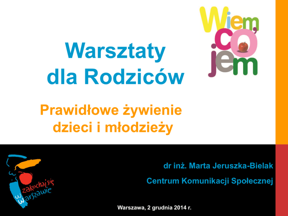 Warsztaty dla Rodziców Prawidłowe żywienie dzieci i młodzieży dr inż. Marta Jeruszka-Bielak Centrum Komunikacji Społecznej Warszawa, 2 grudnia 2014 r. Prawidłowe żywienie dzieci i młodzieży Aby żywienie dzieci i młodzieży było prawidłowe, warto na co dzień wdrażać zasady tzw. „7 U” opracowane przez prof. Stanisława Bergera (omówione na kolejnych slajdach), a także stosować zalecenia prezentowane w piramidzie żywieniowej. Istnieją również zalecenia zdrowego żywienia w formie tekstowej, opracowane przez Instytut Żywności i Żywienia, dostępne na stronie internetowej IŻŻ. Prawidłowe żywienie 7 zasad wg prof. Bergera • • • • • Urozmaicenie Uregulowanie Umiarkowanie Umiejętności Unikanie + Uprawianie sportu + Uśmiech na co dzień Urozmaicenie Urozmaicenie diety to nie tylko spożywanie różnorodnych produktów i przyrządzanie niemonotonnych posiłków. Ważne jest również urozmaicanie jadłospisu pod względem smaku, zapachu, barwy, konsystencji oraz stosowanych technik kulinarnych. Ponieważ nie istnieje produkt spożywczy, który zawierałby wszystkie składniki odżywcze w odpowiedniej ilości i proporcjach, dlatego ważny jest różnorodny wybór żywności ze wszystkich grup: produktów zbożowych, warzyw, owoców, mleka i jego przetworów, produktów białkowych (mięsa, drobiu, ryb, suchych nasion roślin strączkowych, orzechów) oraz tłuszczów. Urozmaicenie – cd. Urozmaicenie posiłków pod względem smaku i zapachu, polega na tym, aby w ciągu dnia, a także w jednym posiłku wykorzystywane były produkty o różnych smakach, tj. słodkim, słonym, kwaśnym, gorzkim, czy umami (występuje naturalnie w wielu produktach spożywczych, m.in. pomidorach, cebuli, brokułach, parmezanie, łososiu, grzybach, orzechach). Ważne jest, aby potrawy z dominującym słodkim smakiem nie występowały częściej niż 1-2 razy dziennie i nie kolejno po sobie, np. jeśli śniadanie jest słodkie (owsianka na mleku z owocami), to na II śniadanie należy podać kanapkę/sałatkę z warzywami i serem/rybą/wędliną, a nie jogurt owocowy. Urozmaicenie – cd. Zasada urozmaicenia potraw i posiłków pod względem barwy, spełnia kilka ważnych funkcji. Po pierwsze uatrakcyjnia danie i zachęca dzieci do jedzenia („jemy” również oczami), a po drugie zwiększa ich wartość odżywczą, gdyż „koloryt” potrawom nadają głównie warzywa i owoce. Dla przykładu, obiad w postaci kaszy pęczak z pulpetem drobiowym w sosie śmietanowym i białą kapustą będzie wyglądał monotonnie (wszystko w kolorze szarokremowym). Wystarczy do surówki dodać marchewkę albo podać kolorowe gotowane warzywa, a wszystko posypać np. koperkiem. Urozmaicenie – cd. Urozmaicenie konsystencji posiłków jest ważne dla prawidłowej pracy przewodu pokarmowego i narządów żucia, dlatego należy podawać, również w jednym posiłku, produkty o zróżnicowanej konsystencji, np. produkty o konsystencji stałej (np. porcja mięsa), półstałej (np. surówka), papkowatej (np. ziemniaki) i płynnej (np. zupa). Urozmaicenie pod względem obróbki kulinarnej również uatrakcyjnia menu, bo ten sam produkt inaczej będzie smakował, ale również będzie miał inną wartość odżywczą, gdy ugotujemy go na parze lub w wodzie, upieczemy, udusimy, czy usmażymy. Uregulowanie Termin regularności odnosi się do stałych pór jedzenia, które powinny być dostosowane do harmonogramu dnia dziecka (liczby godzin spędzonych w szkole, zajęć dodatkowych). Regularne spożywanie posiłków obniża ryzyko wystąpienia dziecięcej nadwagi, otyłości i cukrzycy poprzez zapobieganie wahaniom cukru we krwi. Systematyczne (o podobnej porze dnia) dostarczanie energii i składników odżywczych w postaci jedzenia sprzyja ich lepszemu wykorzystaniu przez organizm dziecka. Uregulowanie – cd. Rozkład posiłków w ciągu dnia szkolnego 7.00 śniadanie 10.00 13.00 II śniadanie obiad 16.00 podwieczorek 19.00 kolacja szkoła Ważne jest, aby dzieci i młodzież spożywały 5 posiłków dziennie, a przerwy pomiędzy nimi wynosiły ok. 3-3,5 godzinny. Podjadanie, czyli jedzenie ulubionych produktów między posiłkami, powinno być znacznie ograniczone (a najlepiej całkowicie wyeliminowane). W szkole, uczniowie powinni zjeść przynajmniej 2 posiłki, czyli II śniadanie i obiad. Umiarkowanie Umiarkowanie polega na dostosowaniu wielkości posiłków do wieku, płci, aktywności fizycznej, a także możliwości konsumpcyjnych dziecka. Ważne, by dziecko wstając od stołu było syte, lecz nieprzejedzone. Wskaźnikiem umiarkowania jest masa ciała – jeżeli dziecko waży za dużo w stosunku do swego wzrostu i wieku na ogół oznacza to, iż je za dużo (bądź ma za mało ruchu). Jeżeli waży zbyt mało i chudnie – przyjmuje niedostateczną ilość pożywienia. Nawet prawidłowo zbilansowane posiłki serwowane w nadmiarze lub niedomiarze będą szkodziły. Ważne, by dziecko jadło przy stole, a nie przed komputerem i telewizorem, ponieważ pochłonięte grą lub bajką często nie kontroluje, ile zjada pożywienia, co przyczynia się do rozwoju nadwagi i otyłości. Umiejętności Zasad ta odnosi się m.in. do umiejętności przygotowywania potraw. Uczenie dziecka i włączanie w prace kuchenne od najmłodszych lat przyczyni się do jego usamodzielniania, a także zwiększania świadomości żywieniowej i najczęściej poprawy jakości żywienia. Dziecko, które zaangażujemy do robienia zakupów, „gotowania”, czy nakrywania stołu, będzie chętniej jadło posiłki, a także próbowało nowych potraw, zwłaszcza tych, które na ogół wzbudzają niechęć dzieci. Unikanie, m.in. nadmiaru cukru Nadmiar węglowodanów prostych w diecie (cukru, słodyczy, słodkich napojów) prowadzi do nadwagi, otyłości i rozwoju chorób takich, jak cukrzyca typu I, typu II. W codziennej diecie podstawę powinny stanowić węglowodany złożone (dostarczane głównie z pieczywem, makaronem