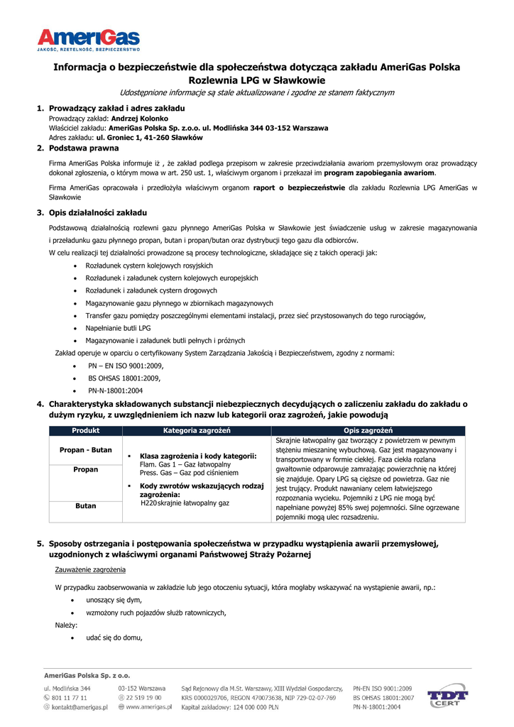 Informacja o bezpieczeństwie dla społeczeństwa dotycząca zakładu AmeriGas Polska Rozlewnia LPG w Sławkowie Udostępnione informacje są stale aktualizowane i zgodne ze stanem faktycznym 1. Prowadzący zakład i adres zakładu Prowadzący zakład: Andrzej Kolonko Właściciel zakładu: AmeriGas Polska Sp. z.o.o. ul. Modlińska 344 03-152 Warszawa Adres zakładu: ul. Groniec 1, 41-260 Sławków 2. Podstawa prawna Firma AmeriGas Polska informuje iż , że zakład podlega przepisom w zakresie przeciwdziałania awariom przemysłowym oraz prowadzący dokonał zgłoszenia, o którym mowa w art. 250 ust. 1, właściwym organom i przekazał im program zapobiegania awariom. Firma AmeriGas opracowała i przedłożyła właściwym organom raport o bezpieczeństwie dla zakładu Rozlewnia LPG AmeriGas w Sławkowie 3. Opis działalności zakładu Podstawową działalnością rozlewni gazu płynnego AmeriGas Polska w Sławkowie jest świadczenie usług w zakresie magazynowania i przeładunku gazu płynnego propan, butan i propan/butan oraz dystrybucji tego gazu dla odbiorców. W celu realizacji tej działalności prowadzone są procesy technologiczne, składające się z takich operacji jak: Rozładunek cystern kolejowych rosyjskich Rozładunek i załadunek cystern kolejowych europejskich Rozładunek i załadunek cystern drogowych Magazynowanie gazu płynnego w zbiornikach magazynowych Transfer gazu pomiędzy poszczególnymi elementami instalacji, przez sieć przystosowanych do tego rurociągów, Napełnianie butli LPG Magazynowanie i załadunek butli pełnych i próżnych Zakład operuje w oparciu o certyfikowany System Zarządzania Jakością i Bezpieczeństwem, zgodny z normami: PN – EN ISO 9001:2009, BS OHSAS 18001:2009, PN-N-18001:2004 4. Charakterystyka składowanych substancji niebezpiecznych decydujących o zaliczeniu zakładu do zakładu o dużym ryzyku, z uwzględnieniem ich nazw lub kategorii oraz zagrożeń, jakie powodują Produkt Propan - Butan Kategoria zagrożeń Klasa zagrożenia i kody kategorii: Flam. Gas 1 – Gaz łatwopalny Press. Gas – Gaz pod ciśnieniem Kody zwrotów wskazujących rodzaj zagrożenia: H220 skrajnie łatwopalny gaz Propan Butan Opis zagrożeń Skrajnie łatwopalny gaz tworzący z powietrzem w pewnym stężeniu mieszaninę wybuchową. Gaz jest magazynowany i transportowany w formie ciekłej. Faza ciekła rozlana gwałtownie odparowuje zamrażając powierzchnię na której się znajduje. Opary LPG są cięższe od powietrza. Gaz nie jest trujący. Produkt nawaniany celem łatwiejszego rozpoznania wycieku. Pojemniki z LPG nie mogą być napełniane powyżej 85% swej pojemności. Silne ogrzewane pojemniki mogą ulec rozsadzeniu. 5. Sposoby ostrzegania i postępowania społeczeństwa w przypadku wystąpienia awarii przemysłowej, uzgodnionych z właściwymi organami Państwowej Straży Pożarnej Zauważenie zagrożenia W przypadku zaobserwowania w zakładzie lub jego otoczeniu sytuacji, która mogłaby wskazywać na wystąpienie awarii, np.: unoszący się dym, wzmożony ruch pojazdów służb ratowniczych, Należy: udać się do domu, pozamykać wszystkie drzwi i okna, przygotować się do ewentualnej ewakuacji w przypadku usłyszenia sygnału alarmowego lub komunikatu o konieczności opuszczenia budynku Ewakuacja Sygnały alarmowe: komunikaty głosowe przekazywane za pośrednictwem sprzętu nagłaśniającego pojazdów służb ratowniczych i współdziałających, modulowany dźwięk syreny w okresie 3 minuty, Miejsce zbiórki osób ewakuowanych: Mieszkańcy domów znajdujących się przy ulicy Groniec (od nr 4 do nr 37) oraz pracownicy zakładów znajdujących się w przewidywanych strefach – skrzyżowanie ulicy Rudna i Groniec, Dodatkowe wskazówki co do ewakuacji: Po usłyszeniu sygnału alarmowego lub innego wezwania do opuszczenia mieszkania, zachowując spokój, bezzwłocznie: o pozamykaj wszystkie okna i wyłącz wszystkie odbiorniki elektryczne i urządzenia gazowe, o zabierz dokumenty i ciepłą odzież, o opuść mieszkanie i udaj się do wyznaczonego miejsca zbiórki, o otocz szczególna opieką dzieci i osoby starsze, Wykonuj polecenia osób prowadzących ewakuację, Przenieść się z miejsca zbiórki do wyznaczonych miejsc tymczasowego pobytu, w wykorzystując udostępniony środek transportu. 6. Główne scenariusze awarii przemysłowej oraz środki bezpieczeństwa, które zostaną podjęte w przypadku wystąpienia awarii Analiza bezpieczeństwa wykonana przez wykwalifikowany zespół specjalistów wskazała 4 reprezentatywne scenariusze katastrofalnej awarii przemysłowej: Wyciek LPG i jego wybuch oraz następujący pożar na stanowisku załadunku / rozładunku cystern kolejowych. Scenariusz taki może doprowadzić do fizycznego wybuchu zbiornika cysterny kolejowej, Wyciek LPG i jego wybuch oraz następujący pożar na stanowisku załadunku / rozładunku cystern drogowych. Scenariusz taki może doprowadzić do fizycznego wybuchu zbiornika cysterny kolejowej, Pęknięcie rurociągu w którym transferowany jest gaz, oraz następujący po nim wyciek, wybuch oraz pożar, Wyciek LPG i jego wybuch oraz następujący pożar w pompowni produkcyjnej. Prawdopodobieństwo powyższych zdarzeń jest bliskie 0, a obiekt w Sławkowie jest przygotowany na ewentualne wystąpienie takich zdarzeń. Wdrożony plan wewnętrzny operacyjno-ratowniczy, oraz instrukcja bezpieczeństwa pożarowego w połączeniu z regularnymi ćwiczeniami i szeregiem zabezpieczeń sprawiają, iż każde zagrożenie zostanie zażegnane nim rozwinie się w powyższy scenariusz katastrofy.