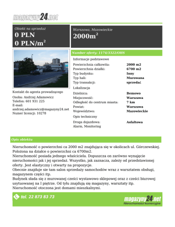 Obiekt na sprzedaż 0 PLN 2 0 PLN/m Warszawa, Mazowieckie 2 2000m Number oferty: 1174/3322/OHS Informacje podstawowe Powierzchnia całkowita: Powierzchnia działki: Typ budynku: Typ hali: Typ transakcji: 2000 m2 6700 m2 Inny Murowana sprzeda¿ Lokalizacja Kontakt do agenta prowadzącego Osoba: Andrzej Adamowicz Telefon: 601 931 225 E-mail: [email protected] Numer licencji: 10278 Dzielnica: Miejscowość: Odległość do centrum miasta: Powiat: Województwo: Bemowo Warszawa 7 km Warszawa Mazowieckie Opis techniczny Droga dojazdowa: Alarm, Monitoring Asfaltowa Opis obiektu Nieruchomość o powierzchni ca 2000 m2 znajdująca się w okolicach ul. Górczewskiej. Polożona na działce o powierzchni ca 6700m2. Nieruchomość posiada jednego właściciela. Dopuszcza on zarówno wynajęcie nieruchomości jak i jej sprzedaż. Wszystko, jak zaznacza, zależy od przedstawionej oferty. Jest elastyczny i otwarty na propozycje. Obecnie znajduje sie tam salon sprzedaży samochodów wraz z warsztatem obsługi, magazynem części itp. Budynek słada się z murowanej cześci wystawowo sklepowej oraz z cześci biurowej usytuowanej na I piętrze. Od tyłu znajdują się magazyny, warsztaty itp. Nieruchomość otoczona jest domami mieszkalnymi.