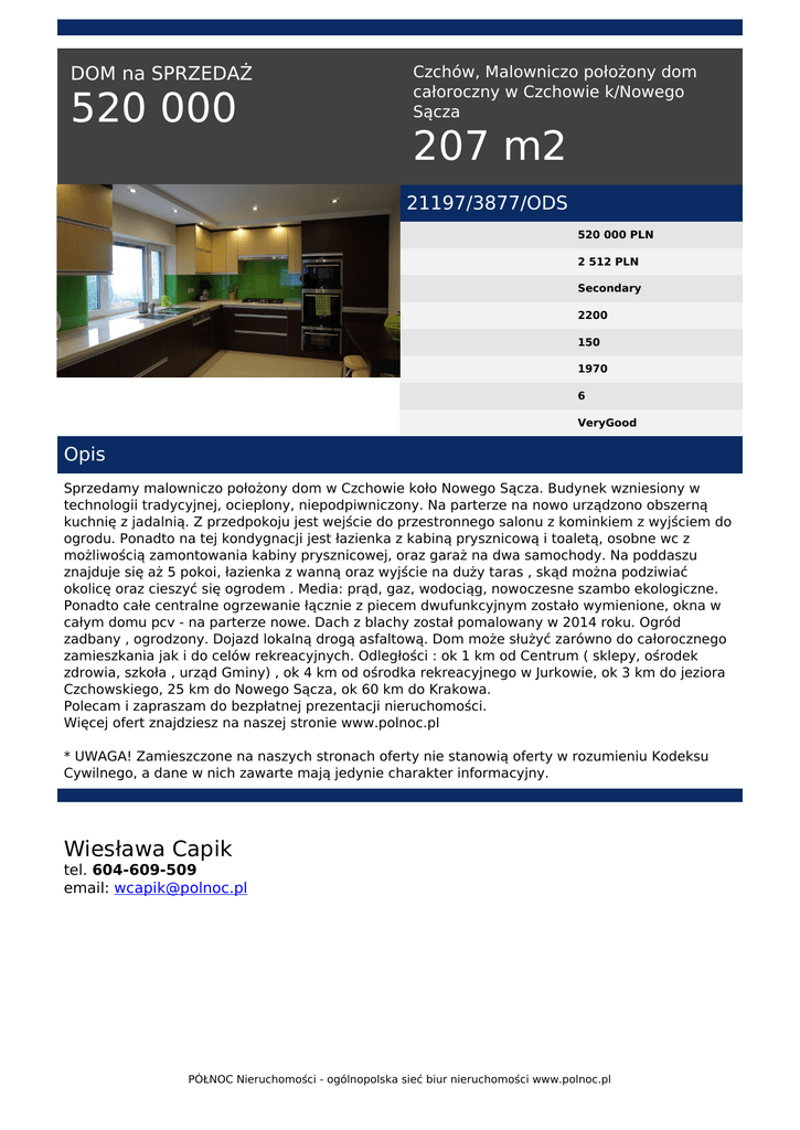 DOM na SPRZEDAŻ 520 000 Czchów, Malowniczo położony dom całoroczny w Czchowie k/Nowego Sącza 207 m2 21197/3877/ODS 520 000 PLN 2 512 PLN Secondary 2200 150 1970 6 VeryGood Opis Sprzedamy malowniczo położony dom w Czchowie koło Nowego Sącza. Budynek wzniesiony w technologii tradycyjnej, ocieplony, niepodpiwniczony. Na parterze na nowo urządzono obszerną kuchnię z jadalnią. Z przedpokoju jest wejście do przestronnego salonu z kominkiem z wyjściem do ogrodu. Ponadto na tej kondygnacji jest łazienka z kabiną prysznicową i toaletą, osobne wc z możliwością zamontowania kabiny prysznicowej, oraz garaż na dwa samochody. Na poddaszu znajduje się aż 5 pokoi, łazienka z wanną oraz wyjście na duży taras , skąd można podziwiać okolicę oraz cieszyć się ogrodem . Media: prąd, gaz, wodociąg, nowoczesne szambo ekologiczne. Ponadto całe centralne ogrzewanie łącznie z piecem dwufunkcyjnym zostało wymienione, okna w całym domu pcv - na parterze nowe. Dach z blachy został pomalowany w 2014 roku. Ogród zadbany , ogrodzony. Dojazd lokalną drogą asfaltową. Dom może służyć zarówno do całorocznego zamieszkania jak i do celów rekreacyjnych. Odległości : ok 1 km od Centrum ( sklepy, ośrodek zdrowia, szkoła , urząd Gminy) , ok 4 km od ośrodka rekreacyjnego w Jurkowie, ok 3 km do jeziora Czchowskiego, 25 km do Nowego Sącza, ok 60 km do Krakowa. Polecam i zapraszam do bezpłatnej prezentacji nieruchomości. Więcej ofert znajdziesz na naszej stronie www.polnoc.pl * UWAGA! Zamieszczone na naszych stronach oferty nie stanowią oferty w rozumieniu Kodeksu Cywilnego, a dane w nich zawarte mają jedynie charakter informacyjny. Wiesława Capik tel. 604-609-509 email: [email protected] PÓŁNOC Nieruchomości - ogólnopolska sieć biur nieruchomości www.polnoc.pl Powered by TCPDF (www.tcpdf.org)