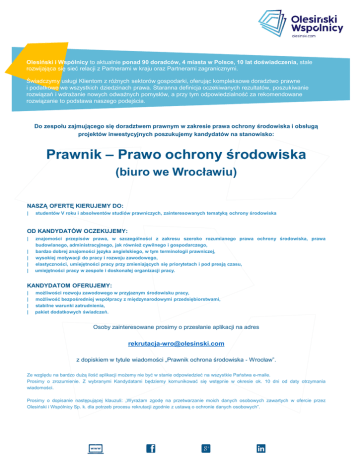 Olesiński i Wspólnicy to aktualnie ponad 90 doradców, 4 miasta w Polsce, 10 lat doświadczenia, stale rozwijająca się sieć relacji z Partnerami w kraju oraz Partnerami zagranicznymi. Świadczymy usługi Klientom z różnych sektorów gospodarki, oferując kompleksowe doradztwo prawne i podatkowe we wszystkich dziedzinach prawa. Staranna definicja oczekiwanych rezultatów, poszukiwanie rozwiązań i wdrażanie nowych odważnych pomysłów, a przy tym odpowiedzialność za rekomendowane rozwiązanie to podstawa naszego podejścia. Do zespołu zajmującego się doradztwem prawnym w zakresie prawa ochrony środowiska i obsługą projektów inwestycyjnych poszukujemy kandydatów na stanowisko: Prawnik – Prawo ochrony środowiska (biuro we Wrocławiu) NASZĄ OFERTĘ KIERUJEMY DO: | studentów V roku i absolwentów studiów prawniczych, zainteresowanych tematyką ochrony środowiska OD KANDYDATÓW OCZEKUJEMY: | | | | | znajomości przepisów prawa, w szczególności z zakresu szeroko rozumianego prawa ochrony środowiska, prawa budowlanego, administracyjnego, jak również cywilnego i gospodarczego, bardzo dobrej znajomości języka angielskiego, w tym terminologii prawniczej, wysokiej motywacji do pracy i rozwoju zawodowego, elastyczności, umiejętności pracy przy zmieniających się priorytetach i pod presją czasu, umiejętności pracy w zespole i doskonałej organizacji pracy. KANDYDATOM OFERUJEMY: | | | | możliwości rozwoju zawodowego w przyjaznym środowisku pracy, możliwość bezpośredniej współpracy z międzynarodowymi przedsiębiorstwami, stabilne warunki zatrudnienia, pakiet dodatkowych świadczeń. Osoby zainteresowane prosimy o przesłanie aplikacji na adres [email protected] z dopiskiem w tytule wiadomości „Prawnik ochrona środowiska - Wrocław”. Ze względu na bardzo dużą ilość aplikacji możemy nie być w stanie odpowiedzieć na wszystkie Państwa e-maile. Prosimy o zrozumienie. Z wybranymi Kandydatami będziemy komunikować się wstępnie w okresie ok. 10 dni od daty otrzymania wiadomości. Prosimy o dopisanie następującej klauzuli: „Wyrażam zgodę na przetwarzanie moich danych osobowych zawartych w ofercie przez Olesiński i Wspólnicy Sp. k. dla potrzeb procesu rekrutacji zgodnie z ustawą o ochronie danych osobowych”.
