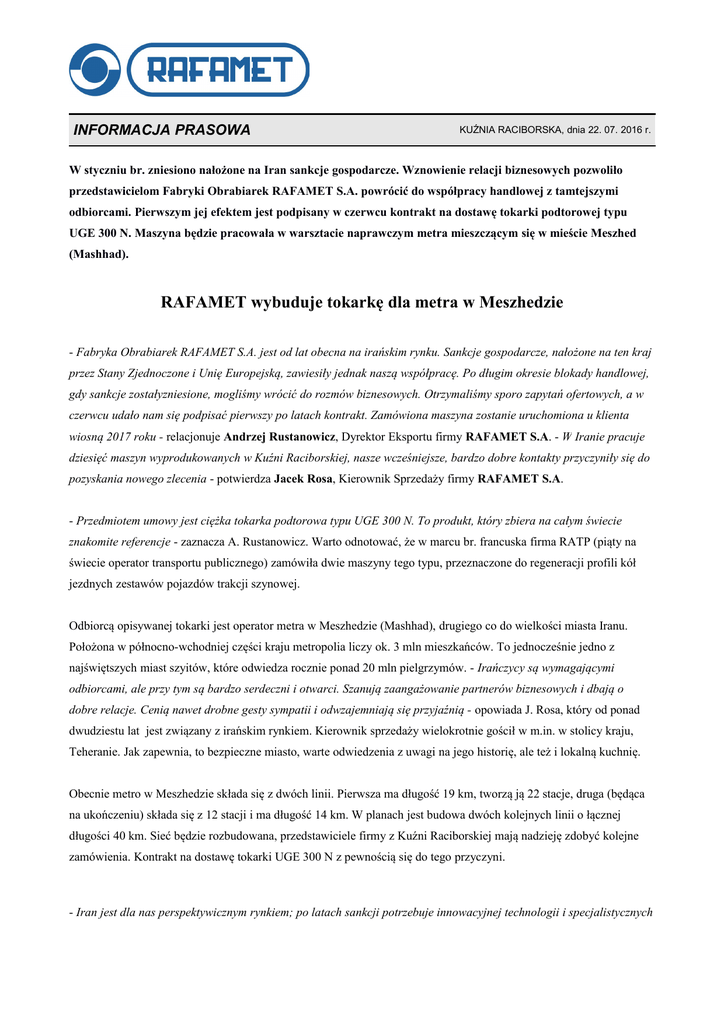 INFORMACJA PRASOWA KUŹNIA RACIBORSKA, dnia 22. 07. 2016 r. W styczniu br. zniesiono nałożone na Iran sankcje gospodarcze. Wznowienie relacji biznesowych pozwoliło przedstawicielom Fabryki Obrabiarek RAFAMET S.A. powrócić do współpracy handlowej z tamtejszymi odbiorcami. Pierwszym jej efektem jest podpisany w czerwcu kontrakt na dostawę tokarki podtorowej typu UGE 300 N. Maszyna będzie pracowała w warsztacie naprawczym metra mieszczącym się w mieście Meszhed (Mashhad). RAFAMET wybuduje tokarkę dla metra w Meszhedzie - Fabryka Obrabiarek RAFAMET S.A. jest od lat obecna na irańskim rynku. Sankcje gospodarcze, nałożone na ten kraj przez Stany Zjednoczone i Unię Europejską, zawiesiły jednak naszą współpracę. Po długim okresie blokady handlowej, gdy sankcje zostałyzniesione, mogliśmy wrócić do rozmów biznesowych. Otrzymaliśmy sporo zapytań ofertowych, a w czerwcu udało nam się podpisać pierwszy po latach kontrakt. Zamówiona maszyna zostanie uruchomiona u klienta wiosną 2017 roku - relacjonuje Andrzej Rustanowicz, Dyrektor Eksportu firmy RAFAMET S.A. - W Iranie pracuje dziesięć maszyn wyprodukowanych w Kuźni Raciborskiej, nasze wcześniejsze, bardzo dobre kontakty przyczyniły się do pozyskania nowego zlecenia - potwierdza Jacek Rosa, Kierownik Sprzedaży firmy RAFAMET S.A. - Przedmiotem umowy jest ciężka tokarka podtorowa typu UGE 300 N. To produkt, który zbiera na całym świecie znakomite referencje - zaznacza A. Rustanowicz. Warto odnotować, że w marcu br. francuska firma RATP (piąty na świecie operator transportu publicznego) zamówiła dwie maszyny tego typu, przeznaczone do regeneracji profili kół jezdnych zestawów pojazdów trakcji szynowej. Odbiorcą opisywanej tokarki jest operator metra w Meszhedzie (Mashhad), drugiego co do wielkości miasta Iranu. Położona w północno-wchodniej części kraju metropolia liczy ok. 3 mln mieszkańców. To jednocześnie jedno z najświętszych miast szyitów, które odwiedza rocznie ponad 20 mln pielgrzymów. - Irańczycy są wymagającymi odbiorcami, ale przy tym są bardzo serdeczni i otwarci. Szanują zaangażowanie partnerów biznesowych i dbają o dobre relacje. Cenią nawet drobne gesty sympatii i odwzajemniają się przyjaźnią - opowiada J. Rosa, który od ponad dwudziestu lat jest związany z irańskim rynkiem. Kierownik sprzedaży wielokrotnie gościł w m.in. w stolicy kraju, Teheranie. Jak zapewnia, to bezpieczne miasto, warte odwiedzenia z uwagi na jego historię, ale też i lokalną kuchnię. Obecnie metro w Meszhedzie składa się z dwóch linii. Pierwsza ma długość 19 km, tworzą ją 22 stacje, druga (będąca na ukończeniu) składa się z 12 stacji i ma długość 14 km. W planach jest budowa dwóch kolejnych linii o łącznej długości 40 km. Sieć będzie rozbudowana, przedstawiciele firmy z Kuźni Raciborskiej mają nadzieję zdobyć kolejne zamówienia. Kontrakt na dostawę tokarki UGE 300 N z pewnością się do tego przyczyni. - Iran jest dla nas perspektywicznym rynkiem; po latach sankcji potrzebuje innowacyjnej technologii i specjalistycznych INFORMACJA PRASOWA KUŹNIA RACIBORSKA, dnia 22. 07. 2016 r. maszyn. Kilka miast planuje inwestycje w istniejące już linie metra, rozbudowana ma zostać kolej, sektor energetyczny także potrzebuje modernizacji. Zainteresowanie naszym asortymentem jest duże. Mamy nadzieję, że - przy wsparciu polskiej ambasady i sprzyjającej międzynarodowej sytuacji politycznej - będziemy mogli zapełnić lukę powstałą po blokadzie handlowej - puentuje A. Rustanowicz. *** RAFAMET S.A. Fabryka Obrabiarek RAFAMET S.A. z Kuźni Raciborskiej jest jednym z kilku na świecie producentów obrabiarek specjalnych do obróbki zestawów kołowych pojazdów szynowych (kolej, metro, tramwaje). Wykonuje również, na jednostkowe zamówienia, wielkogabarytowe obrabiarki specjalistyczne dla odbiorców w sektorach: energetycznym, maszynowym, stoczniowym, hutniczym oraz zbrojeniowym. Udział eksportu w sprzedaży to około 70-80 proc. Kapitał zakładowy wynosi 43.187.010,00 zł.