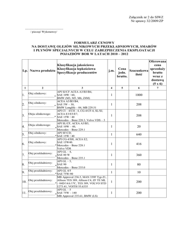 Załącznik nr 2 do SIWZ Nr sprawy 32/2009/ZP ........................................... / pieczęć Wykonawcy/ FORMULARZ CENOWY NA DOSTAWĘ OLEJÓW SILNIKOWYCH PRZEKŁADNIOWYCH, SMARÓW I PŁYNÓW SPECJALNYCH W CELU ZABEZPIECZENIA EKSPLOATACJI POJAZDÓW BOR W LATACH 2010 – 2012 Klasyfikacja jakościowa Klasyfikacja lepkościowa Lp. Nazwa produktu Specyfikacje producentów 1 1. 2. 3. 4. 5. 6. 7. 8. 9. 10. 11. 2 3 API SJ/CF ACEA A3/B3/B4, Olej silnikowy: SAE 10W / 60, ...................................* BMW (M3, M5, M6, Z4M) ACEA A3/B3/B4, Olej silnikowy: SAE 5W – 30, ...................................* BMW Longlife – 04, MB 229.51 API CI – 4/CH - 4, CG-4/CF-4, SL/SJ, Oleju silnikowego: ACEA E3/E5/E7, ...................................* SAE 15W / 40 Mercedes – Benz 228.3, Volvo VDS – 3 API SL/CF, ACEA A3/B3, Oleju silnikowego: SAE 10W – 40, ....................................* Mercedes – Benz 229.1 Olej silnikowy: API SF/CD; ....................................* SAE 15W / 40 API CG-4/SH, ACEA E2, Olej silnikowy: SAE 15W40. ....................................* Mercedes – Benz 228.1 Volvo VDS API GL – 4, Olej przekładniowy: SAE 80 W ....................................* Mercedes – Benz 235.1 API GL – 5, Olej przekładniowy: SAE 90 ....................................* Mercedes – Benz 235.0 Olej przekładniowy: API GL 4/5 ....................................* SAE 75W-90 MB Approval 236.5, MAN 339F Typ Z1, Olej przekładniowy: Allison TES 389, Allison C4, ZF TE ML ....................................* – 04D/14A/17C, TES 389, VOLVO STD 1273.41, VOITH 55.6335 API GL – 5 Olej przekładniowy: SAE 75W – 140 ....................................* MB Approval 235.61, BMW (LS) Oferowana cena sprzedaŜy Cena Szacunkowa j.m. brutto jedn. ilość wraz z brutto. dostawą (5 x 6) 4 5 6 l 1000 l 208 l 208 l 20 l 640 l 416 l 360 l 80 l 10 l 200 l 200 7 12. 13. 14. 15. 16. 17. 18. API GL – 5 SAE 75W – 90 Olej przekładniowy: BMW (non LS) ....................................* Zatwierdzony do przekładni głównych BMW bez blokady płytkowej Olej przekładniowy: API GL – 5, ....................................* SAE 80W / 90. Olej przeznaczany do przekładni typu Olej przekładniowy: ATF i niektórych napędów ....................................* hydraulicznych DEXRON DX II D, Mercedes Benz 236.6 Olej hydrauliczny: HLP- Z 46 ....................................* Olej hydrauliczny: RC – R 46 ....................................* Gotowy do uŜycia płyn niskokrzepnący do układu chłodzenia silników benzynowych i wysokopręŜnych wyposaŜonych w Ŝeliwne i aluminiowe systemy chłodzenia, chroniący przed Płyn niskokrzepnący do zamarzaniem i korozją, na bazie glikolu układu chłodzenia: monoetylenowego. Minimalna ....................................* temperatura krystalizacji co najmniej – 35 °C, Płyn chłodzący musi spełniać poniŜsze normy: − PN-C-40007 ASTM D 4656 Płyn niskokrzepnący do układu chłodzenia: VW TL 774F l 25 l 360 l 80 l 50 l 20 l 2800 l 120 l 2300 l 10 l 20 ..............................* 19. 20. 21. Syntetyczny płyn hamulcowy DOT 4. Spełniający poniŜsze wymagania: - Temperatura wrzenia Płyn hamulcowy suchego 270 °C - Temperatura wrzenia DOT – 4: ………………………* mokrego 170 °C - SAE J1703 - ISO 4925 - FMVSS 116 DOT 3 i DOT 4 Syntetyczny płyn hamulcowy o wysokiej temperaturze wrzenia. Spełniający poniŜsze wymagania: - Temperatura wrzenia Płyn hamulcowy o suchego 303 °C wysokiej temperaturze - Temperatura wrzenia wrzenia: .....................................* mokrego 264 °C - SAE J1703 - ISO 4925 FMVSS 116 DOT 3 i DOT 4 Syntetyczny płyn do centralnych układów hydraulicznych oraz systemów regulowanego zawieszenia pojazdów. Spełniający wymagania: Płyn specjalny ……………………..* - ISO 7308 - BMW 81.22.9.407.758 - MB Approval 345.0 - VW/AUDI G 002 000/ TL52146 22. 23. 24. 25. 26. Uniwersalny smar litowo – wapniowy do punktów smarnych pojazdów mechanicznych o długotrwałym działaniu, Smar: stabilny na penetracje, odporny na ....................................* temperaturę, nie zmienia się pod wpływem wody. Spełniający specyfikacje Mercedes – Benz 267 Uniwersalny smar litowy do łoŜysk Smar: tocznych o długotrwałych właściwościach ....................................* ochronnych. Spełniający specyfikacje Mercedes – Benz 265.1 Smar specjalny na bazie mydła litowego zawierający inhibitor utleniania, dający odporność na starzenie. Zalecany do stosowania wszędzie tam gdzie warunki Smar: pracy nie dopuszczają ………………....……* hydrodynamicznego smarowania, np. przy smarowaniu przegubów, wałków przegubowych, sprzęgieł półpanwiowych z wałkami rozrządu itp. Dodatek do paliw dla silników wysokopręŜnych zapewniający: - polepszenie płynności i łatwości pompowania paliwa szczególnie w zimowej eksploatacji, - obniŜenie „temperatury zablokowania Dodatek do paliwa (olej zimnego filtra”, napędowy): - polepszenie zapłonu i skrócenie ………………………* rozruchu silnika zwłaszcza w niskich temperaturach, - zabezpieczenie przed korozją układu wtryskowego, wzrost mocy i zmniejszenie zuŜycia paliwa Dodatek do benzyny bezołowiowej zapewniający: - ochronę gniazd zaworowych przed zuŜyciem, Dodatek do paliw - utrzymanie systemu paliwowego w czystości, (benzyna - ochronę układu paliwowego przed bezołowiowa): zamarzaniem, ………………….…...* - ochronę układu paliwowego przed korozją, zapobieganie oblodzeniu układu dolotowego kg 25 kg 25 kg 7,2 l 50 l 80 Razem wartość brutto .................................................. /podpis uprawnionego przedstawiciela Wykonawcy/