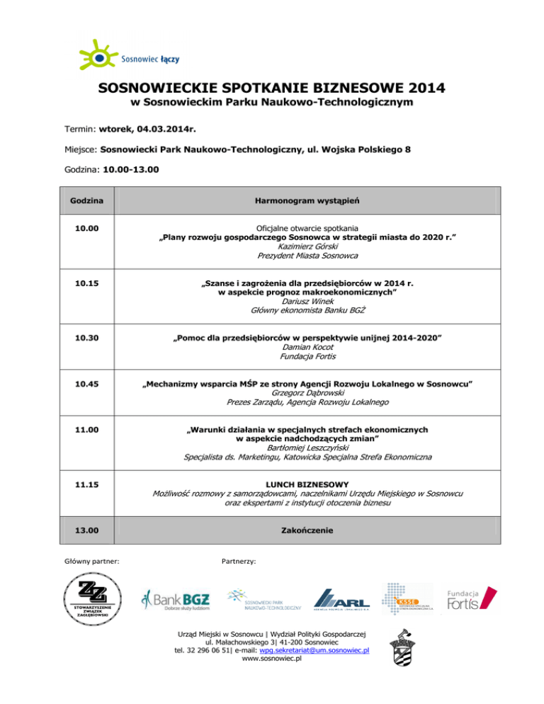 SOSNOWIECKIE SPOTKANIE BIZNESOWE 2014 w Sosnowieckim Parku Naukowo-Technologicznym Termin: wtorek, 04.03.2014r. Miejsce: Sosnowiecki Park Naukowo-Technologiczny, ul. Wojska Polskiego 8 Godzina: 10.00-13.00 Godzina Harmonogram wystąpień 10.00 Oficjalne otwarcie spotkania „Plany rozwoju gospodarczego Sosnowca w strategii miasta do 2020 r.” Kazimierz Górski Prezydent Miasta Sosnowca 10.15 „Szanse i zagroŜenia dla przedsiębiorców w 2014 r. w aspekcie prognoz makroekonomicznych” Dariusz Winek Główny ekonomista Banku BGś 10.30 „Pomoc dla przedsiębiorców w perspektywie unijnej 2014-2020” Damian Kocot Fundacja Fortis 10.45 „Mechanizmy wsparcia MŚP ze strony Agencji Rozwoju Lokalnego w Sosnowcu” Grzegorz Dąbrowski Prezes Zarządu, Agencja Rozwoju Lokalnego 11.00 „Warunki działania w specjalnych strefach ekonomicznych w aspekcie nadchodzących zmian” Bartłomiej Leszczyński Specjalista ds. Marketingu, Katowicka Specjalna Strefa Ekonomiczna 11.15 LUNCH BIZNESOWY MoŜliwość rozmowy z samorządowcami, naczelnikami Urzędu Miejskiego w Sosnowcu oraz ekspertami z instytucji otoczenia biznesu 13.00 Główny partner: Zakończenie Partnerzy: Urząd Miejski w Sosnowcu | Wydział Polityki Gospodarczej ul. Małachowskiego 3| 41-200 Sosnowiec tel. 32 296 06 51| e-mail: [email protected] www.sosnowiec.pl