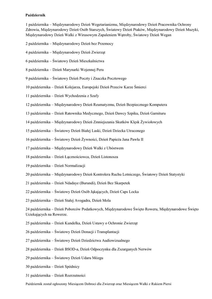 Październik 1 października – Międzynarodowy Dzień Wegetarianizmu, Międzynarodowy Dzień Pracownika Ochrony Zdrowia, Międzynarodowy Dzień Osób Starszych, Światowy Dzień Ptaków, Międzynarodowy Dzień Muzyki, Międzynarodowy Dzień Walki z Wirusowym Zapaleniem Wątroby, Światowy Dzień Wegan 2 października – Międzynarodowy Dzień bez Przemocy 4 października – Międzynarodowy Dzień Zwierząt 6 października – Światowy Dzień Mieszkalnictwa 8 października – Dzień Marynarki Wojennej Peru 9 października – Światowy Dzień Poczty i Znaczka Pocztowego 10 października – Dzień Kolejarza, Europejski Dzień Przeciw Karze Śmierci 11 października – Dzień Wychodzenia z Szafy 12 października – Międzynarodowy Dzień Reumatyzmu, Dzień Bezpiecznego Komputera 13 października – Dzień Ratownika Medycznego, Dzień Dawcy Szpiku, Dzień Garnituru 14 października – Międzynarodowy Dzień Zmniejszania Skutków Klęsk Żywiołowych 15 października – Światowy Dzień Białej Laski, Dzień Dziecka Utraconego 16 października – Światowy Dzień Żywności, Dzień Papieża Jana Pawła II 17 października – Międzynarodowy Dzień Walki z Ubóstwem 18 października – Dzień Łącznościowca, Dzień Listonosza 19 października – Dzień Normalizacji 20 października – Międzynarodowy Dzień Kontrolera Ruchu Lotniczego, Światowy Dzień Statystyki 21 października – Dzień Ndadaye (Burundi), Dzień Bez Skarpetek 22 października – Światowy Dzień Osób Jąkających, Dzień Caps Locka 23 października – Dzień Stałej Avogadra, Dzień Mola 24 października – Dzień Poborców Podatkowych, Międzynarodowe Święto Roweru, Międzynarodowe Święto Uciekających na Rowerze. 25 października – Dzień Kundelka, Dzień Ustawy o Ochronie Zwierząt 26 października – Światowy Dzień Donacji i Transplantacji 27 października – Światowy Dzień Dziedzictwa Audiowizualnego 28 października – Dzień BSOD-a, Dzień Odpoczynku dla Zszarganych Nerwów 29 października – Światowy Dzień Udaru Mózgu 30 października – Dzień Spódnicy 31 października – Dzień Rozrzutności Październik został ogłoszony Miesiącem Dobroci dla Zwierząt oraz Miesiącem Walki z Rakiem Piersi