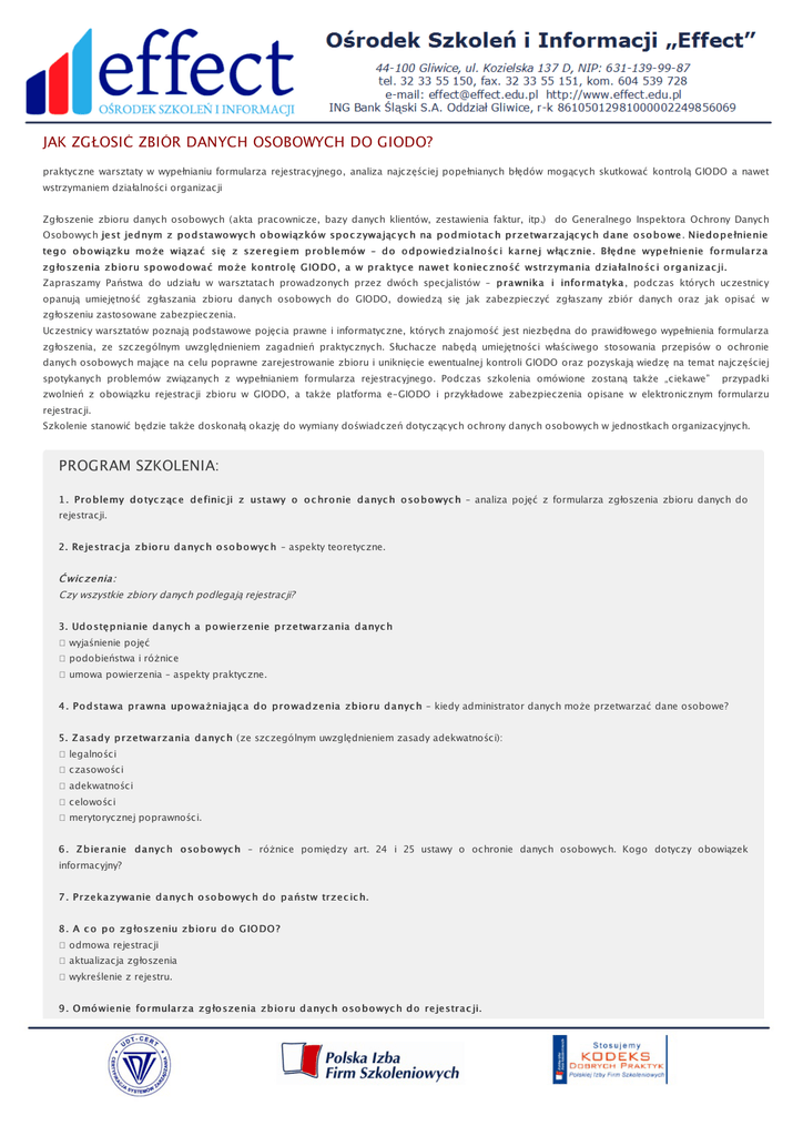 JAK ZGŁOSIĆ ZBIÓR DANYCH OSOBOWYCH DO GIODO? praktyczne warsztaty w wypełnianiu formularza rejestracyjnego, analiza najczęściej popełnianych błędów mogących skutkować kontrolą GIODO a nawet wstrzymaniem działalności organizacji Zgłoszenie zbioru danych osobowych (akta pracownicze, bazy danych klientów, zestawienia faktur, itp.) do Generalnego Inspektora Ochrony Danych Osobowych je st je d nym z p o d sta wo wyc h o b o wiązkó w sp o c zywa jąc yc h na p o d mio ta c h p rze twa rza jąc yc h d a ne o so b o we . N ie d o p e łnie nie te g o o b o wiązku mo że wiąza ć się z sze re g ie m p ro b le mó w d o o d p o wie d zia lno śc i ka rne j włąc znie . Błę d ne wyp e łnie nie fo rmula rza zg ło sze nia zb io ru sp o wo d o wa ć mo że ko ntro lę G IO DO , a w p ra ktyc e na we t ko nie c zno ść wstrzyma nia d zia ła lno śc i o rg a niza c ji. Zapraszamy Państwa do udziału w warsztatach prowadzonych przez dwóch specjalistów p ra wnika i info rma tyka , podczas których uczestnicy opanują umiejętność zgłaszania zbioru danych osobowych do GIODO, dowiedzą się jak zabezpieczyć zgłaszany zbiór danych oraz jak opisać w zgłoszeniu zastosowane zabezpieczenia. Uczestnicy warsztatów poznają podstawowe pojęcia prawne i informatyczne, których znajomość jest niezbędna do prawidłowego wypełnienia formularza zgłoszenia, ze szczególnym uwzględnieniem zagadnień praktycznych. Słuchacze nabędą umiejętności właściwego stosowania przepisów o ochronie danych osobowych mające na celu poprawne zarejestrowanie zbioru i uniknięcie ewentualnej kontroli GIODO oraz pozyskają wiedzę na temat najczęściej spotykanych problemów związanych z wypełnianiem formularza rejestracyjnego. Podczas szkolenia omówione zostaną także ciekawe przypadki zwolnień z obowiązku rejestracji zbioru w GIODO, a także platforma e-GIODO i przykładowe zabezpieczenia opisane w elektronicznym formularzu rejestracji. Szkolenie stanowić będzie także doskonałą okazję do wymiany doświadczeń dotyczących ochrony danych osobowych w jednostkach organizacyjnych. PROGRAM SZKOLENIA: 1 . P ro b le my d o tyc ząc e d e finic ji z usta wy o o c hro nie d a nyc h o so b o wyc h analiza pojęć z formularza zgłoszenia zbioru danych do rejestracji. 2. Re je stra c ja zb io ru d a nyc h o so b o wyc h aspekty teoretyczne. Ć wic ze nia : Czy wszystkie zbiory danych podlegają rejestracji? 3. Ud o stę p nia nie d a nyc h a p o wie rze nie p rze twa rza nia d a nyc h wyjaśnienie pojęć podobieństwa i różnice umowa powierzenia aspekty praktyczne. 4 . P o d sta wa p ra wna up o wa żnia jąc a d o p ro wa d ze nia zb io ru d a nyc h - kiedy administrator danych może przetwarzać dane osobowe? 5. Z a sa d y p rze twa rza nia d a nyc h (ze szczególnym uwzględnieniem zasady adekwatności): legalności czasowości adekwatności celowości merytorycznej poprawności. 6 . Z b ie ra nie d a nyc h o so b o wyc h różnice pomiędzy art. 24 i 25 ustawy o ochronie danych osobowych. Kogo dotyczy obowiązek informacyjny? 7 . P rze ka zywa nie d a nyc h o so b o wyc h d o p a ństw trze c ic h. 8 . A c o p o zg ło sze niu zb io ru d o G IO DO ? odmowa rejestracji aktualizacja zgłoszenia wykreślenie z rejestru. 9 . O mó wie nie fo rmula rza zg ło sze nia zb io ru d a nyc h o so b o wyc h d o re je stra c ji. 1 0 . Ja k uniknąć o d mo wy re je stra c ji zb io ru i wynika jąc e j z te g o ko nie c zno śc i wstrzyma nia d zia ła lno śc i firmy? Podstawowe błędy popełniane przy zgłaszaniu zbioru. 1 1 . Ja ko o p isa ć w zg ło sze niu sto so wa ne za b e zp ie c ze nia te c hnic zne i o rg a niza c yjne ? Omówienie zabezpieczeń, do których stosowania jesteśmy zobowiązani przez rozporządzenie wykonawcze do ustawy oraz sposobu ich opisywania w zgłoszeniu zbioru. 1 2. Inte rne to wy syste m re je stra c ji zb io ró w d a nyc h - e - G IO DO . W jaki sposób przyśpieszyć rejestrację zbioru i jak ułatwić sobie wypełnianie formularza? Ć wic ze nia : Wypełnianie formularza zgłoszenia przykładowego zbioru danych. 1 3. P o d sumo wa nie , d yskusja . 1 4 . Ind ywid ua lne ko nsulta c je z wykła d o wc ą. METODY PROWADZENIA WARSZTATÓW: Warsztaty będą prowadzone systemem interaktywnym, tj. metodą aktywnego uczestnictwa słuchaczy w zajęciach, połączonym z warsztatami. wykład interaktywny prezentacja multimedialna studia przypadków (case study) ćwiczenia indywidualne i grupowe dyskusje moderowane konsultacje indywidualne Szkolenie stanowi wykład połączony z pytaniami zadawanymi na bieżąco. Przewidywana część problemowa zajęć oparta jest na dyskusji uczestników i prowadzącego oraz wymianie doświadczeń wynikających z codziennej praktyki związanej z przetwarzaniem danych osobowych. W trakcie godzin szkolenia jest możliwość indywidualnych konsultacji z ekspertami. Szkolenie stanowi wykład połączony z pytaniami zadawanymi na bieżąco. Ponieważ jest ono adresowane jest do osób zaawansowanych w tematyce ochrony danych osobowych, proponowane ćwiczenia indywidualne i grupowe bazują na posiadanej już wiedzy uczestników. Przewidywana część problemowa zajęć oparta jest na dyskusji uczestników i prowadzącego oraz wymianie doświadczeń wynikających z codziennej praktyki związanej z przetwarzaniem danych osobowych. W trakcie godzin szkolenia jest możliwość indywidualnych konsultacji z ekspertem. SZKOLENIE ADRESOWANE JEST DO: Osób zajmujących się problematyką ochrony danych osobowych, w tym: właścicieli przedsiębiorstw i kadry kierowniczej osób przygotowujących się do zajmowania funkcji Administratora bezpieczeństwa informacji osób pełniących funkcję Administratora bezpieczeństwa informacji osób zainteresowanych tematyką ochrony danych osobowych WYKŁADOWCAMI NA SZKOLENIU BĘDĄ: Ma g d a le na K o rg a Specjalista w zakresie ochrony danych osobowych, prawa cywilnego i gospodarczego. Absolwentka Wydz