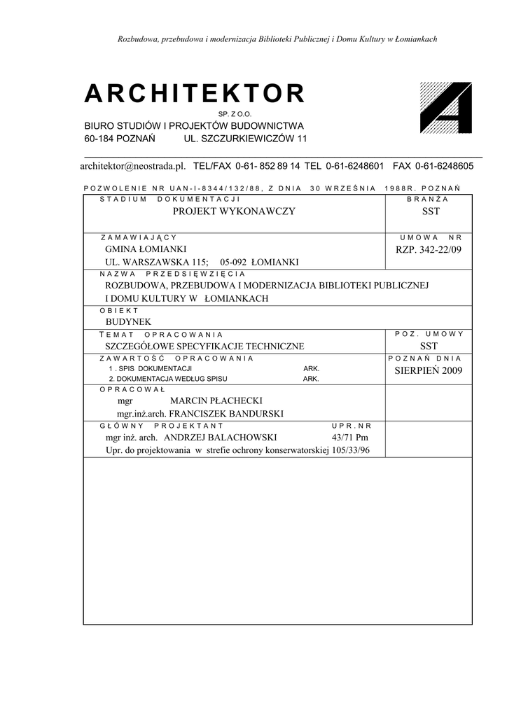 Rozbudowa, przebudowa i modernizacja Biblioteki Publicznej i Domu Kultury w Łomiankach ARCHITEKTOR SP. Z O.O. BIURO STUDIÓW I PROJEKTÓW BUDOWNICTWA 60-184 POZNAŃ UL. SZCZURKIEWICZÓW 11 ______________________________________________________________________ [email protected]. TEL/FAX 0-61- 852 89 14 TEL 0-61-6248601 FAX 0-61-6248605 POZWOLENIE NR UAN-I-8344/132/88, Z DNIA STADIUM 30 WRZEŚNIA 1988R. POZNAŃ BRANśA DOKUMENTACJI PROJEKT WYKONAWCZY SST ZAMAWIAJĄCY GMINA ŁOMIANKI UL. WARSZAWSKA 115; NAZWA UMOWA NR RZP. 342-22/09 05-092 ŁOMIANKI PRZEDSIĘWZIĘCIA ROZBUDOWA, PRZEBUDOWA I MODERNIZACJA BIBLIOTEKI PUBLICZNEJ I DOMU KULTURY W ŁOMIANKACH OBIEKT BUDYNEK TEMAT POZ. OPRACOWANIA SST SZCZEGÓŁOWE SPECYFIKACJE TECHNICZNE ZAWARTOŚĆ OPRACOWANIA 1 . SPIS DOKUMENTACJI 2. DOKUMENTACJA WEDŁUG SPISU POZNAŃ ARK. ARK. mgr MARCIN PŁACHECKI mgr.inŜ.arch. FRANCISZEK BANDURSKI PROJEKTANT DNIA SIERPIEŃ 2009 OPRACOWAŁ GŁÓWNY UMOWY UPR.NR mgr inŜ. arch. ANDRZEJ BALACHOWSKI 43/71 Pm Upr. do projektowania w strefie ochrony konserwatorskiej 105/33/96 Rozbudowa, przebudowa i modernizacja Biblioteki Publicznej i Domu Kultury w Łomiankach ARCHITEKTOR SP. Z O.O. BIURO STUDIÓW I PROJEKTÓW BUDOWNICTWA 60-184 POZNAŃ UL. SZCZURKIEWICZÓW 11 ______________________________________________________________________ [email protected]. TEL/FAX 0-61- 852 89 14 TEL 0-61-6248601 FAX 0-61-6248605 UWAGA A) W obliczeniach i załoŜeniach projektowych przyjęto parametry techniczne urządzeń i materiałów, określonych, konkretnych producentów. Ewentualne zastosowanie przez wykonawcę robót, innych urządzeń i materiałów jest moŜliwe pod warunkiem, Ŝe zaproponowane inne urządzenia i materiały: 1) Charakteryzują się parametrami technicznymi nie gorszymi, niŜ urządzenia i materiały przyjęte w projekcie. 2) Uzyskują aprobatę Inwestora i BSPB Architektor – Poznań. 3) Nie wpłyną na zwiększenie kosztów realizacji inwestycji. B) Cenę ofertową naleŜy skalkulować w oparciu o przedmiar robót, dokumentację projektową, specyfikację techniczną wykonania i odbioru robót budowlanych oraz uwagi zawarte w niniejszej Specyfikacji Istotnych Warunków Zamówienia. Cena ofertowa winna uwzględniać wszystkie czynniki cenotwórcze, w tym podatki, stosowne opłaty, narzuty oraz koszty związane z dostawą wody i energii elektrycznej. Podstawą przygotowania oferty przetargowej, w tym równieŜ kosztorysu ofertowego stanowią łącznie: dokumentacja projektowa, przedmiary robót, specyfikacje techniczne wykonania i odbiory robót, specyfikacja istotnych warunków zamówienia. Przy opracowaniu oferty przetargowej wszystkie wymienione dokumenty naleŜy brać pod uwagę łącznie. W przypadku ewentualnych niezgodności niektórych zapisów w przedmiarach z projektami budowlanymi i specyfikacjami technicznymi naleŜy w kosztorysie ofertowym wprowadzić następujące zmiany wg uznania Wykonawcy: dopisać dodatkową pozycję, w przypadku pominięcia jakiegoś elementu, wprowadzić korektę ilości obmiarowej w przypadku nieprawidłowej wg Wykonawcy ilości, zmienić podstawę wyceny wg uznania Wykonawcy. 2 Rozbudowa, przebudowa i modernizacja Biblioteki Publicznej i Domu Kultury w Łomiankach SZCZEGÓŁOWE SPECYFIKACJE TECHNICZNE SPIS TREŚCI WYMAGANIA OGÓLNE................................................................................................................ 4 451. PRACE PRZYGOTOWAWCZE .......................................................................................... 16 451-1 GEODEZYJNE WYTYCZENIE OBIEKTU .................................................................................... 16 451-2 ROBOTY ZIEMNE ................................................................................................................... 19 452. ROBOTY ZWIĄZANE Z WYKONANIEM KONSTRUKCJI OBIEKTU ...................... 24 452-1 KONSTRUKCJE BETONOWE I śELBETOWE MONOLITYCZNE .................................................... 24 452-2 KONSTRUKCJE BETONOWE Z ELEMENTÓW PREFABRYKOWANYCH ........................................ 37 452-3 KONSTRUKCJE DREWNIANE .................................................................................................. 44 452-4 KONSTRUKCJE STALOWE ORAZ STAL ZBROJENIOWA............................................................. 47 452-5 ROBOTY MURARSKIE ............................................................................................................ 56 452-6 IZOLACJE .............................................................................................................................. 63 452-7 WYKONANIE POKRYCIA DACHOWEGO .................................................................................. 78 452-8 WYKONANIE OBRÓBEK BLACHARSKICH ............................................................................... 82 453. ROBOTY INSTALACYJNE.................................................................................................. 86 453-1 ROBOTY INSTALACYJNE ELEKTRYCZNE ................................................................................ 86 I. Wymagania ogólne................................................................................................................. 86 II. Roboty instalacyjne elektryczne............................................................................................ 95 III. Roboty instalacyjne teletechniczne.................................................................................... 103 453-2 INSTALACJA WODNO-KANALIZACYJNA ............................................................................... 119 453-3 INSTALACJE CENTRALNEGO OGRZEWANIA ......................................................................... 131 453-4 PRZYŁĄCZE KANALIZACJI SANITARNEJ, DESZCZOWEJ I WODOCIĄGOWE ............................. 139 453-5 WENTYLACJA MECHANICZNA ............................................................................................. 156 453-6 INSTALOWANIE WINDY .