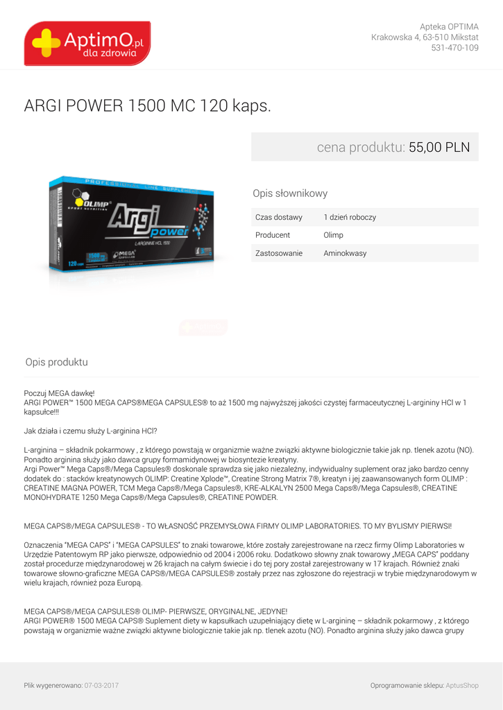 Apteka OPTIMA Krakowska 4, 63-510 Mikstat 531-470-109 ARGI POWER 1500 MC 120 kaps. cena produktu: 55,00 PLN Opis słownikowy Czas dostawy 1 dzień roboczy Producent Olimp Zastosowanie Aminokwasy Opis produktu Poczuj MEGA dawkę! ARGI POWER™ 1500 MEGA CAPS®MEGA CAPSULES® to aż 1500 mg najwyższej jakości czystej farmaceutycznej L-argininy HCl w 1 kapsułce!!! Jak działa i czemu służy L-arginina HCl? L-arginina – składnik pokarmowy , z którego powstają w organizmie ważne związki aktywne biologicznie takie jak np. tlenek azotu (NO). Ponadto arginina służy jako dawca grupy formamidynowej w biosyntezie kreatyny. Argi Power™ Mega Caps®/Mega Capsules® doskonale sprawdza się jako niezależny, indywidualny suplement oraz jako bardzo cenny dodatek do : stacków kreatynowych OLIMP: Creatine Xplode™, Creatine Strong Matrix 7®, kreatyn i jej zaawansowanych form OLIMP : CREATINE MAGNA POWER, TCM Mega Caps®/Mega Capsules®, KRE-ALKALYN 2500 Mega Caps®/Mega Capsules®, CREATINE MONOHYDRATE 1250 Mega Caps®/Mega Capsules®, CREATINE POWDER. MEGA CAPS®/MEGA CAPSULES® - TO WŁASNOŚĆ PRZEMYSŁOWA FIRMY OLIMP LABORATORIES. TO MY BYLISMY PIERWSI! Oznaczenia “MEGA CAPS” i “MEGA CAPSULES” to znaki towarowe, które zostały zarejestrowane na rzecz firmy Olimp Laboratories w Urzędzie Patentowym RP jako pierwsze, odpowiednio od 2004 i 2006 roku. Dodatkowo słowny znak towarowy „MEGA CAPS” poddany został procedurze międzynarodowej w 26 krajach na całym świecie i do tej pory został zarejestrowany w 17 krajach. Również znaki towarowe słowno-graficzne MEGA CAPS®/MEGA CAPSULES® zostały przez nas zgłoszone do rejestracji w trybie międzynarodowym w wielu krajach, również poza Europą. MEGA CAPS®/MEGA CAPSULES® OLIMP- PIERWSZE, ORYGINALNE, JEDYNE! ARGI POWER® 1500 MEGA CAPS® Suplement diety w kapsułkach uzupełniający dietę w L-argininę – składnik pokarmowy , z którego powstają w organizmie ważne związki aktywne biologicznie takie jak np. tlenek azotu (NO). Ponadto arginina służy jako dawca grupy Plik wygenerowano: 07-03-2017 Oprogramowanie sklepu: AptusShop Apteka OPTIMA Krakowska 4, 63-510 Mikstat 531-470-109 formamidynowej w biosyntezie kreatyny. Preparat przeznaczony dla osób ćwiczących rekreacyjnie, sportowców wyczynowych oraz mężczyzn dążących do utrzymania sprawności seksualnej. Zalecana dzienna porcja: przy wysiłku fizycznym – 1 – 2 kapsułki przed i po treningu; dla osób chcących utrzymać sprawność seksualną – 1 kapsułka jednorazowo na ok. 30 min. przed przewidywanym zbliżeniem płciowym. Nie należy przekraczać zalecanej dziennej porcji do spożycia w ciągu dnia. Suplement diety nie może być stosowany jako substytut zróżnicowanej diety. Zalecany jest zrównoważony sposób żywienia i zdrowy tryb życia. chlorowodorek L-argininy, celuloza mikrokrystaliczna – substancja wypełniająca, stearynian magnezu – substancja przeciwzbrylająca, kapsułka (żelatyna – składnik otoczki, barwnik: E 171) Informacja żywieniowa 1 kapsułka 4 kapsułki na 100 g Wartość energetyczna 0,68 kcal/ 2,84 kJ 2,72 kcal/ 11,37 kJ 40,72 kcal/ 170,2 kJ Białko 0,17g 0,68g 10,18g Węglowodany 0 g 0 g 0 g Tłuszcz 0 g 0 g 0 g Błonnik pokarmowy 0 g 0 g 0 g Sód 0 g 0 g 0 g L-arginina HCl 1500 mg 6000 mg 89,8 g Plik wygenerowano: 07-03-2017 Powered by TCPDF (www.tcpdf.org) Oprogramowanie sklepu: AptusShop