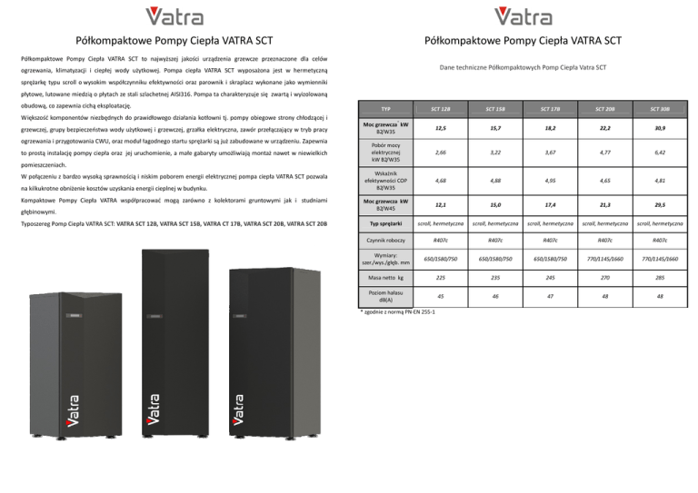 Półkompaktowe Pompy Ciepła VATRA SCT Półkompaktowe Pompy Ciepła VATRA SCT Półkompaktowe Pompy Ciepła VATRA SCT to najwyższej jakości urządzenia grzewcze przeznaczone dla celów Dane techniczne Półkompaktowych Pomp Ciepła Vatra SCT ogrzewania, klimatyzacji i ciepłej wody użytkowej. Pompa ciepła VATRA SCT wyposażona jest w hermetyczną sprężarkę typu scroll o wysokim współczynniku efektywności oraz parownik i skraplacz wykonane jako wymienniki płytowe, lutowane miedzią o płytach ze stali szlachetnej AISI316. Pompa ta charakteryzuje się zwartą i wyizolowaną obudową, co zapewnia cichą eksploatację. Większość komponentów niezbędnych do prawidłowego działania kotłowni tj. pompy obiegowe strony chłodzącej i grzewczej, grupy bezpieczeństwa wody użytkowej i grzewczej, grzałka elektryczna, zawór przełączający w tryb pracy ogrzewania i przygotowania CWU, oraz moduł łagodnego startu sprężarki są już zabudowane w urządzeniu. Zapewnia to prostą instalację pompy ciepła oraz jej uruchomienie, a małe gabaryty umożliwiają montaż nawet w niewielkich pomieszczeniach. W połączeniu z bardzo wysoką sprawnością i niskim poborem energii elektrycznej pompa ciepła VATRA SCT pozwala na kilkukrotne obniżenie kosztów uzyskania energii cieplnej w budynku. Kompaktowe Pompy Ciepła VATRA współpracować mogą zarówno z kolektorami gruntowymi jak i studniami głębinowymi. Typoszereg Pomp Ciepła VATRA SCT: VATRA SCT 12B, VATRA SCT 15B, VATRA CT 17B, VATRA SCT 20B, VATRA SCT 20B TYP SCT 12B SCT 15B SCT 17B SCT 20B SCT 30B Moc grzewcza kW B2/W35 12,5 15,7 18,2 22,2 30,9 Pobór mocy elektrycznej kW B2/W35 2,66 3,22 3,67 4,77 6,42 Wskaźnik efektywności COP B2/W35 4,68 4,88 4,95 4,65 4,81 Moc grzewcza kW B2/W45 12,1 15,0 17,4 21,3 29,5 Typ sprężarki scroll, hermetyczna scroll, hermetyczna scroll, hermetyczna scroll, hermetyczna scroll, hermetyczna Czynnik roboczy R407c R407c R407c R407c R407c Wymiary: szer./wys./głęb. mm 650/1580/750 650/1580/750 650/1580/750 770/1145/1660 770/1145/1660 Masa netto kg 225 235 245 270 285 Poziom hałasu dB(A) 45 46 47 48 48 * * zgodnie z normą PN-EN 255-1